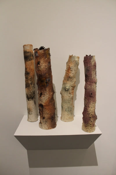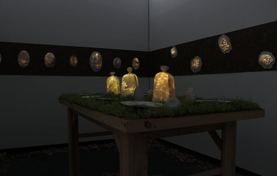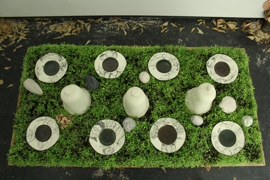 My work seeks to break down separations. In this space, the materials do not lay silent. Trees, like our ancestors, are the subjects of portraiture. Old growth forests can be nurtured and tended to with the same circumspection that some apply to the domesticated sphere of the family garden. The table marks the intersection of many levels of use of the natural world, and for this reason also offers an opportunity to re-tell the story of our relationship with the materials we build our lives out of— to burst the bubble of domesticity. Thus the formal, human sphere of the dining room is infiltrated with the unruly detritus of the natural world.