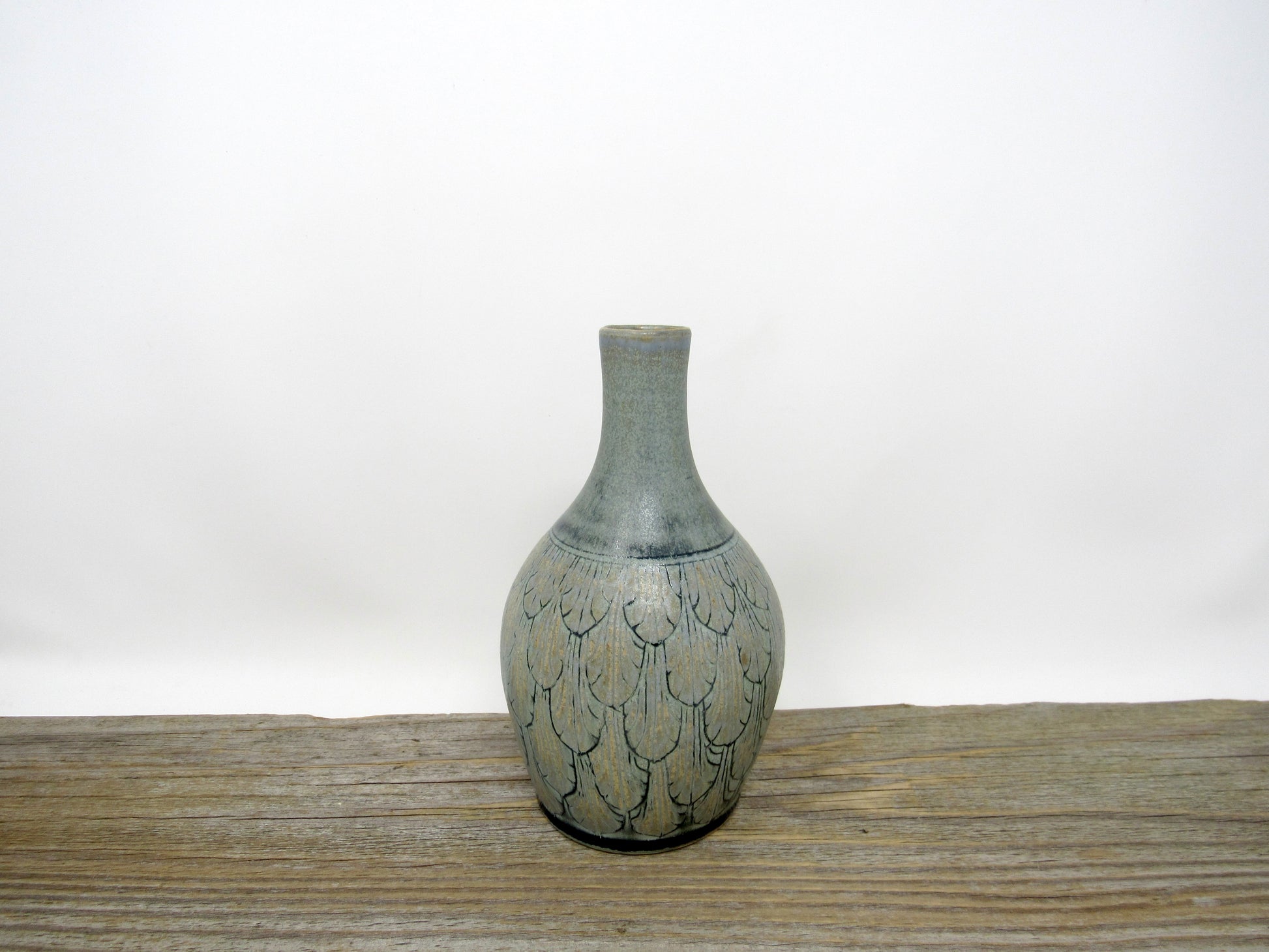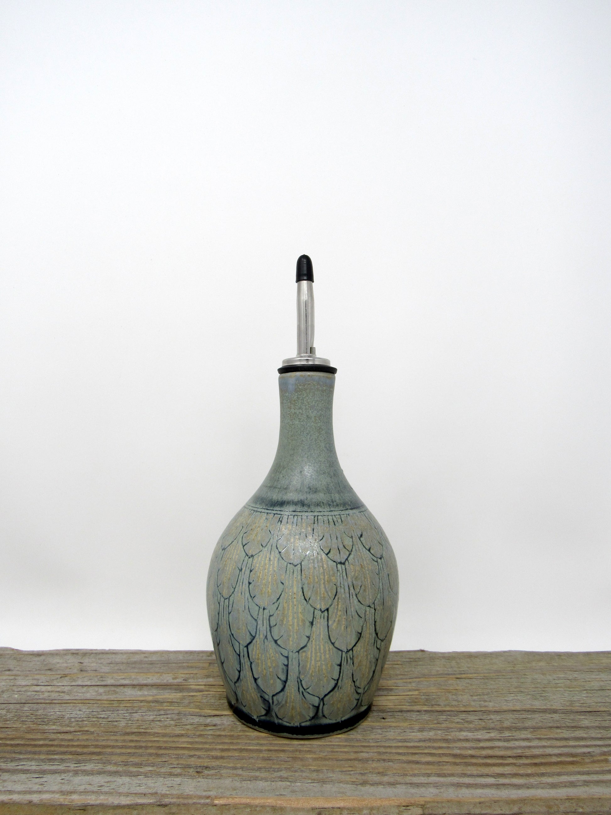 This multi-purpose bottle was hand thrown on the potter's wheel out of stoneware clay. Decorated with a hand carved geometric Art Deco Arches design, it is glazed in a food safe Blue-gray glaze.