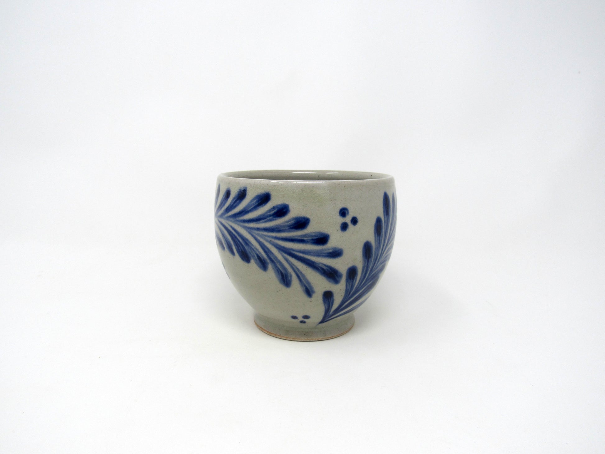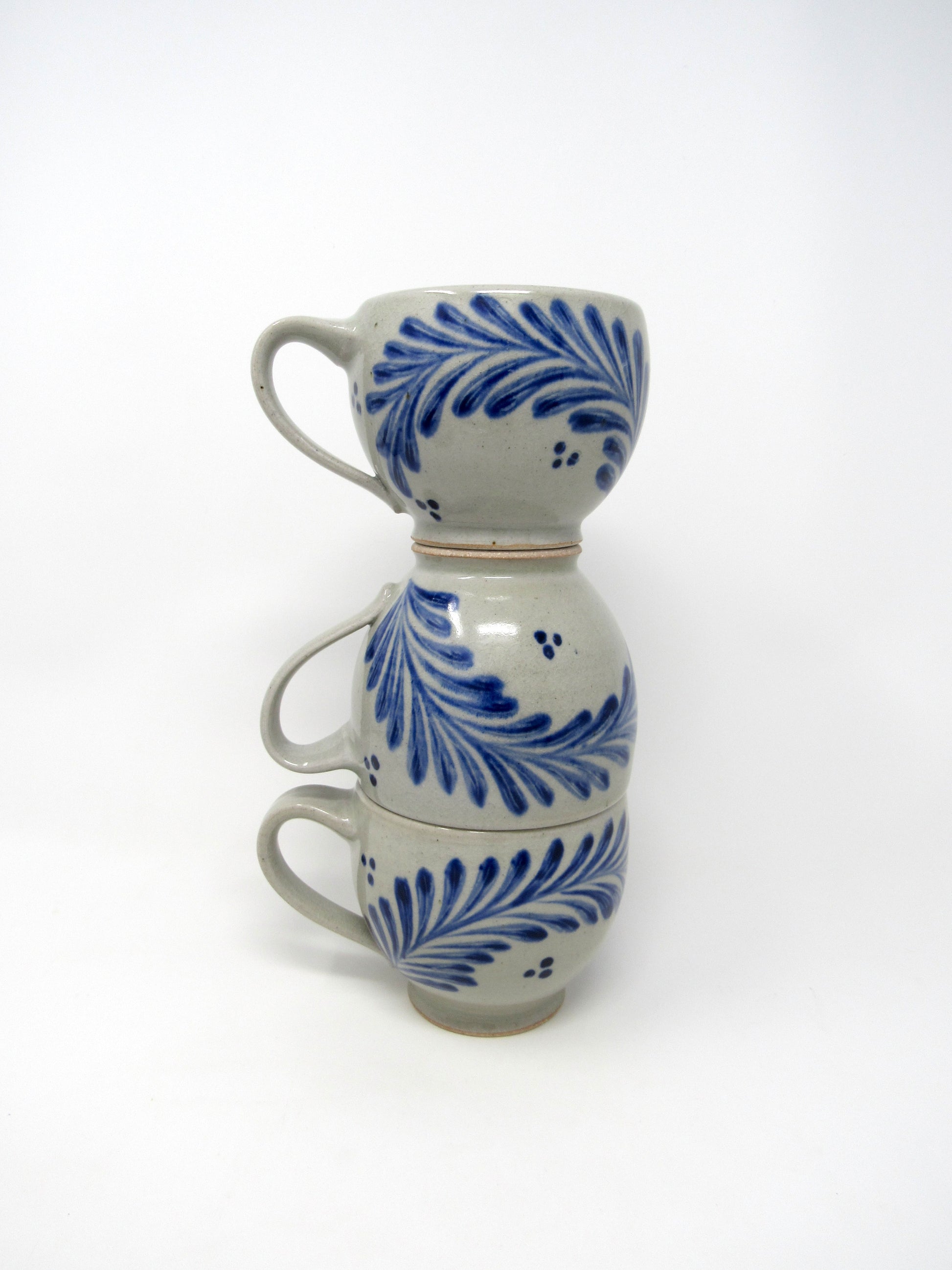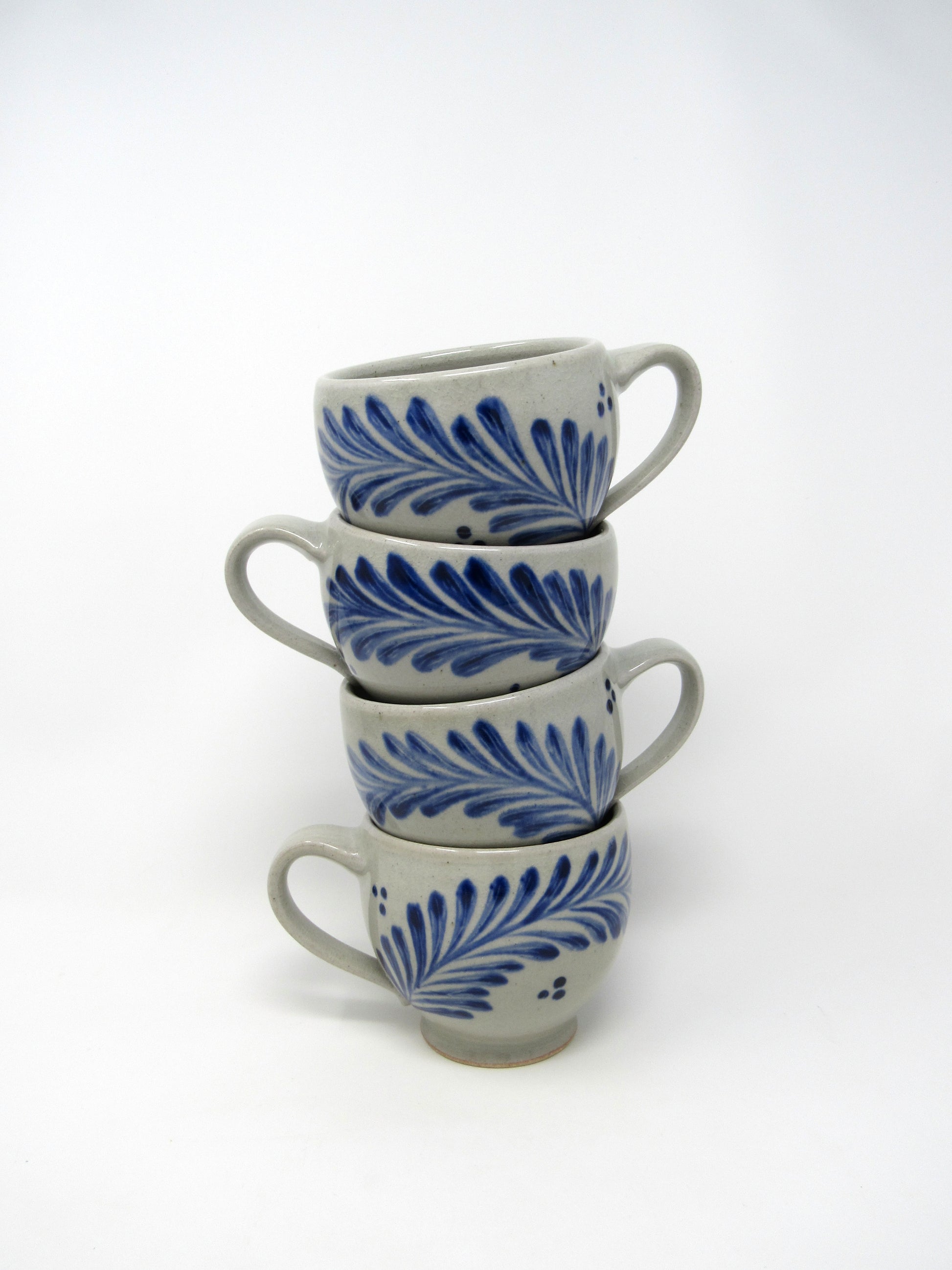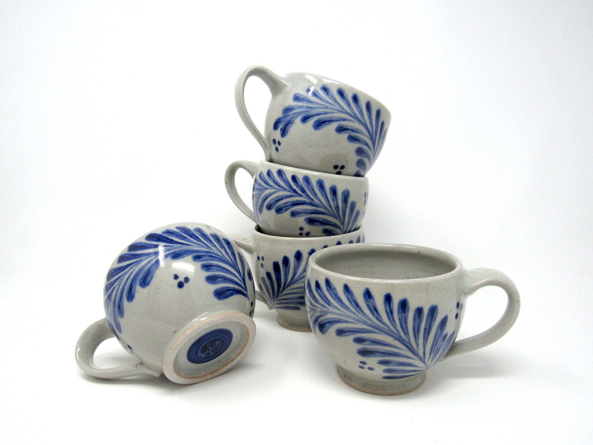 These mugs were hand thrown on the potter's wheel out of stoneware clay. Decorated with a hand-painted design of graceful twining vines in blue underglaze, they are glazed in a food-safe clear celadon glaze. Dishwasher and microwave safe. These unique mugs are perfect for your morning latte, coffee, or tea.