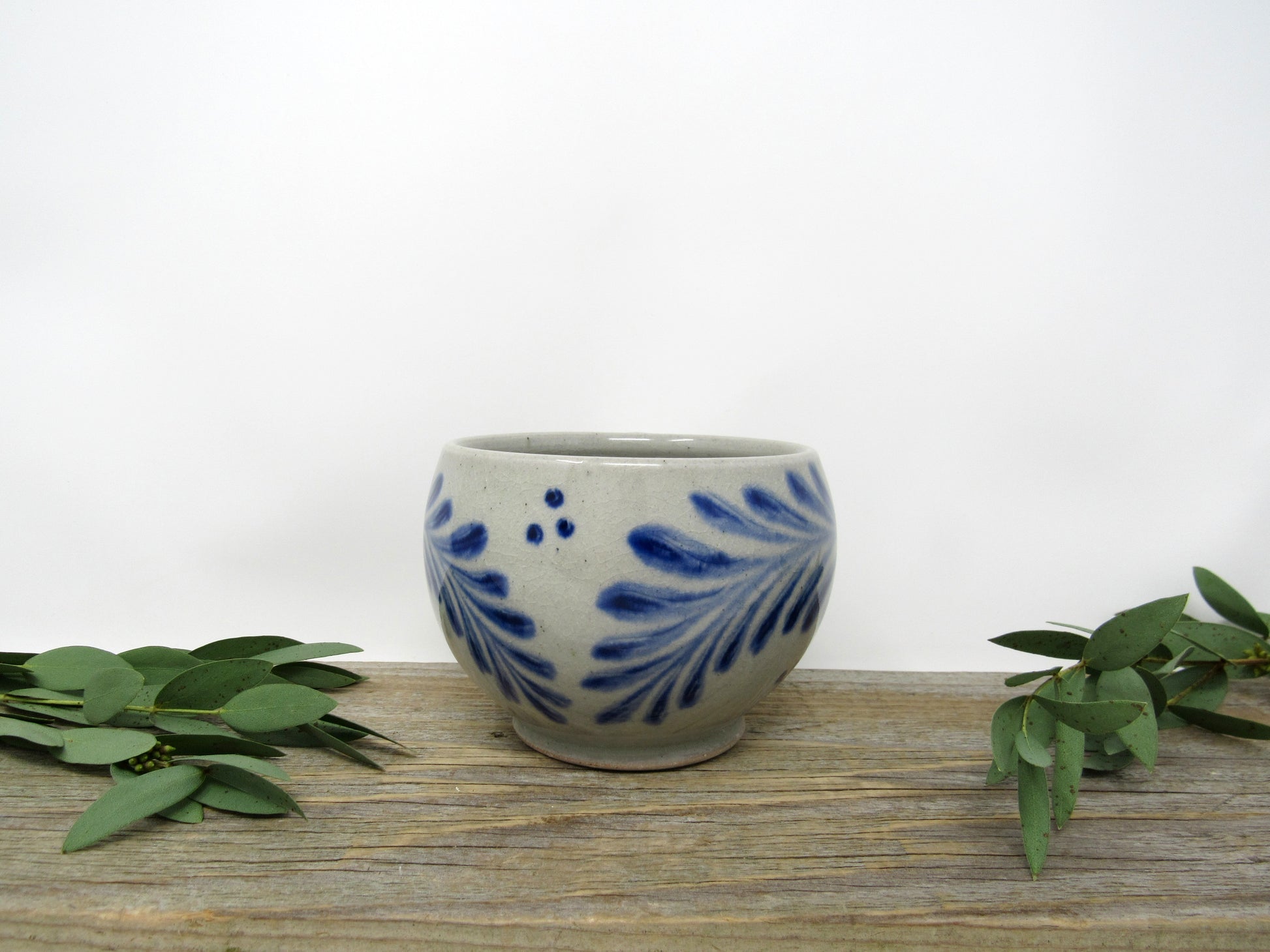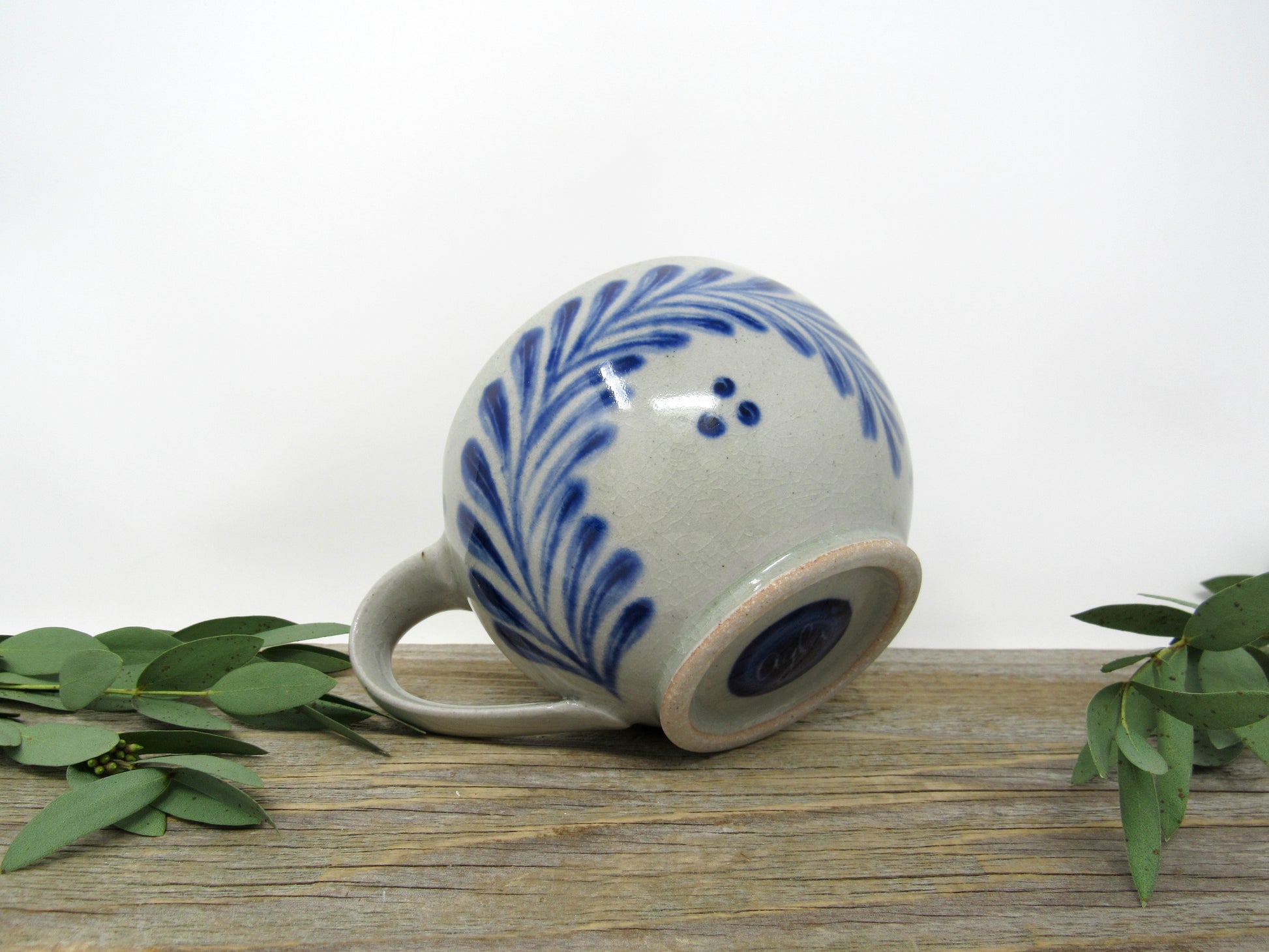 These mugs were hand thrown on the potter's wheel out of stoneware clay. Decorated with a hand-painted design of graceful twining vines in blue underglaze, they are glazed in a food-safe clear celadon glaze. Dishwasher and microwave safe. These unique mugs are perfect for your morning latte, coffee, or tea.