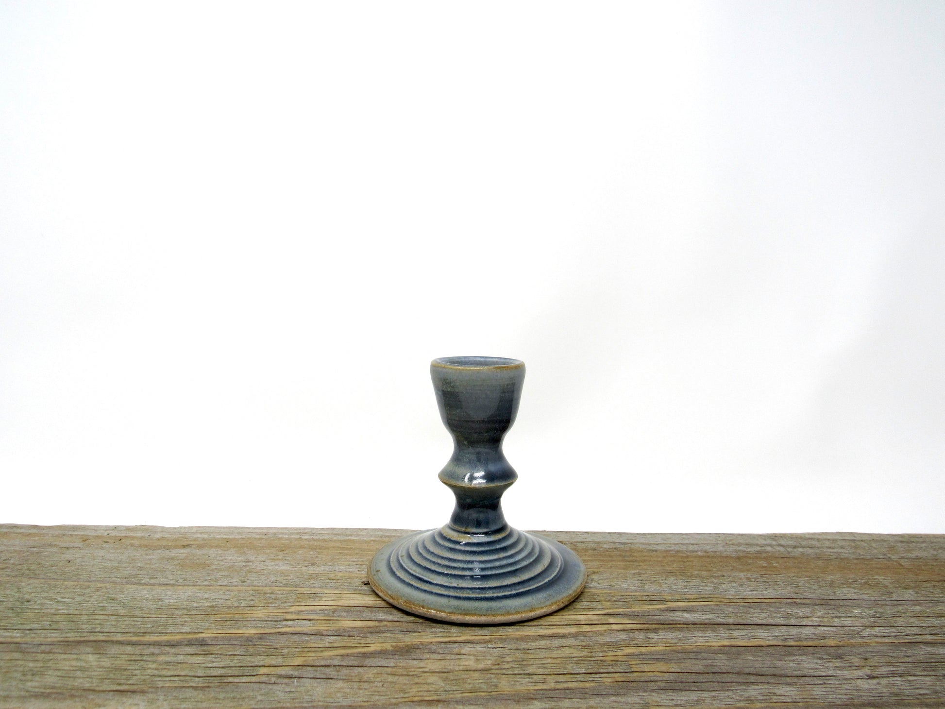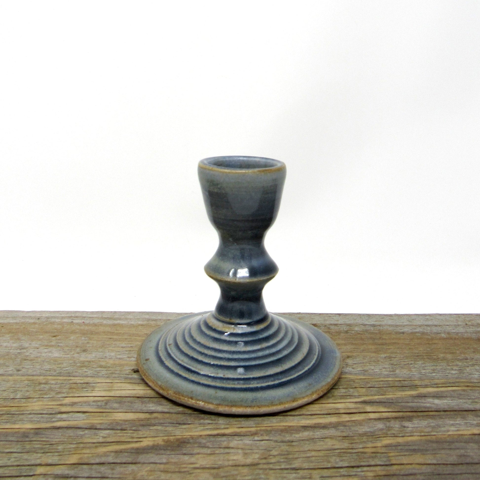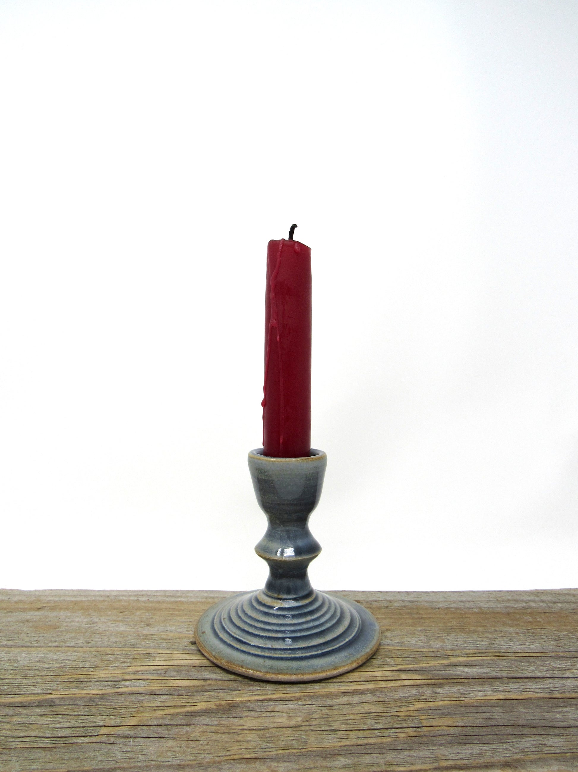 This candlestick form was wheel thrown out of stoneware clay. It holds most standard sized taper candles, and is glazed in my Blue Gray glaze.