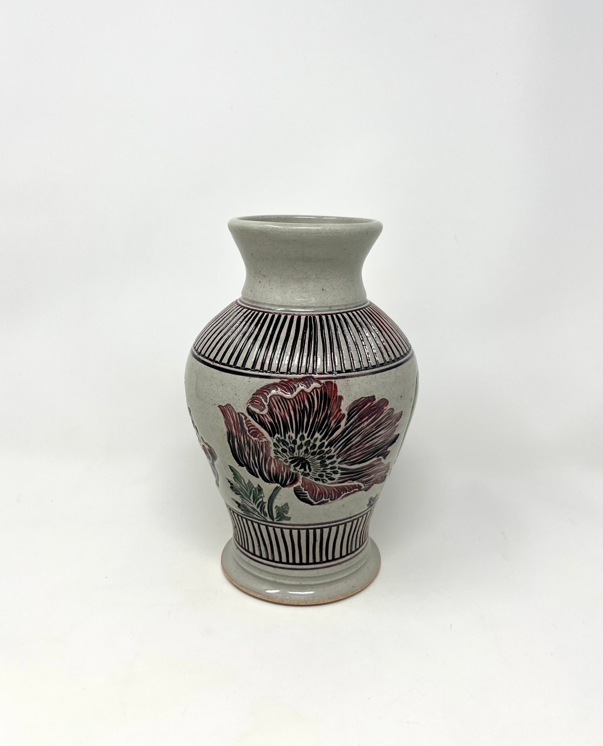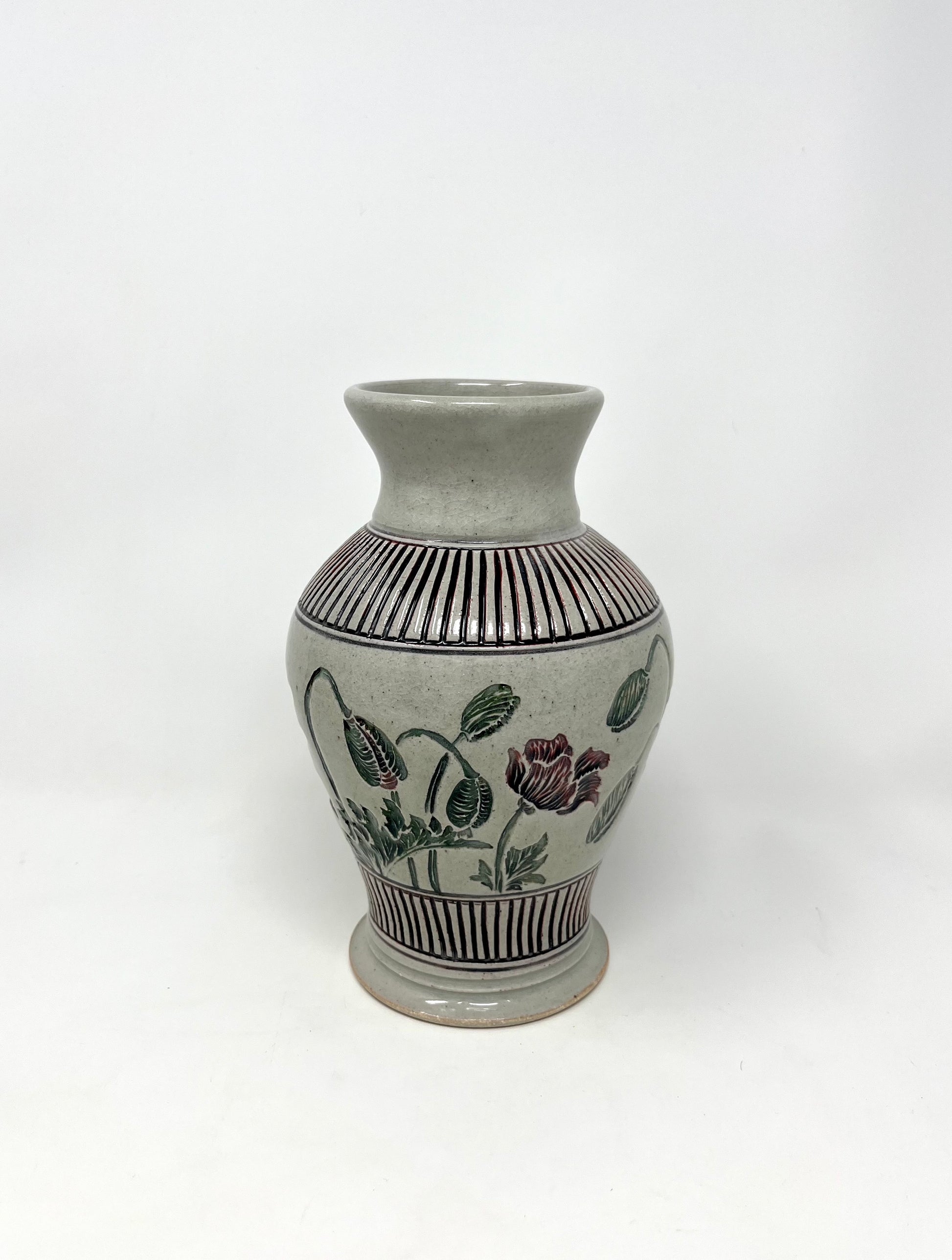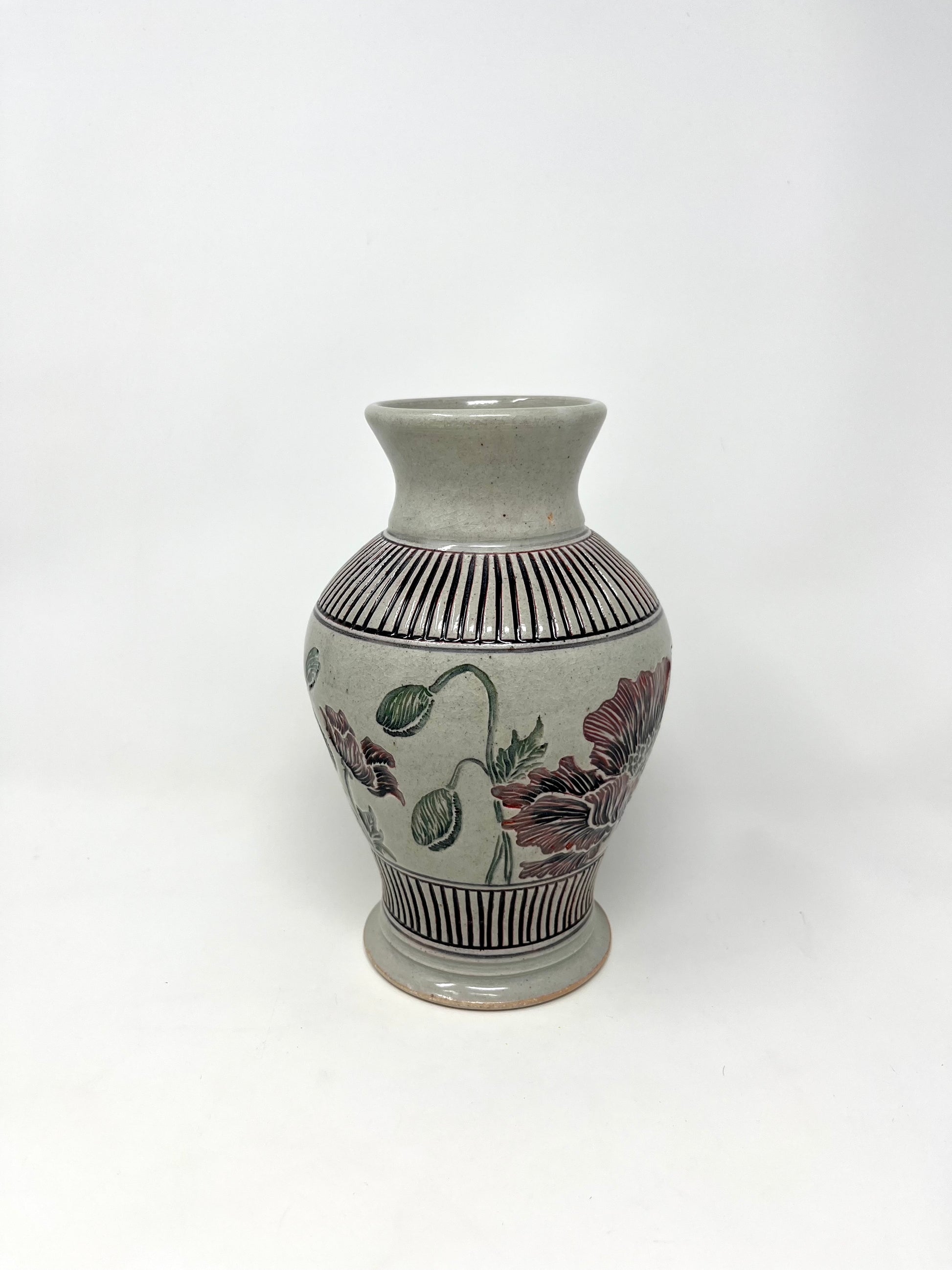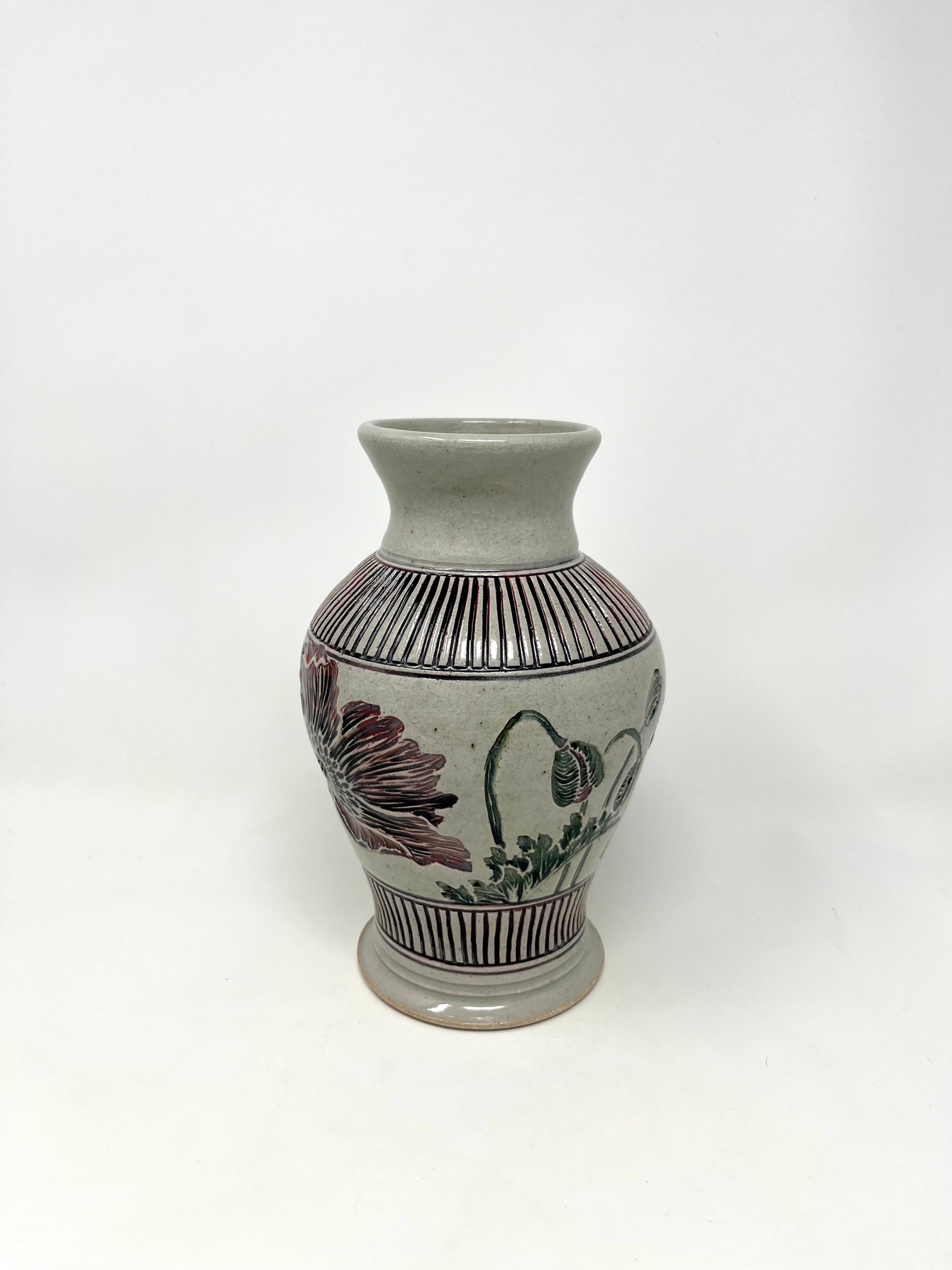 Hand thrown on the potter's wheel and decorated with a hand carved and inlaid design of poppy flowers, leaves, buds, and seed pods, the clear celadon glaze highlights the lovely variegated gray of the clay body. Bring the wildness and beauty of a summer wildflower patch into your home with this vase.