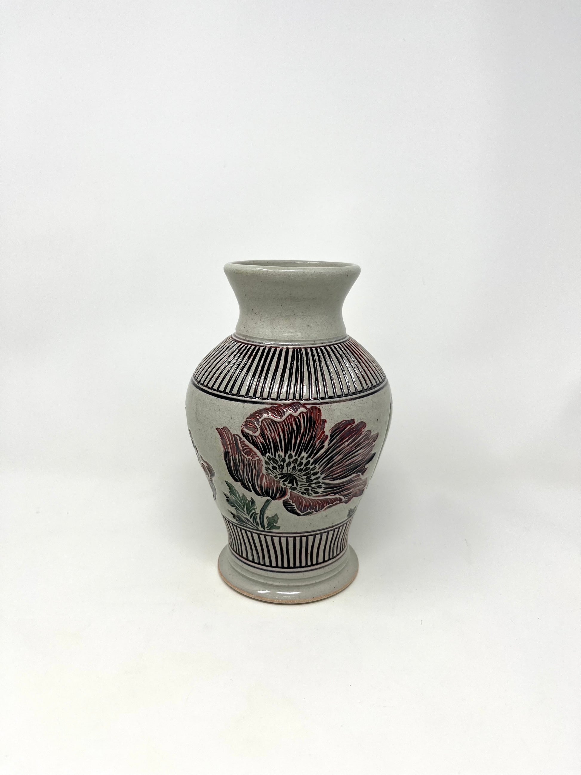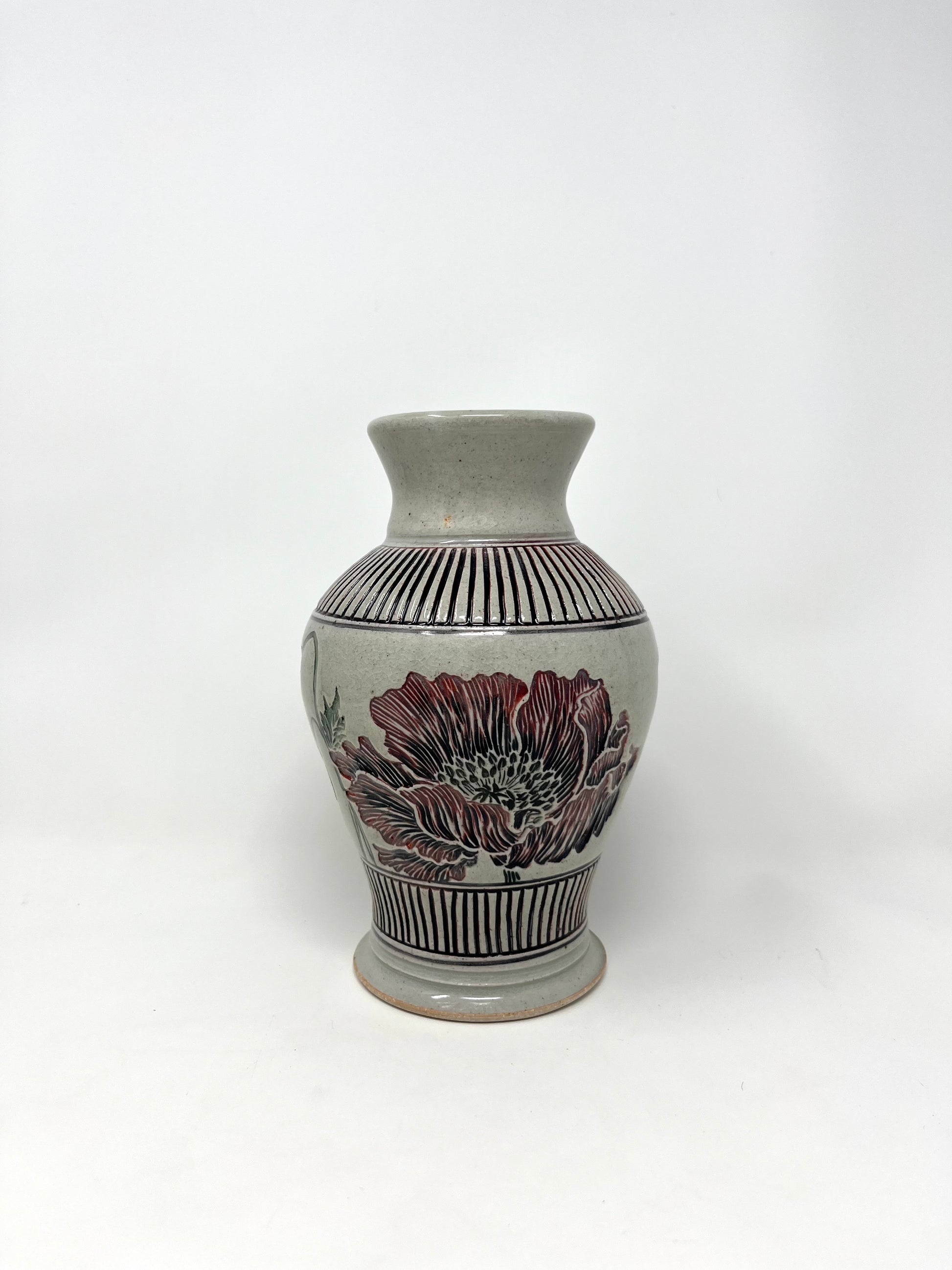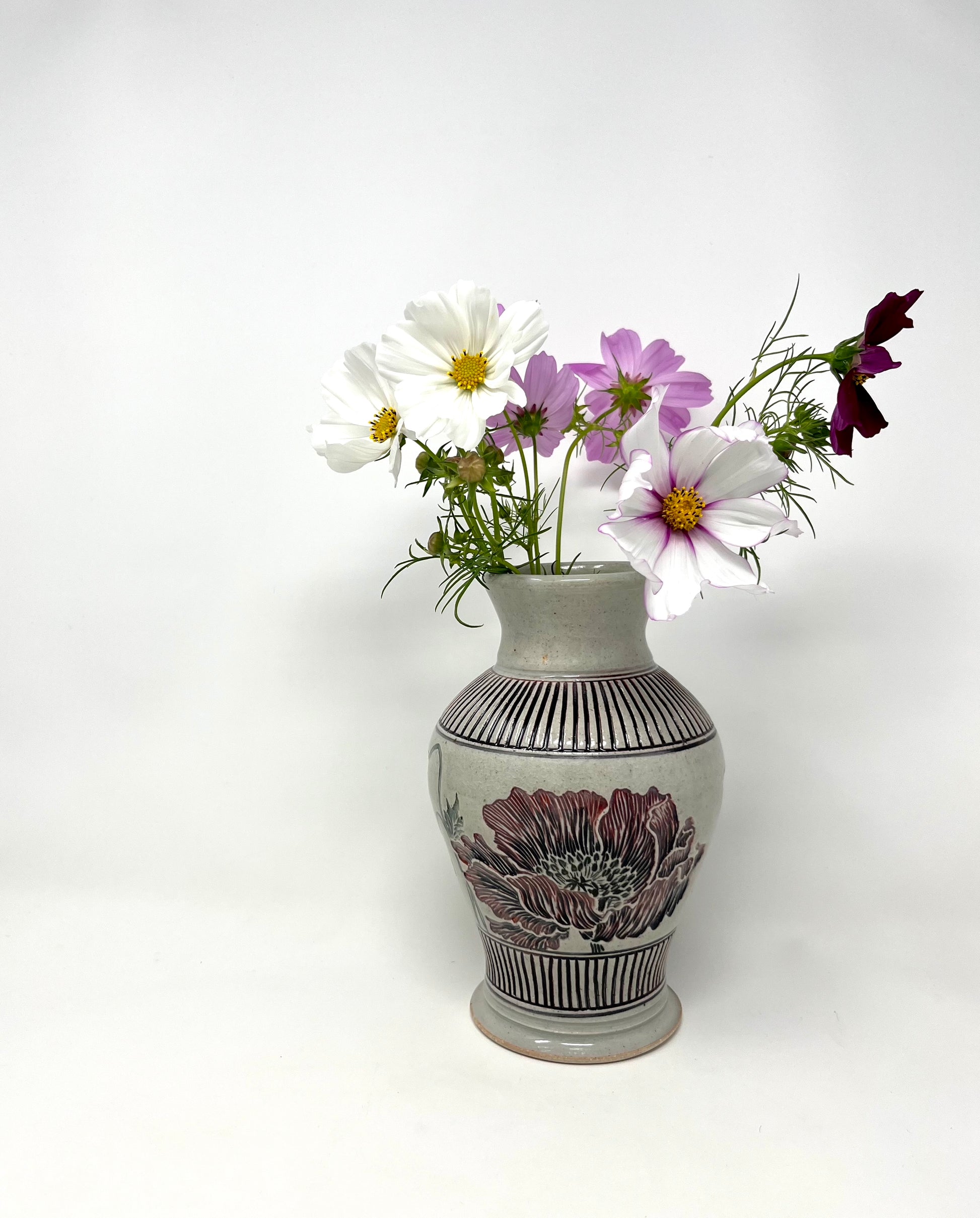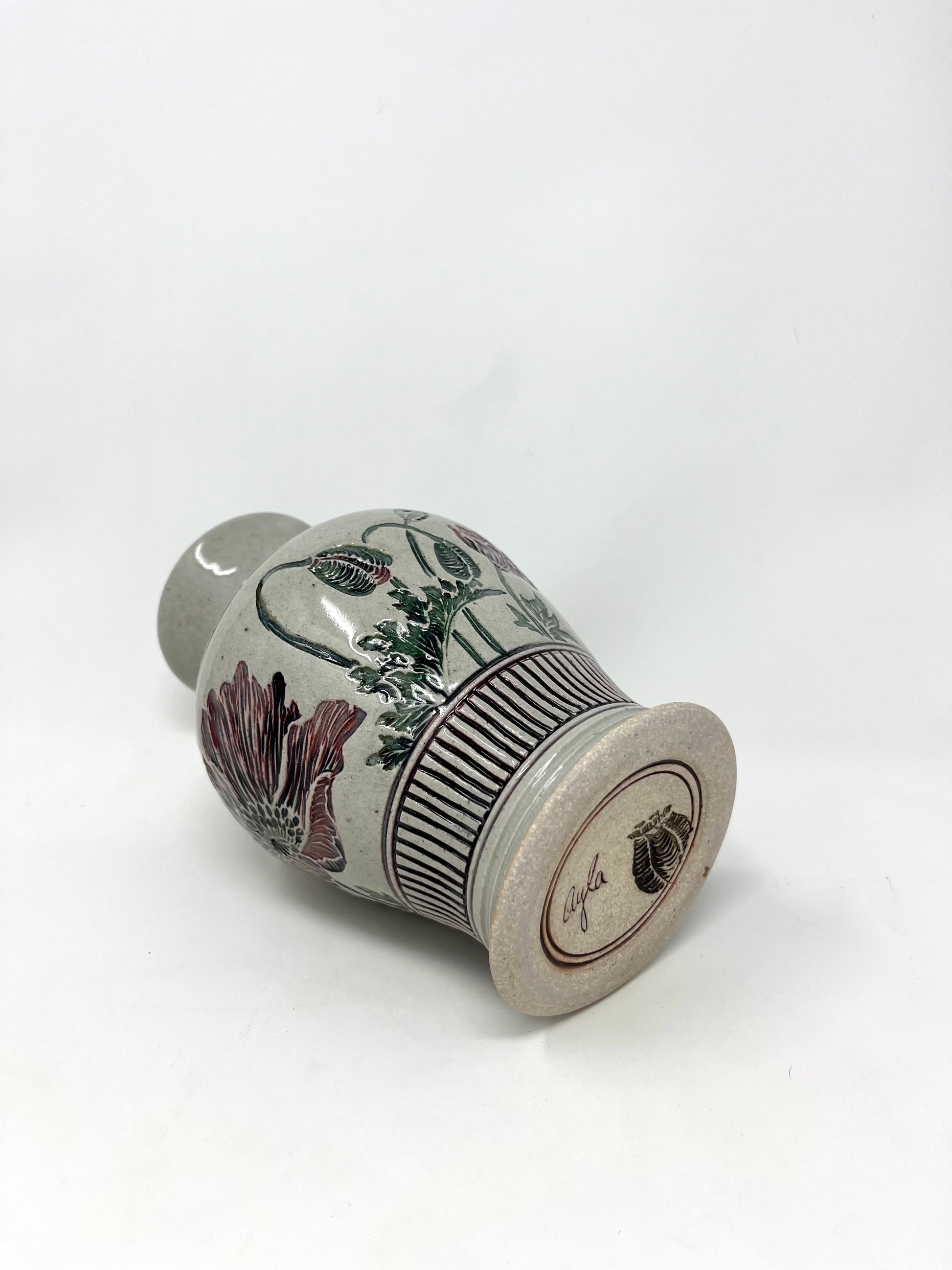 Hand thrown on the potter's wheel and decorated with a hand carved and inlaid design of poppy flowers, leaves, buds, and seed pods, the clear celadon glaze highlights the lovely variegated gray of the clay body. Bring the wildness and beauty of a summer wildflower patch into your home with this vase.