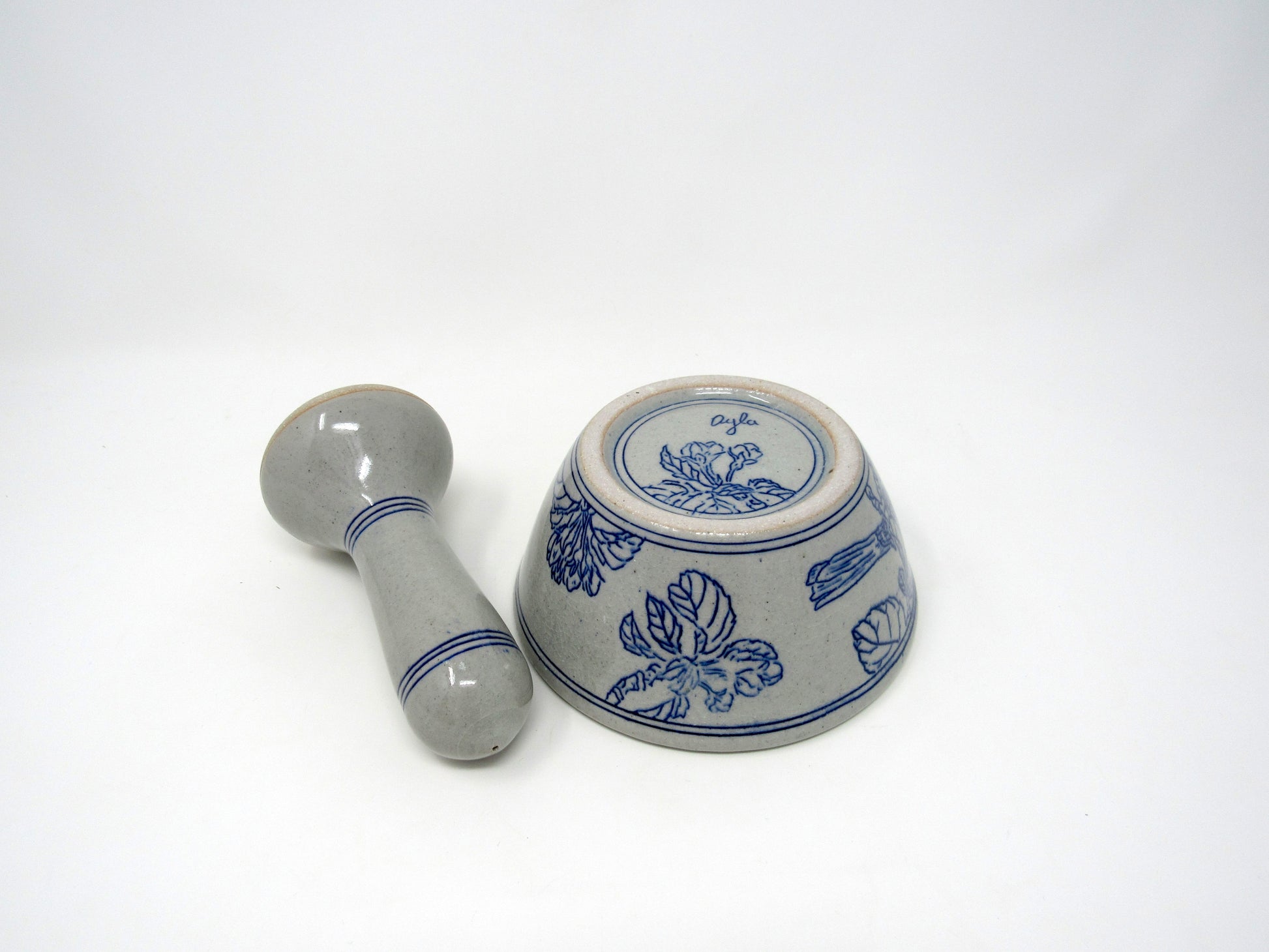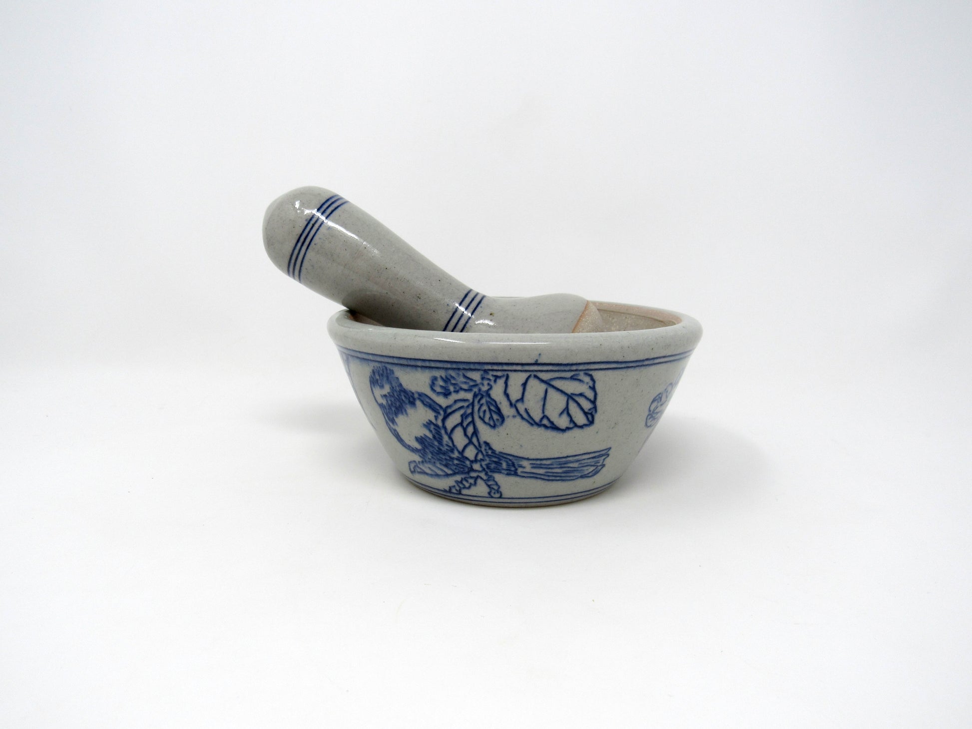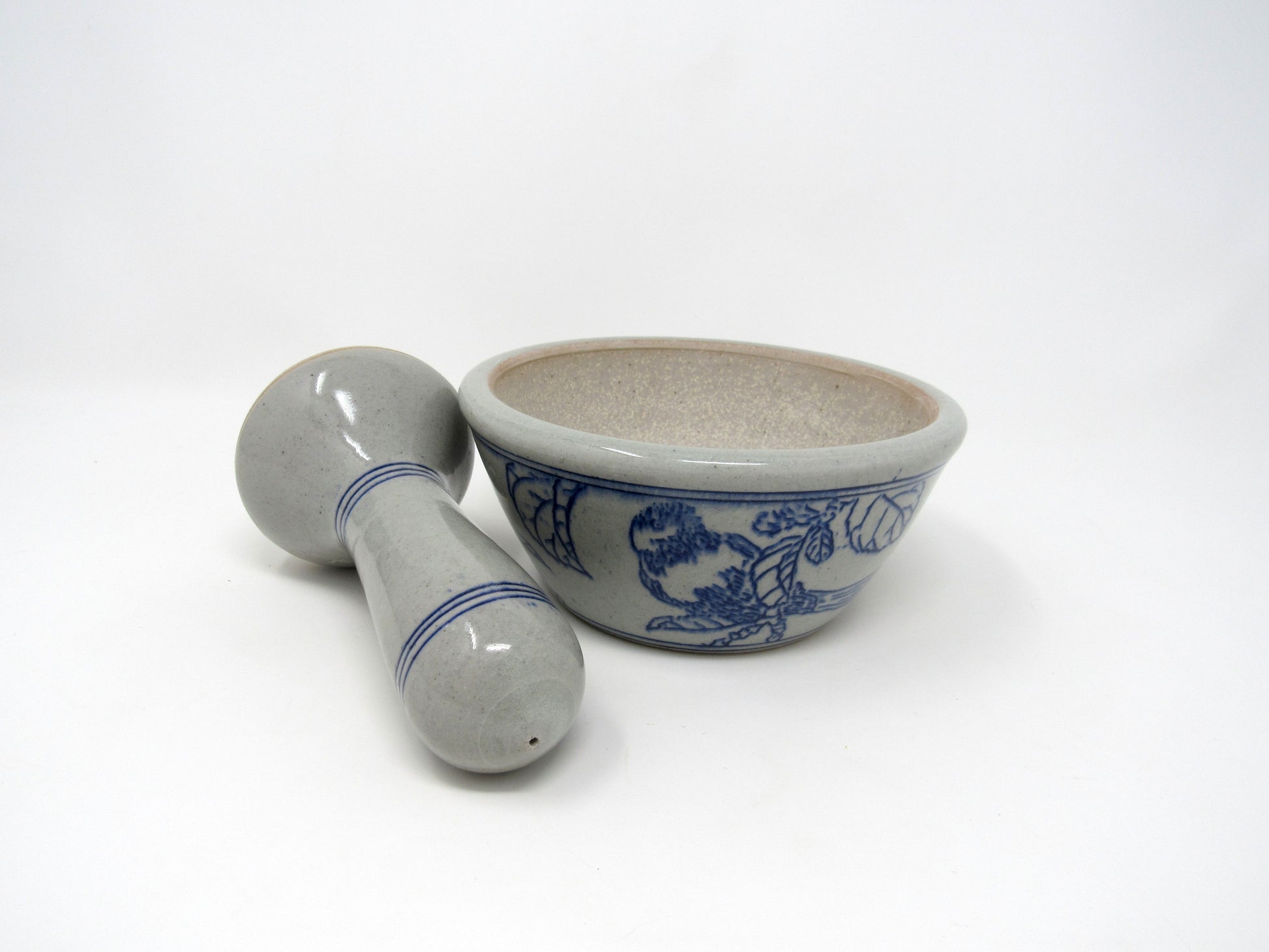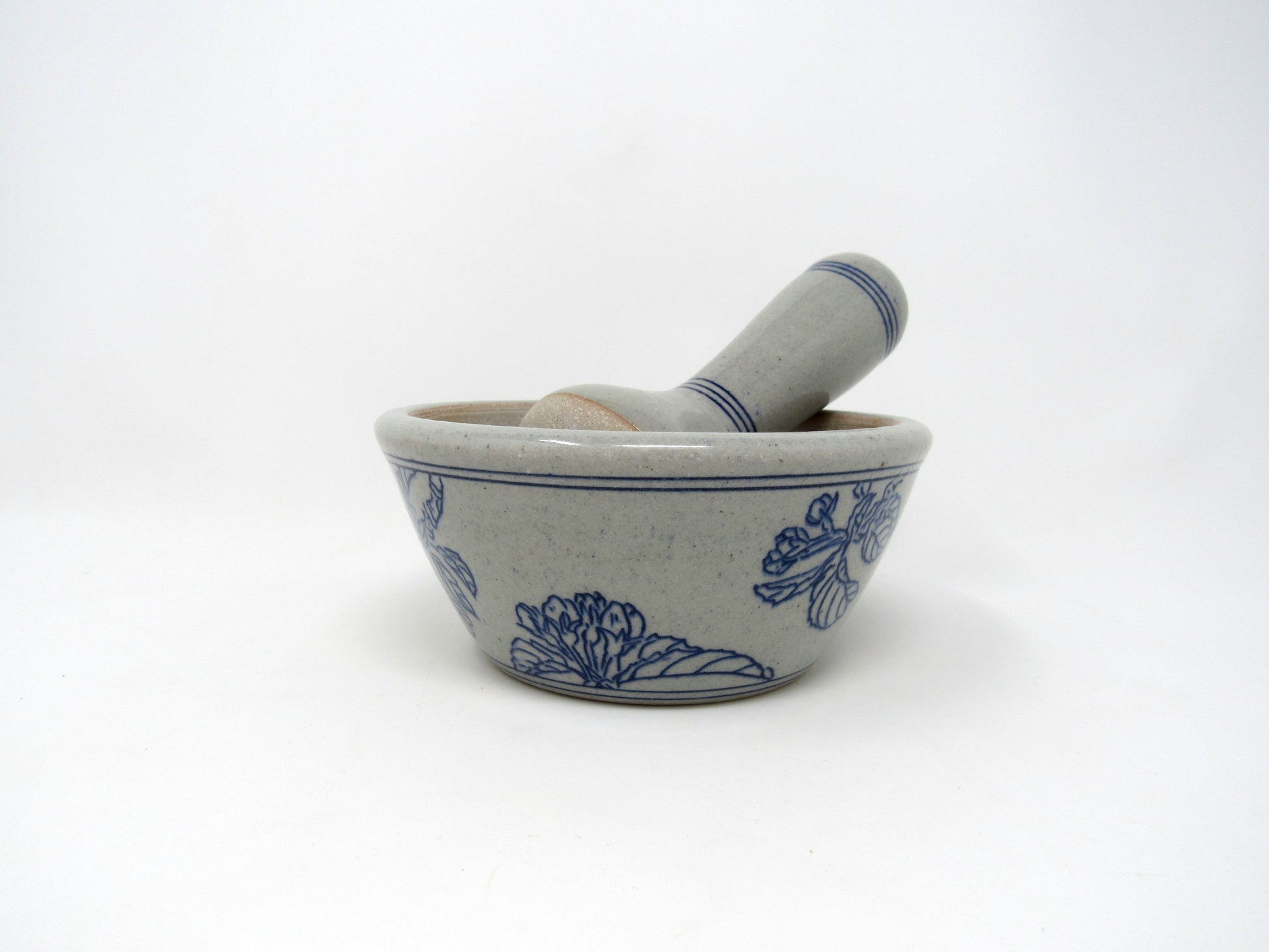 Decorated with a hand-carved and inlaid design of apple leaves and blossoms with chickadee in royal blue, it is glazed in a food-safe celadon glaze on the outside of the mortar and the upper part of the pestle. The interior of the mortar bowl is left unglazed, as well as the rounded bottom of the pestle, the sanded bare clay being a perfect texture for grinding spices, herbs, etc between their surfaces.