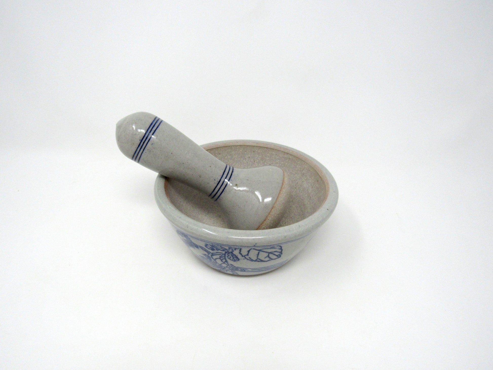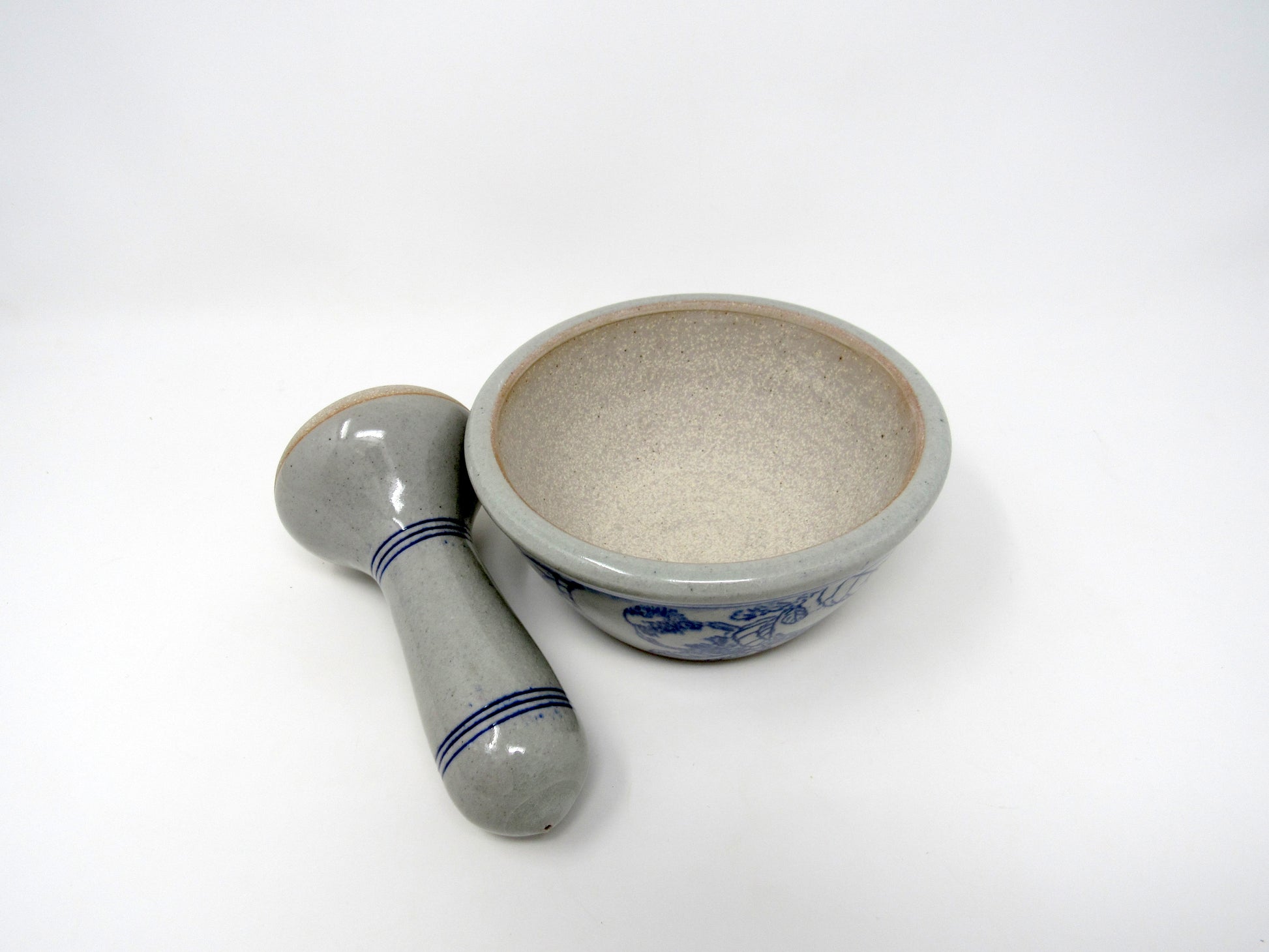 This Mortar and Pestle set was made by hand from stoneware clay. The mortar was thrown thick and heavy on the potter's wheel, to give it weight and durability for kitchen use, and the pestle was wheel thrown into a tapered cone with a rounded bottom for grinding.