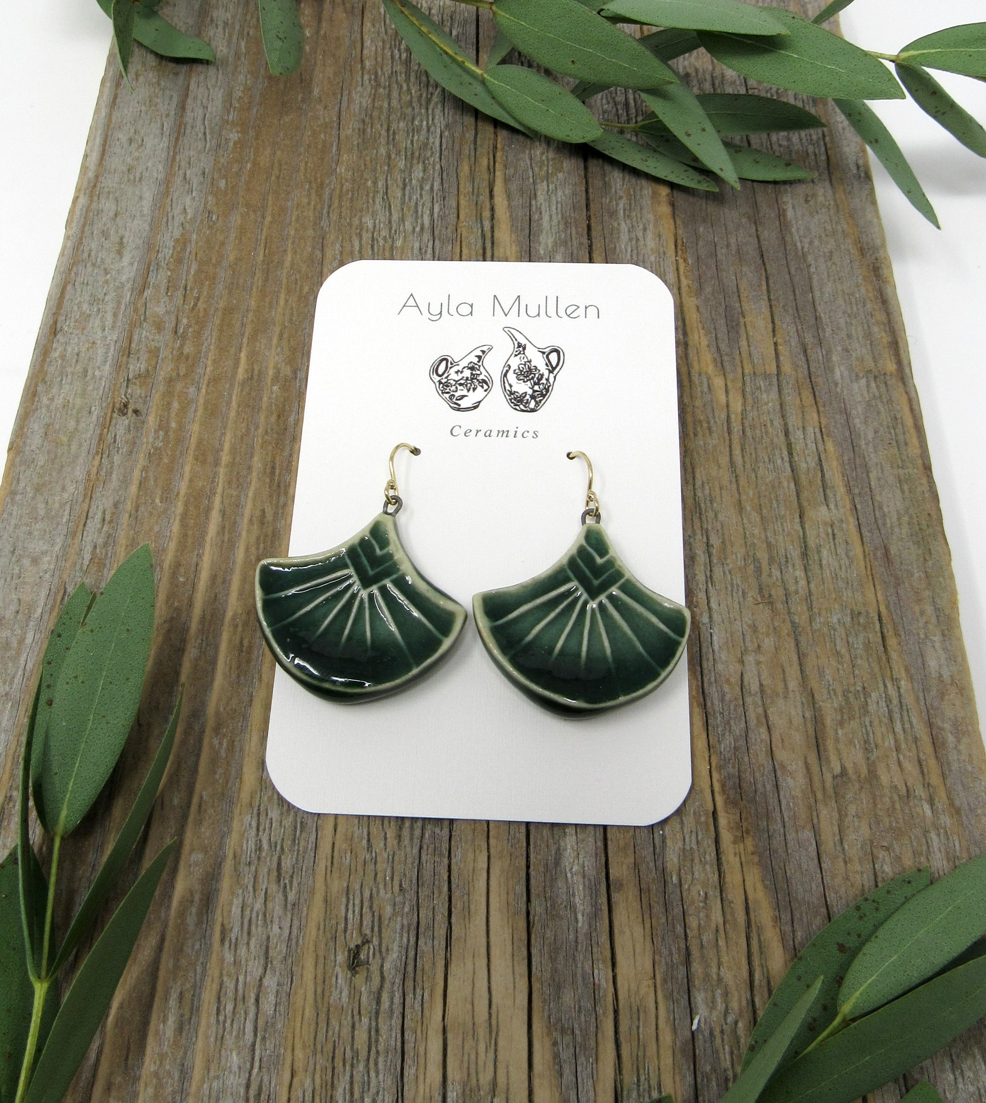These earrings are handmade out of porcelain clay. Each piece is stamped out of a thin slab of clay. They are glazed in a durable dark green glaze.
