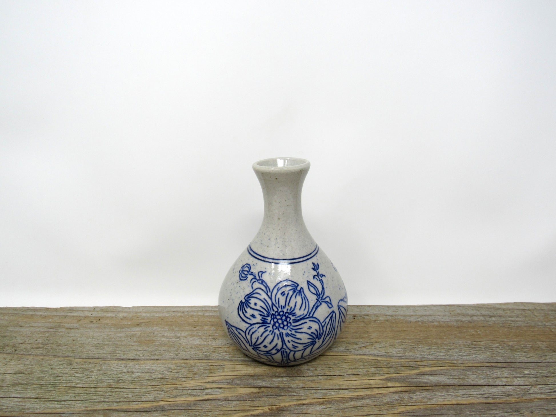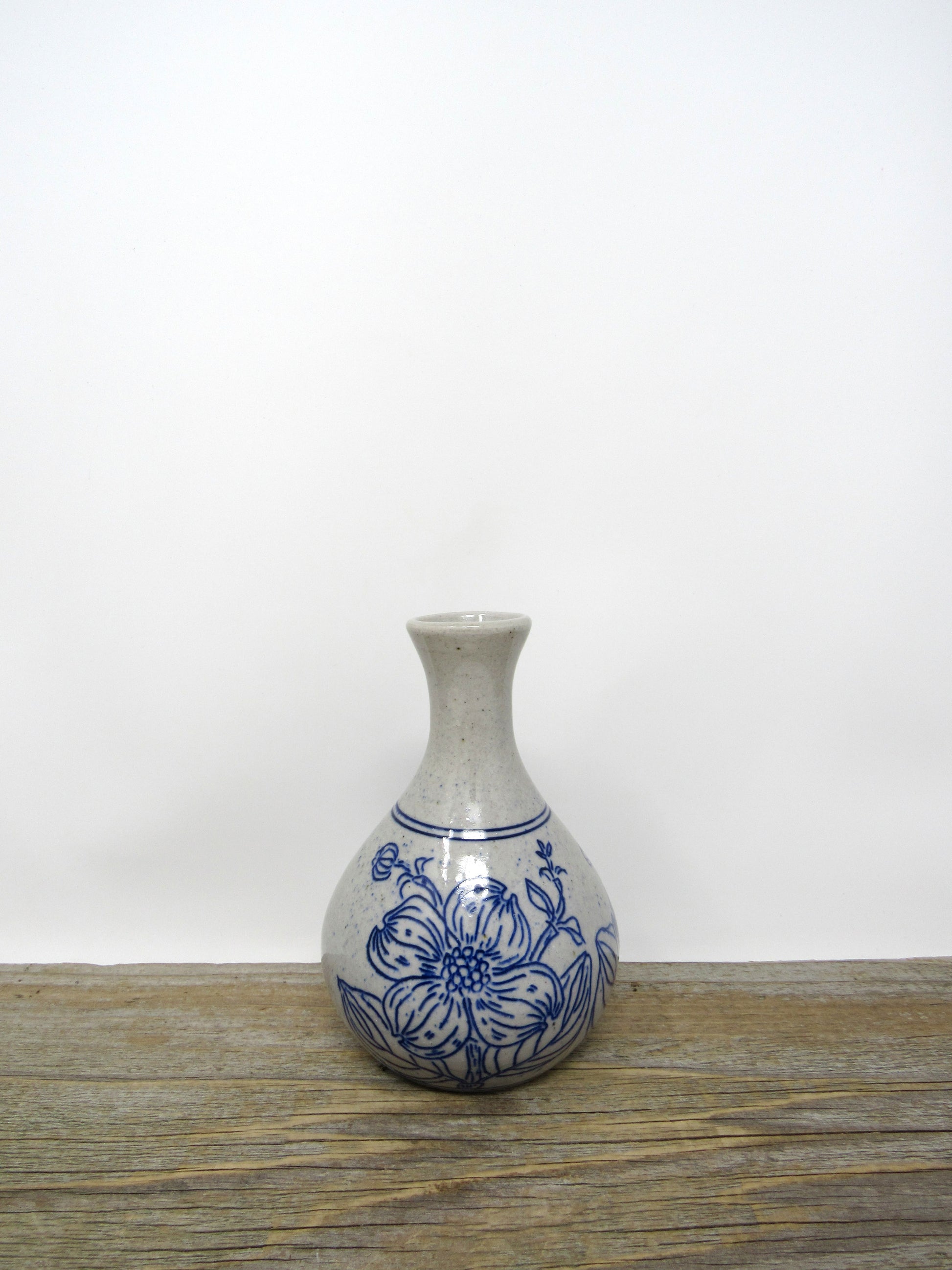Decorated with a hand carved and inlaid Dogwood flower design in blue, it is glazed in a clear celadon glaze.