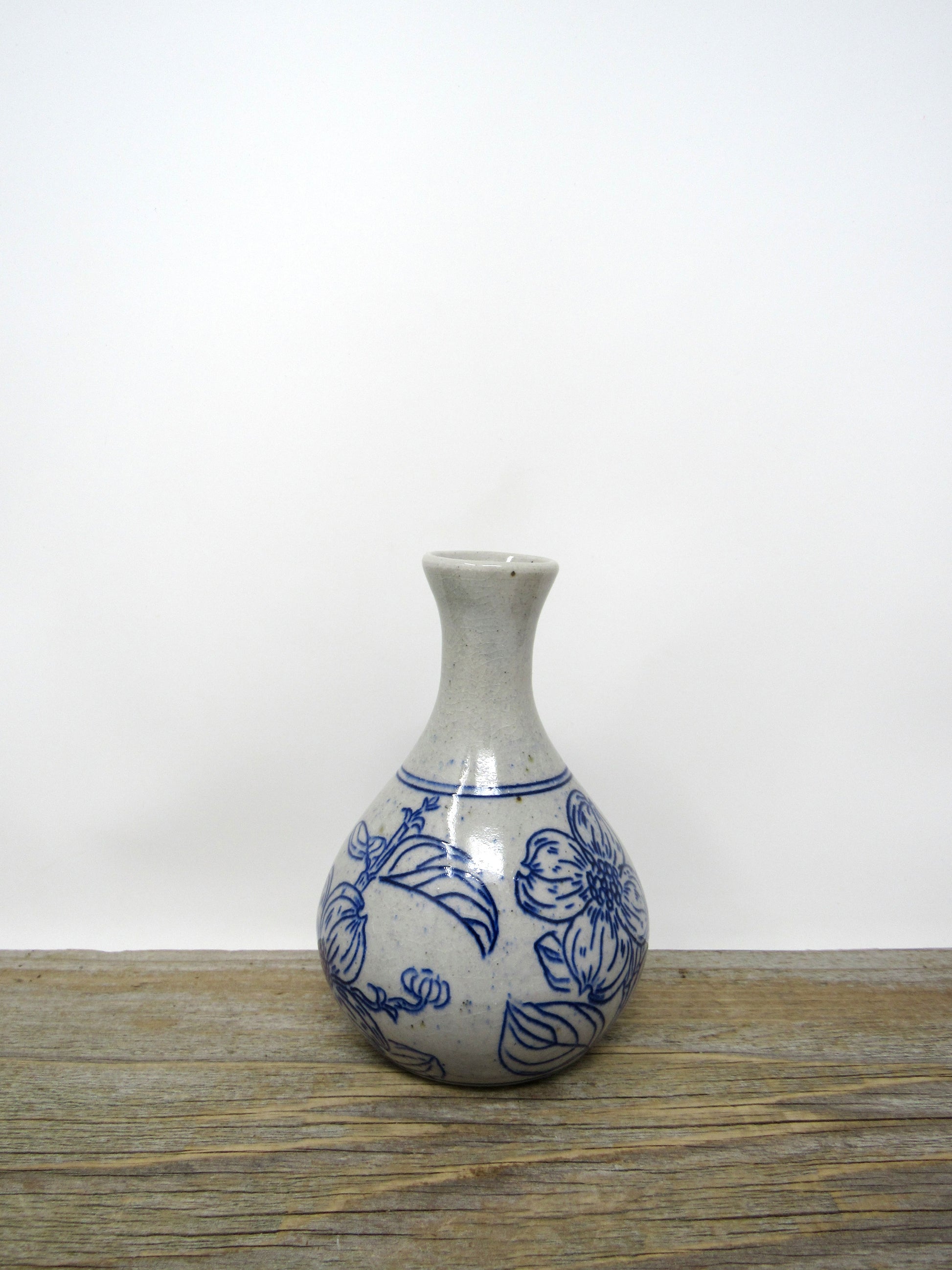 This piece was hand thrown on the wheel with stoneware clay. The decoration was hand-carved and inlaid with color before the piece was fired. I mix all of my own glazes and fire in a gas reduction kiln to 2400 degrees F.