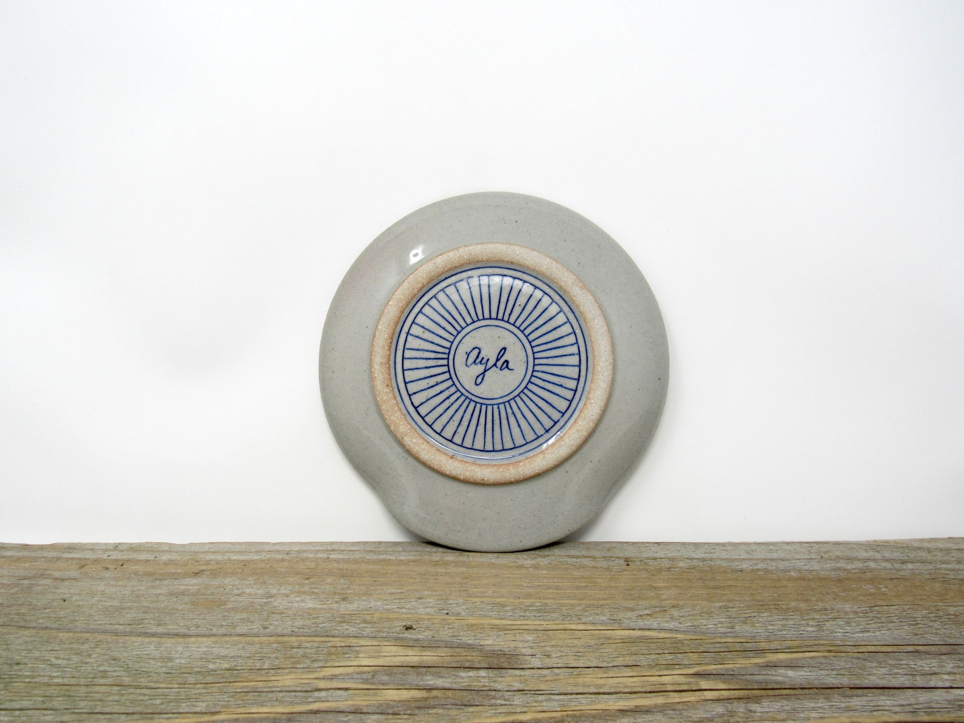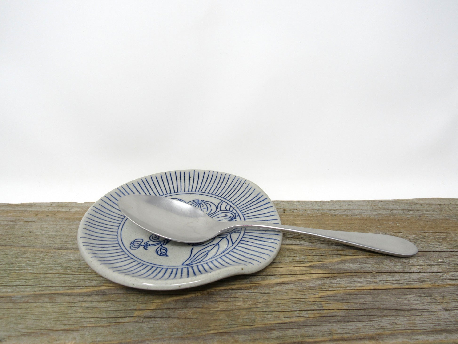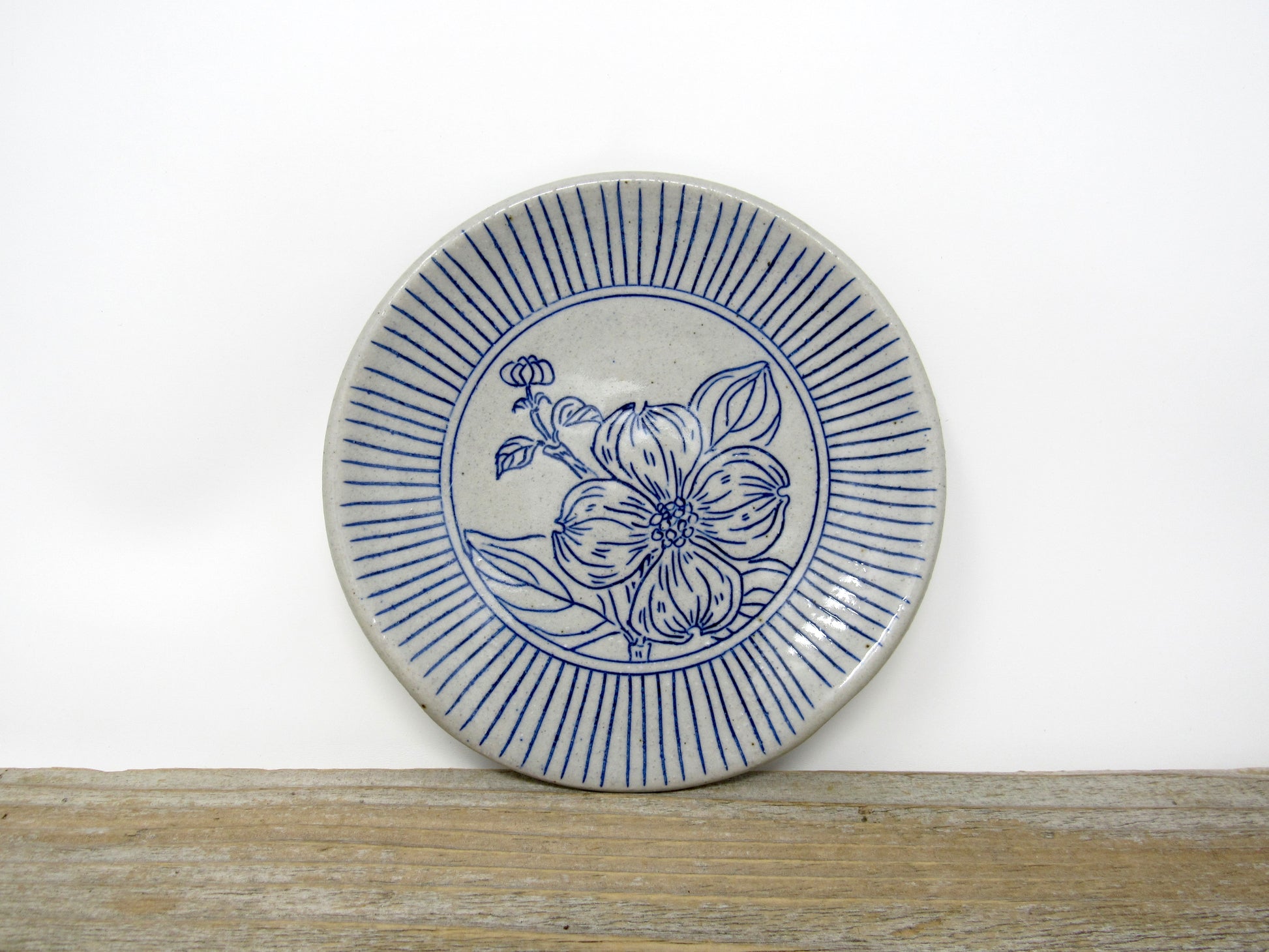 This spoon rest was thrown on the potter's wheel and altered to form a small dip in the rim for a spoon handle to rest. It is decorated with a hand carved and inlaid dogwood design in cobalt blue, and glazed in my food safe clear celadon glaze. Microwave and dishwasher safe.