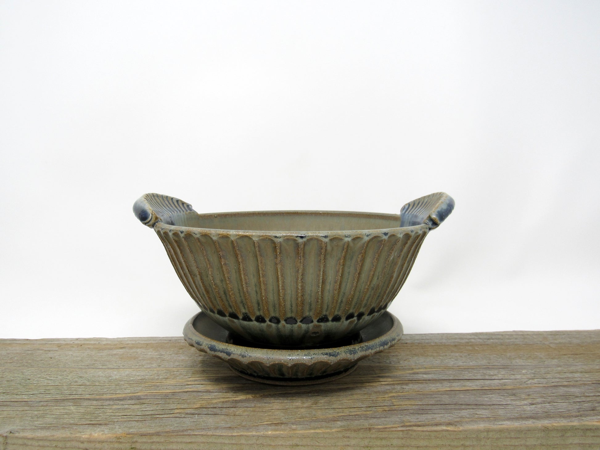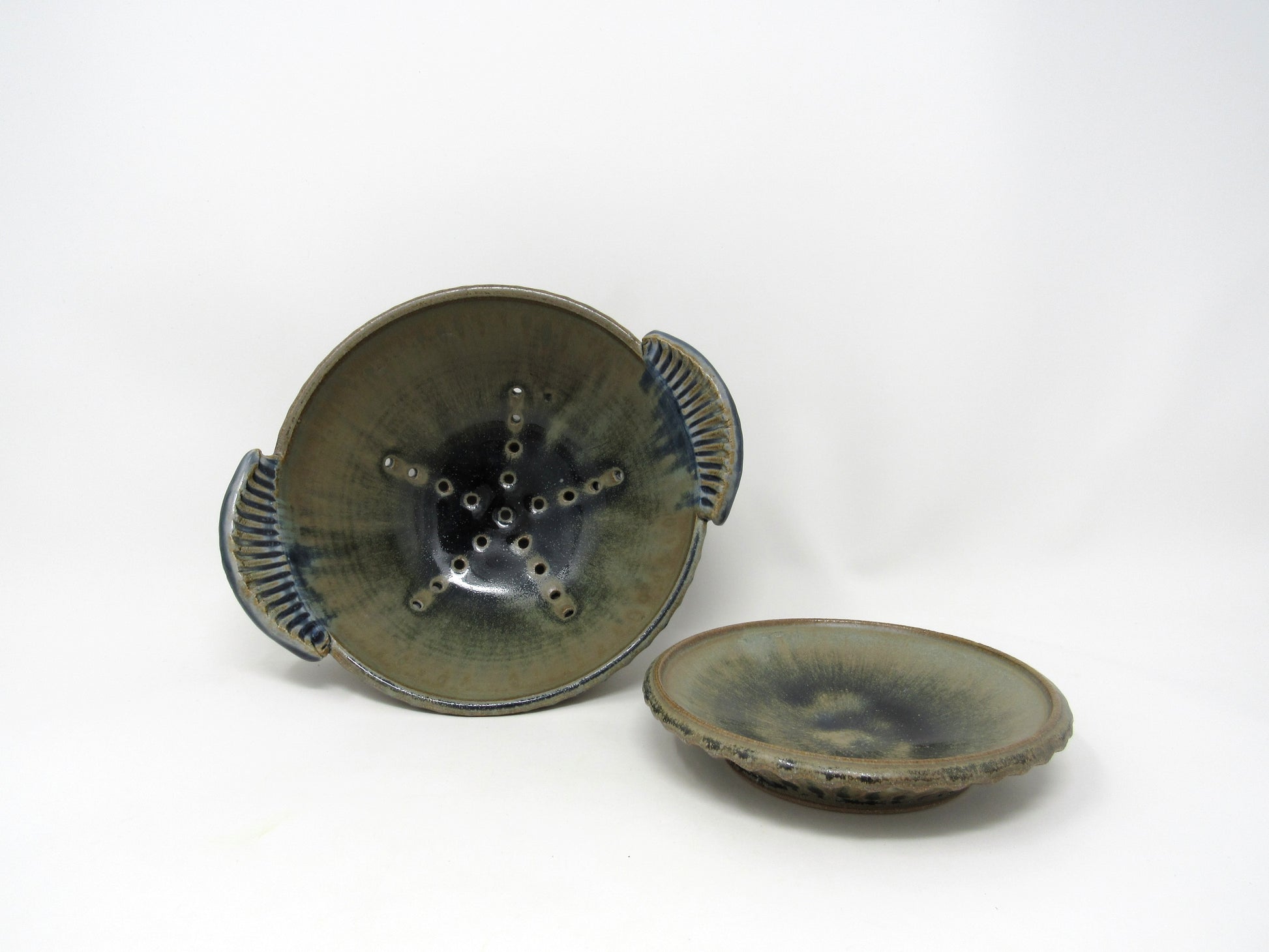 This berry bowl was hand thrown on the potter's wheel out of stoneware clay in two pieces- a bowl and a saucer. Two half-circle handles were added to the bowl for easy carrying. A series of small holes punched in the bottom of the bowl let water drain when rinsing berries, and the matching saucer catches drips when you serve them!