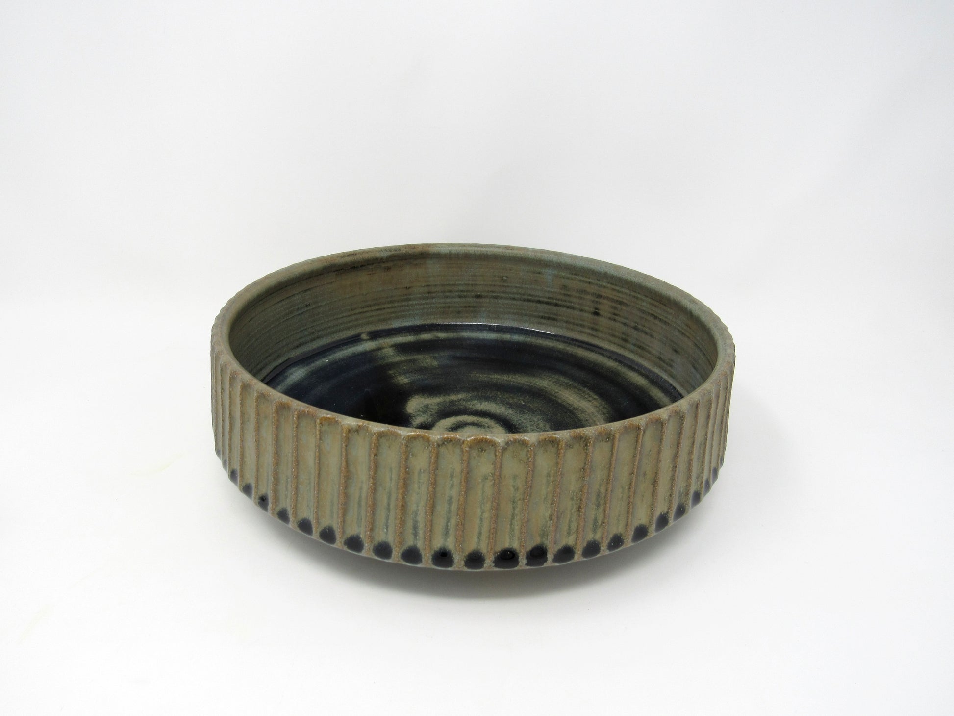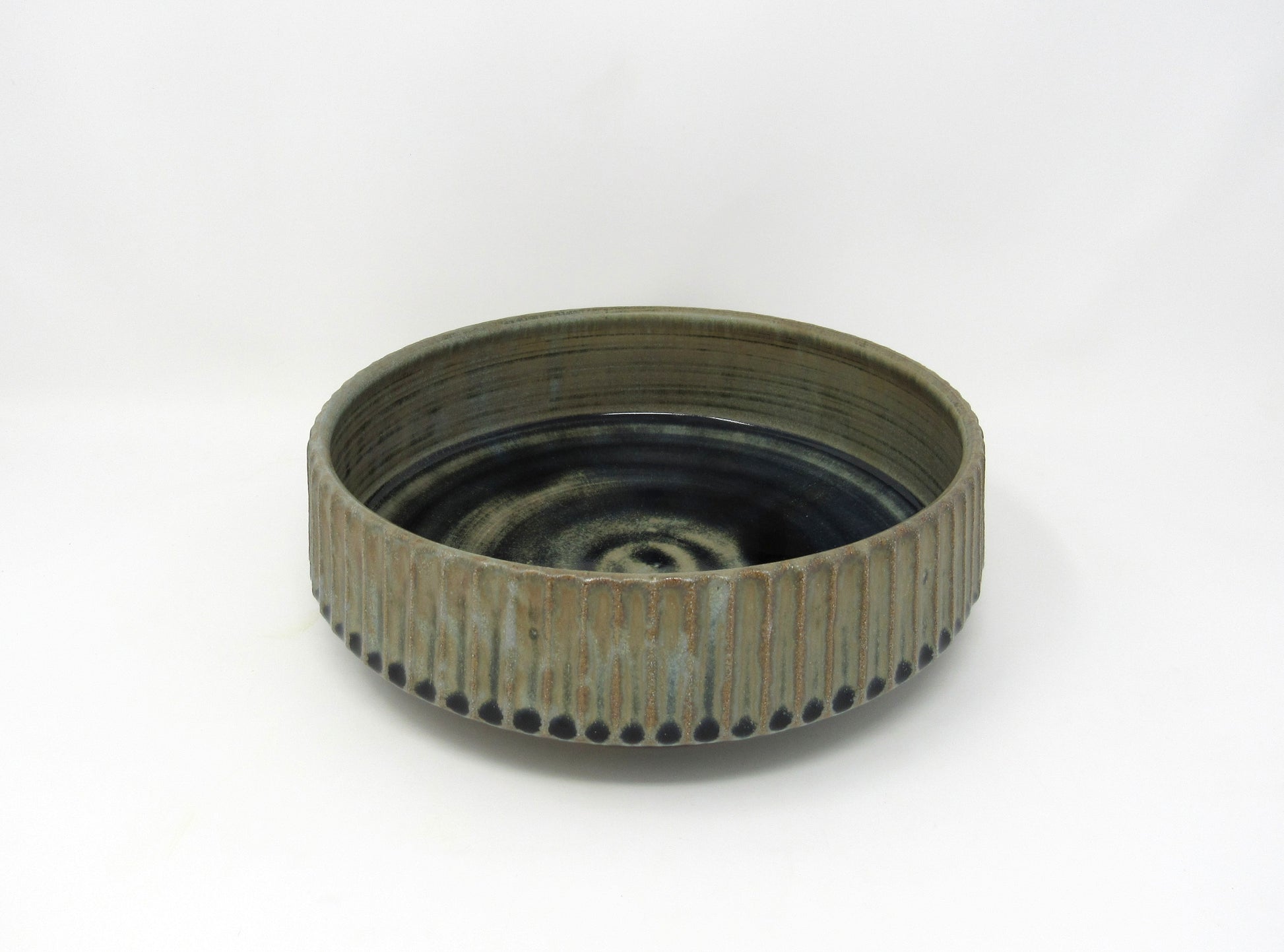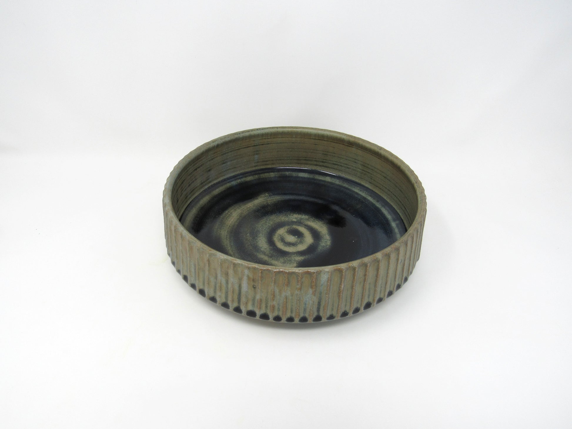 This medium sized, decorative serving bowl was hand thrown on the potter's wheel out of stoneware clay. It was decorated with carved fluting around the wall, and glazed in my food-safe Blue Ridge glaze.