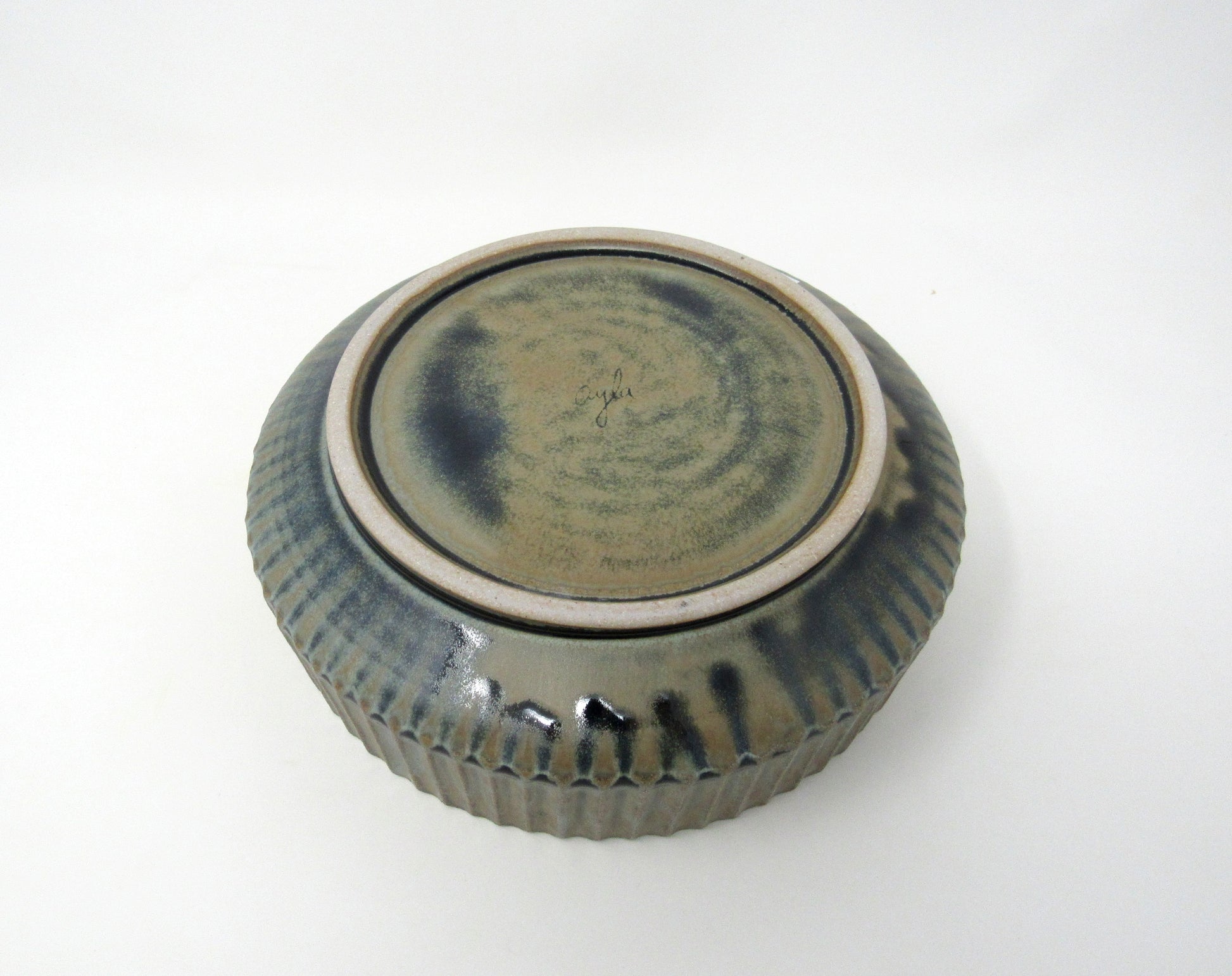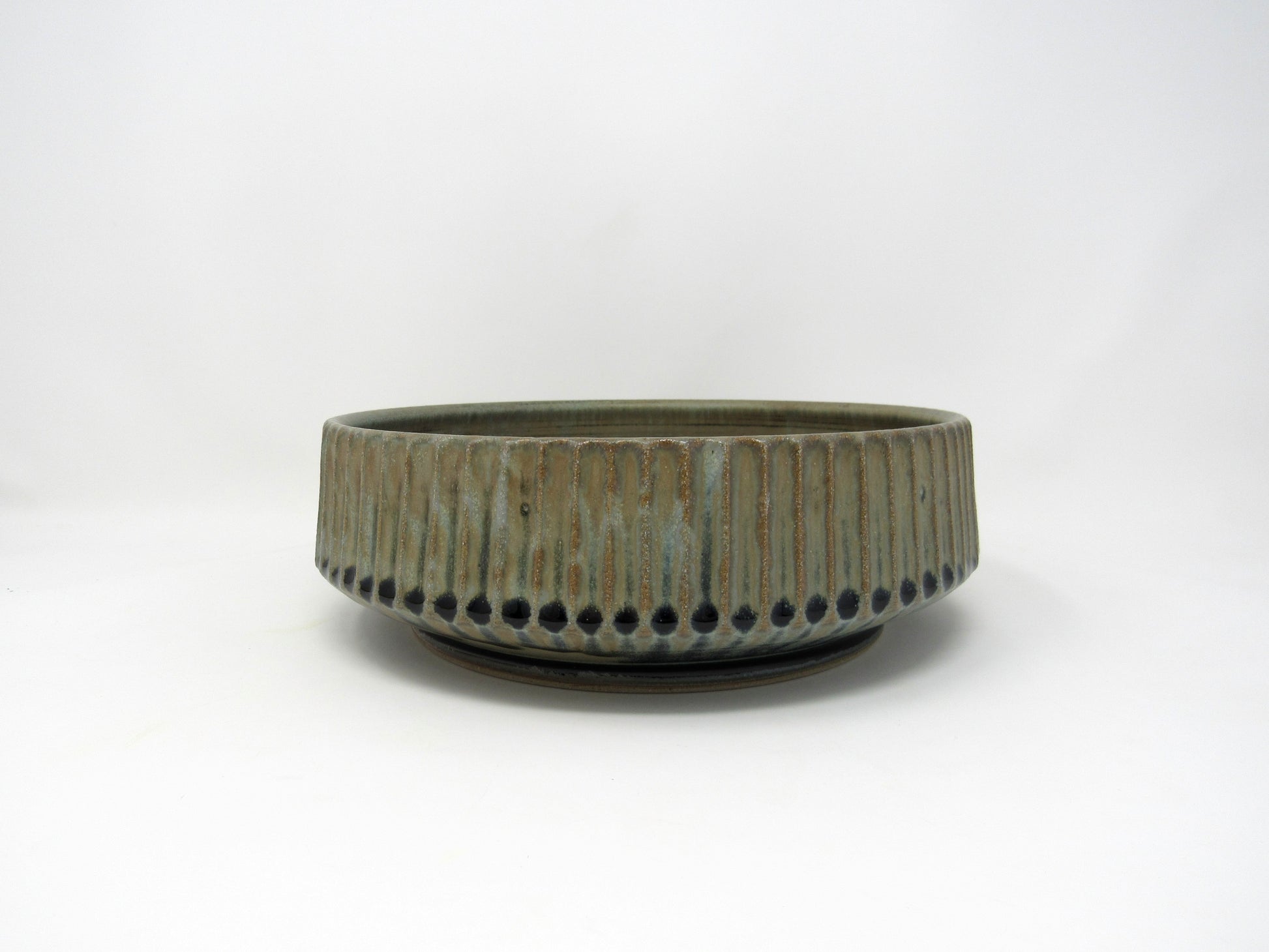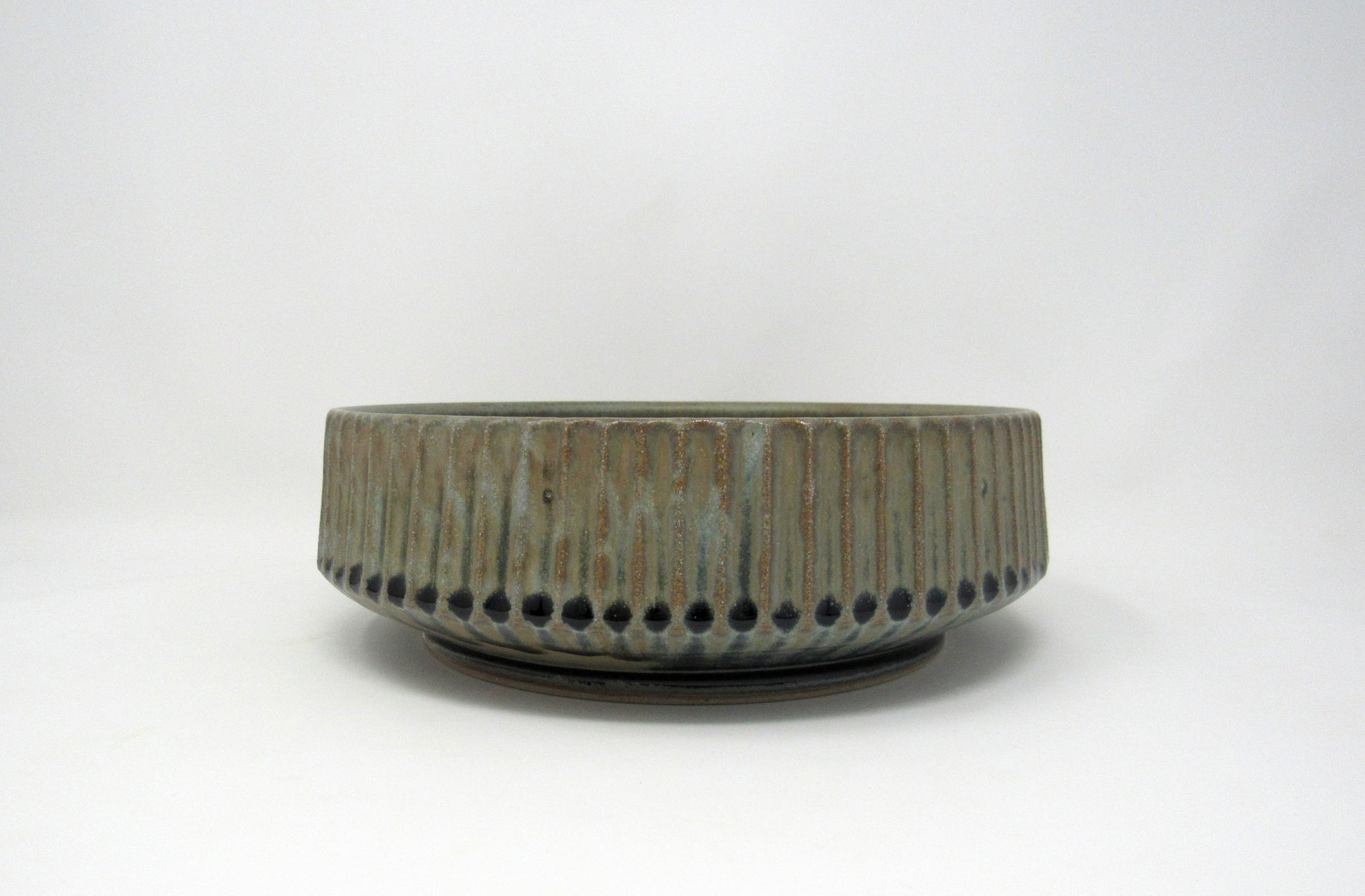 This medium sized, decorative serving bowl was hand thrown on the potter's wheel out of stoneware clay. It was decorated with carved fluting around the wall, and glazed in my food-safe Blue Ridge glaze.
