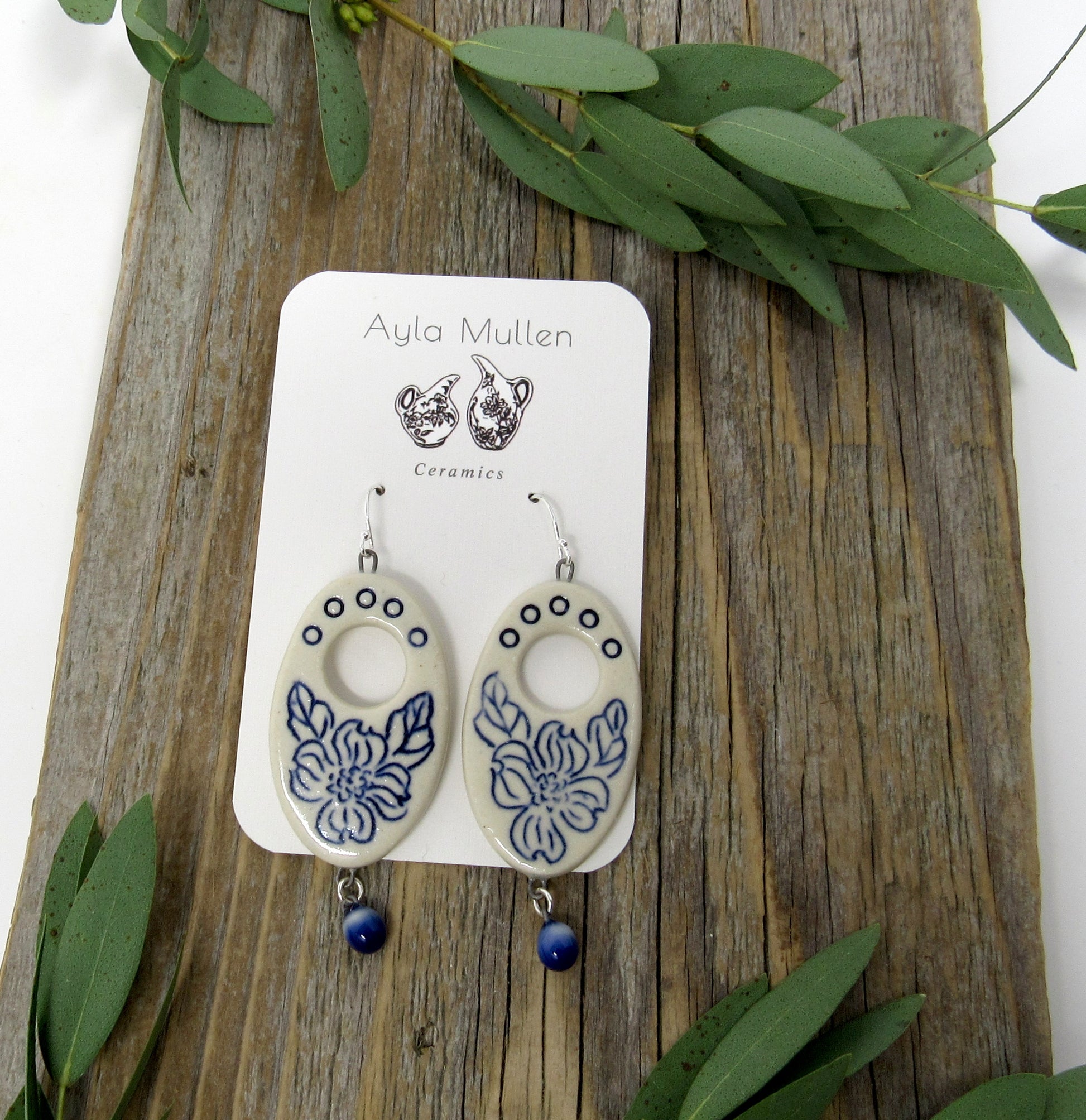 These earrings are handmade out of porcelain clay. Each piece is stamped out of a thin slab of clay, and the designs are hand carved and inlaid into the surface of each earring in cobalt blue. They are glazed in a durable clear glaze.