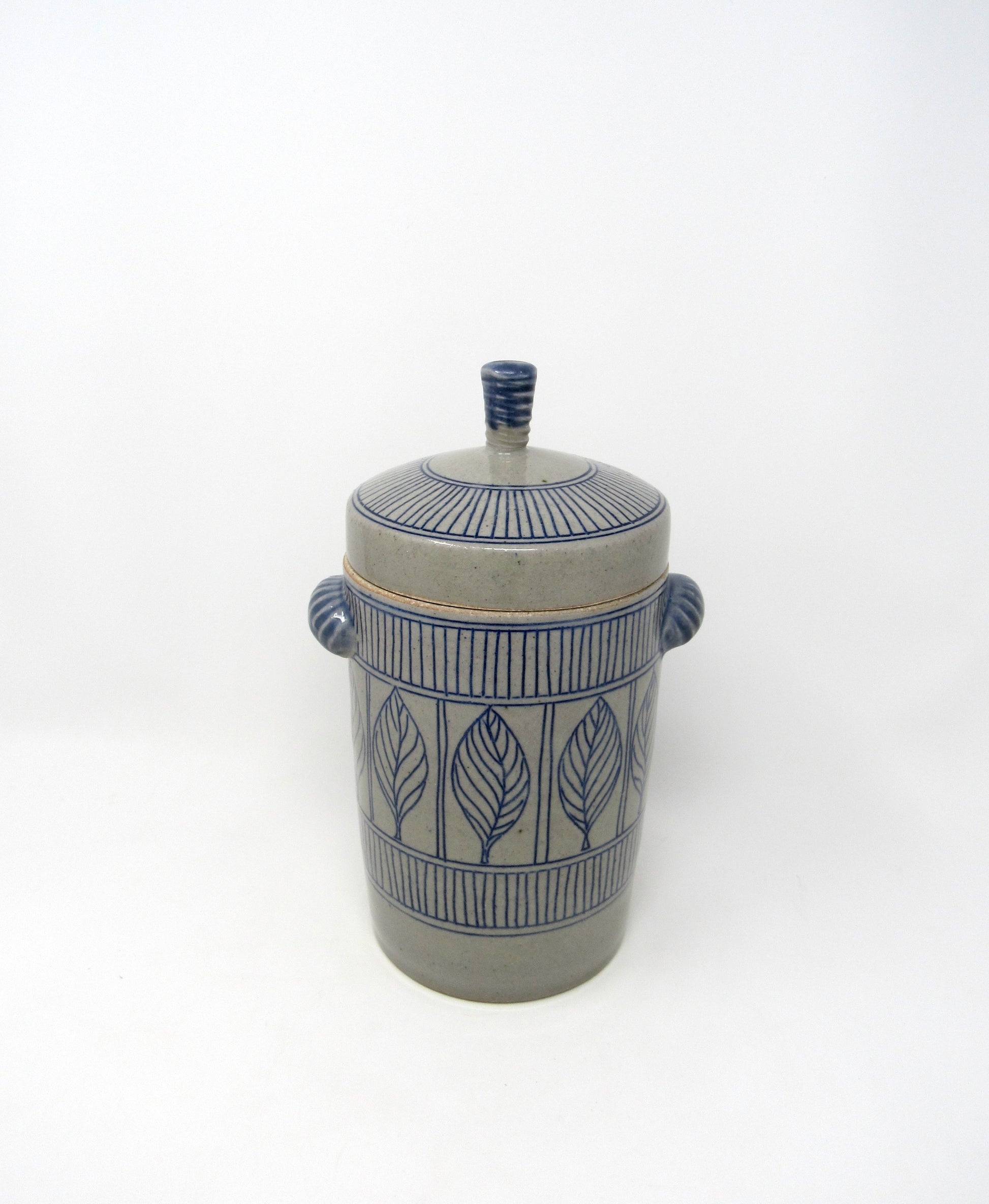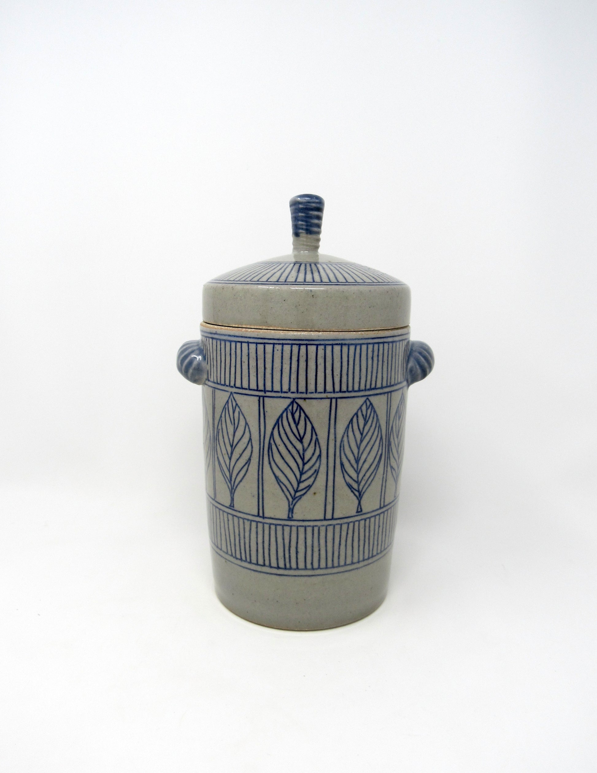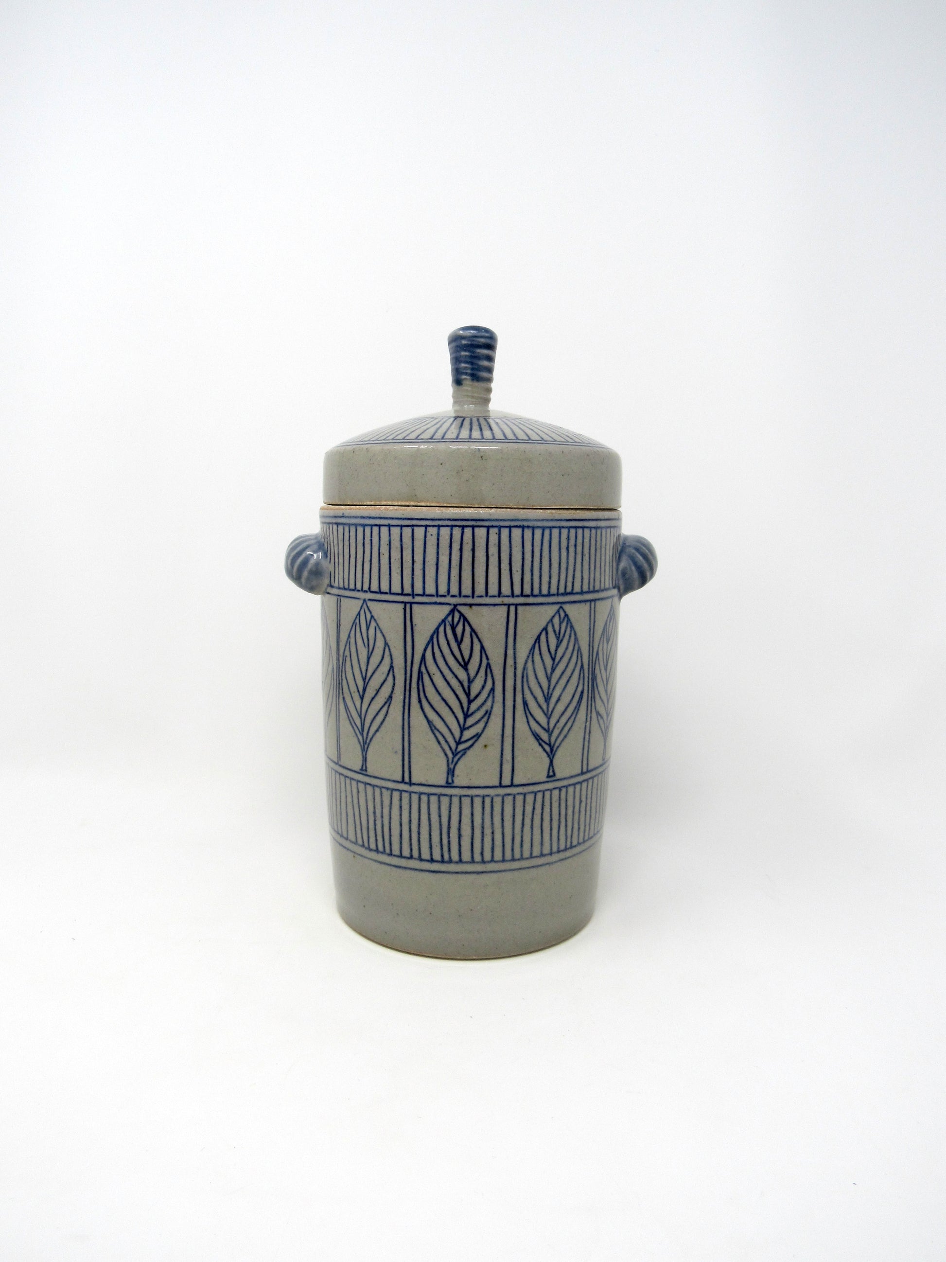 This tall food storage jar was hand thrown on the potter's wheel out of stoneware clay. It is decorated with a hand carved and inlaid design of stripes and repeating leaves in cobalt blue, and glazed in my food safe celadon glaze.