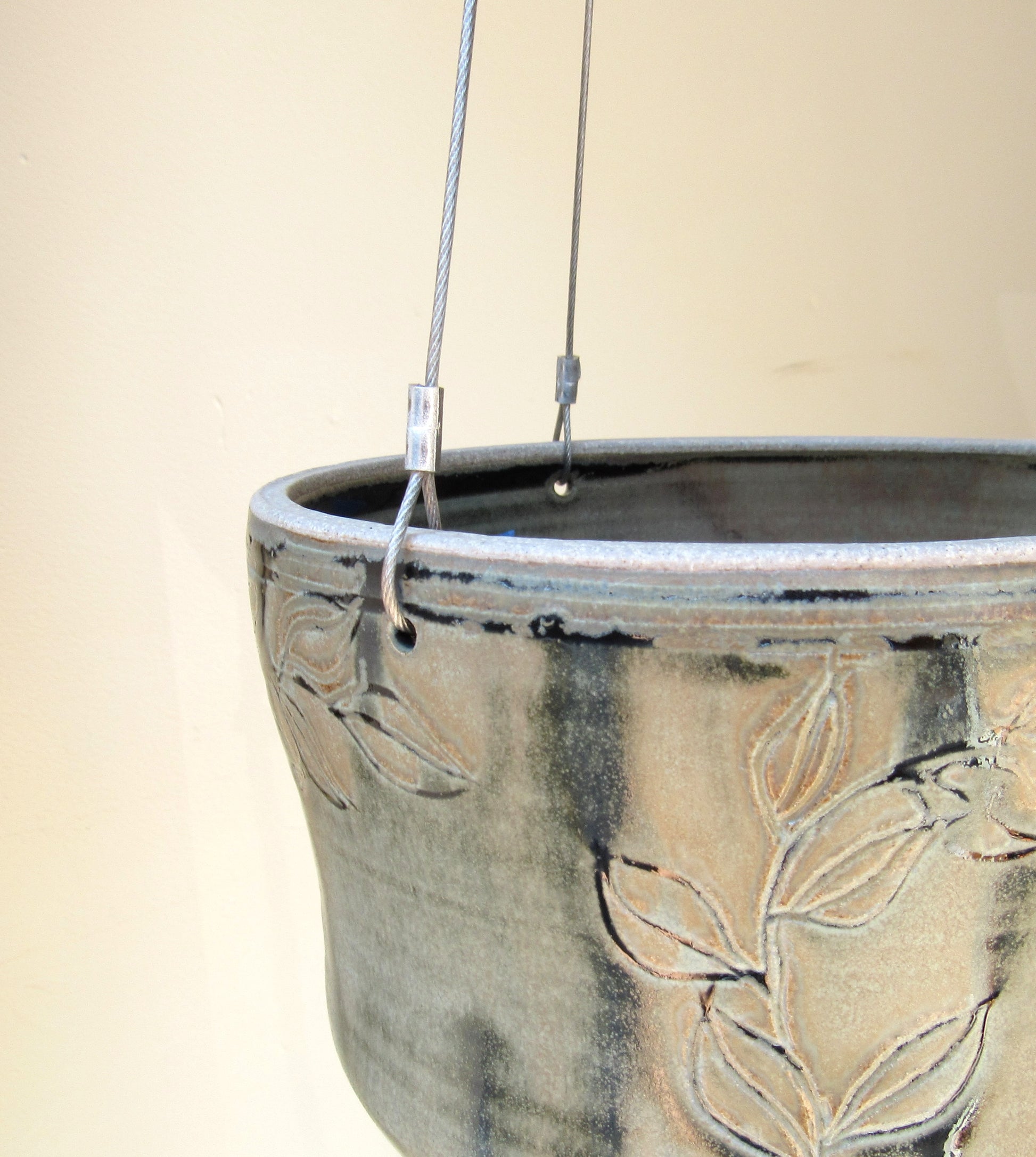 The planter is suspended by three coated steel cables, each 17 inches long, and a 2-inch stainless steel S-hook.