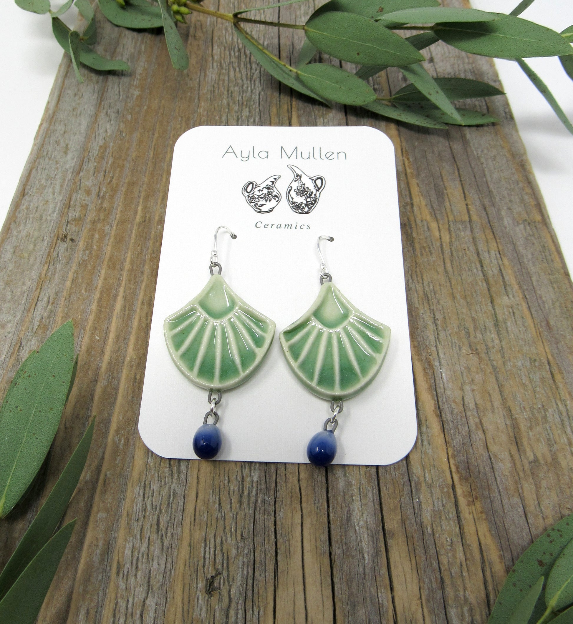 These earrings are handmade out of porcelain clay. Each piece is stamped out of a thin slab of clay. They are glazed in a durable green glaze.