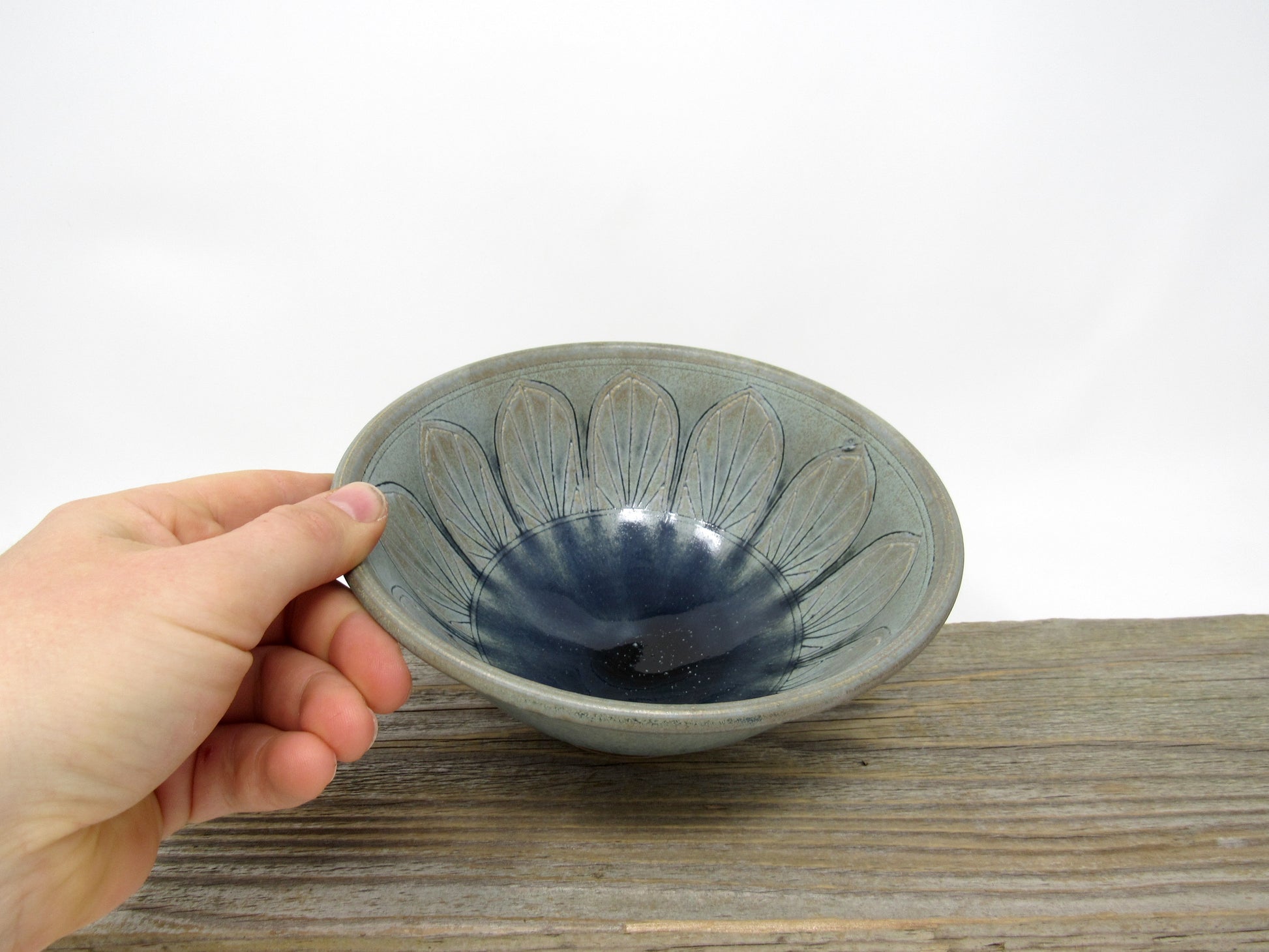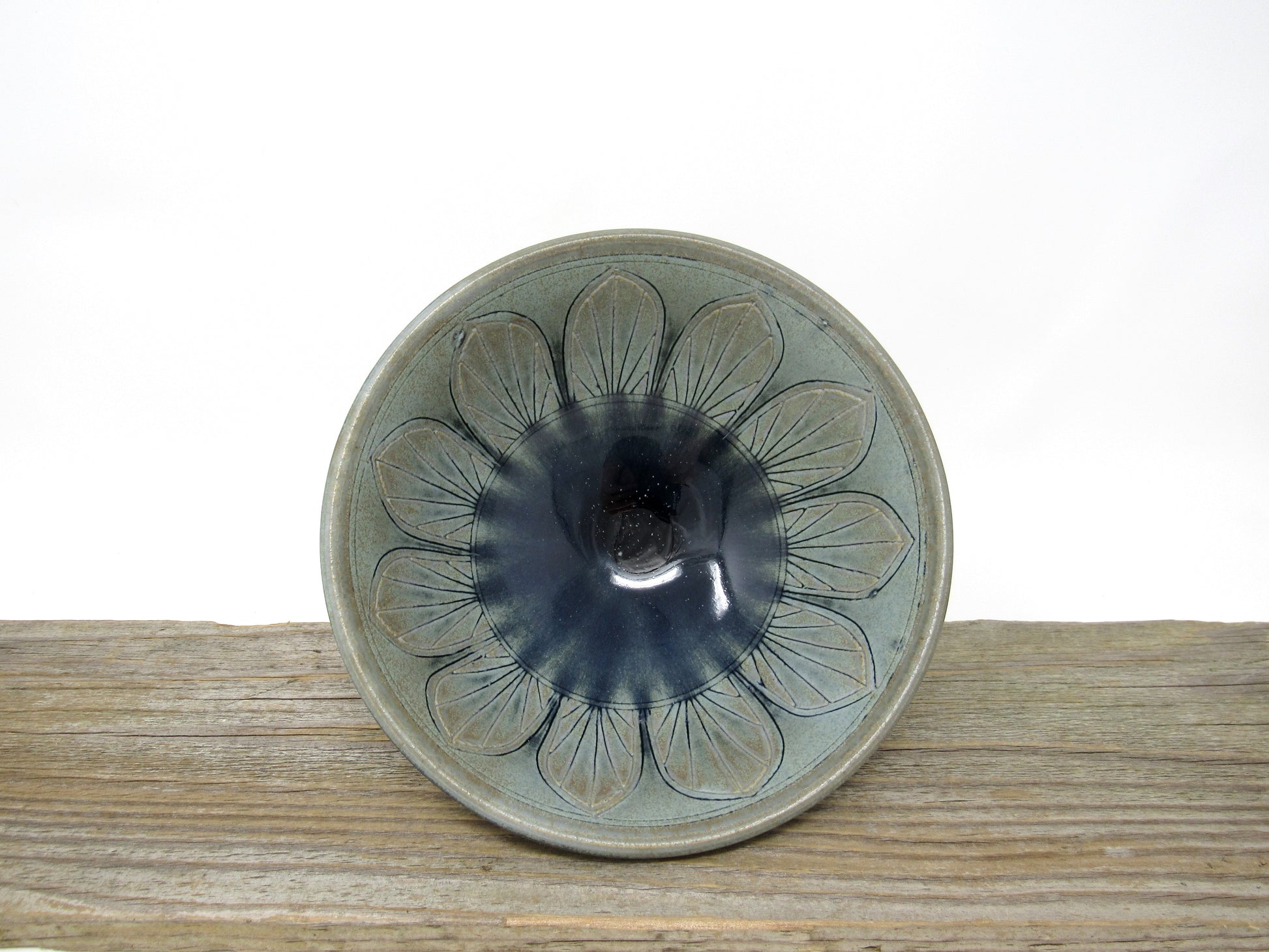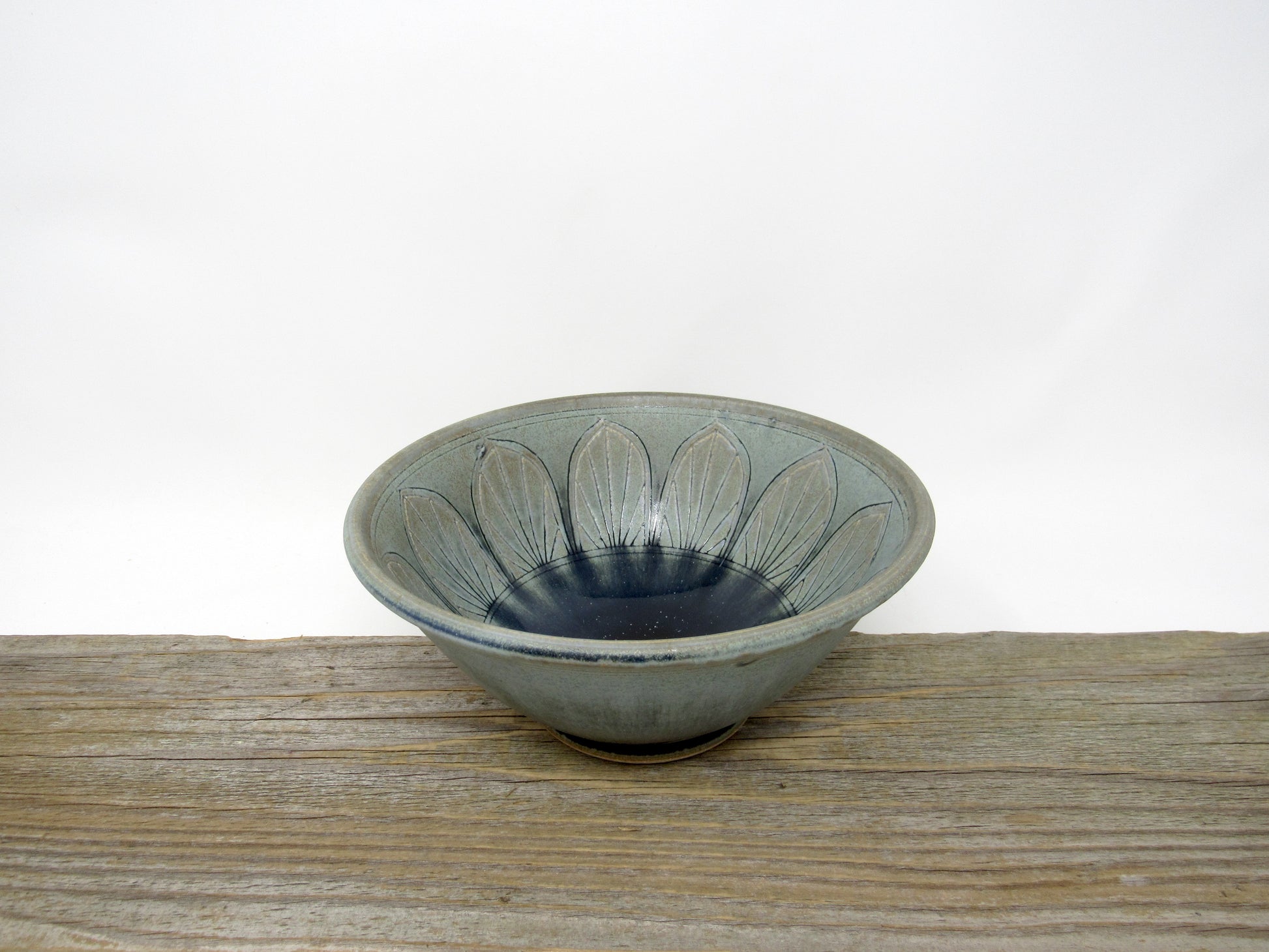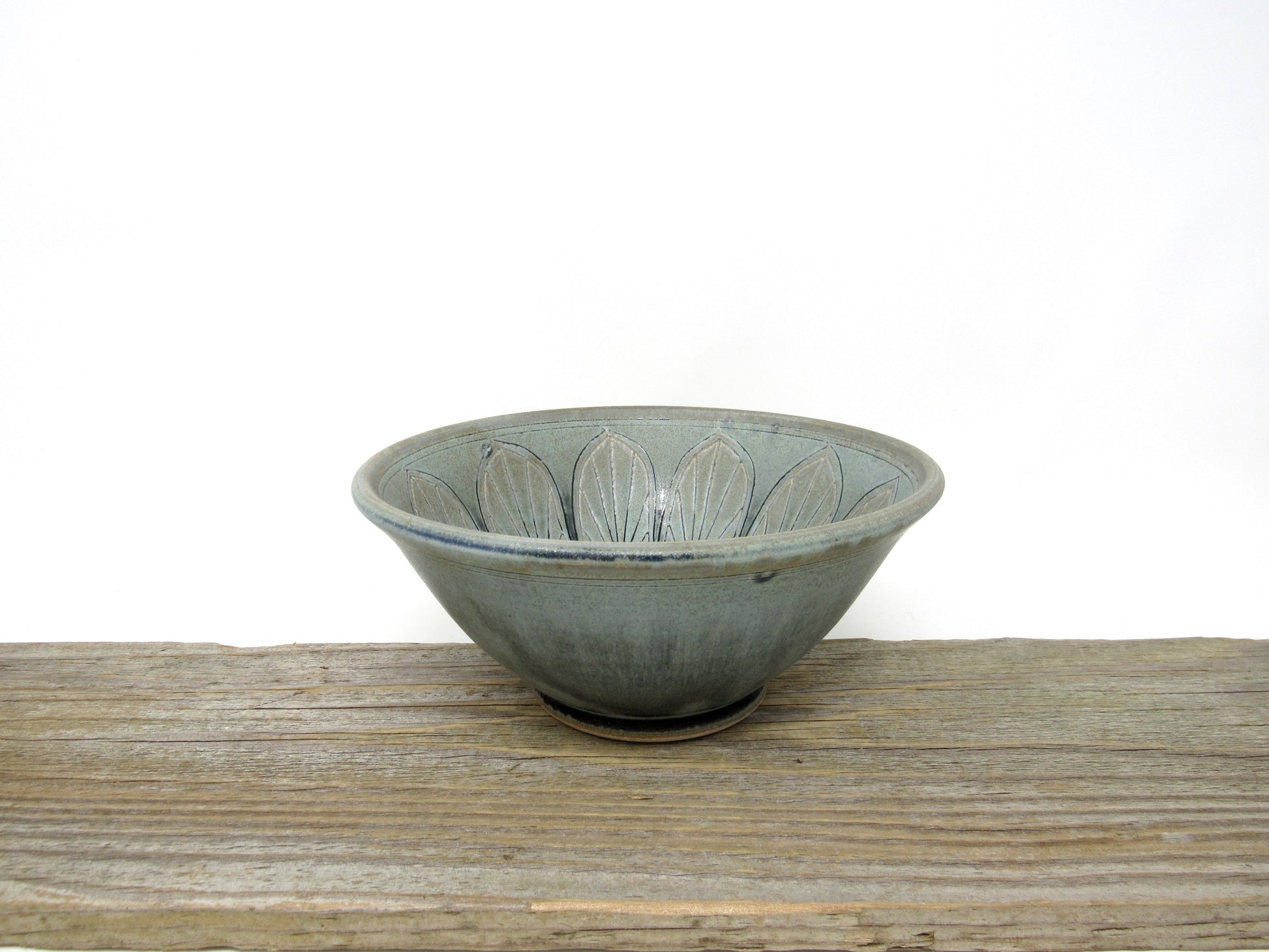 This bowl was hand thrown on the potter's wheel out of stoneware clay. Decorated with a hand-carved design of Art Deco Arches, it is glazed in a food-safe Blue Ridge satin matte glaze.