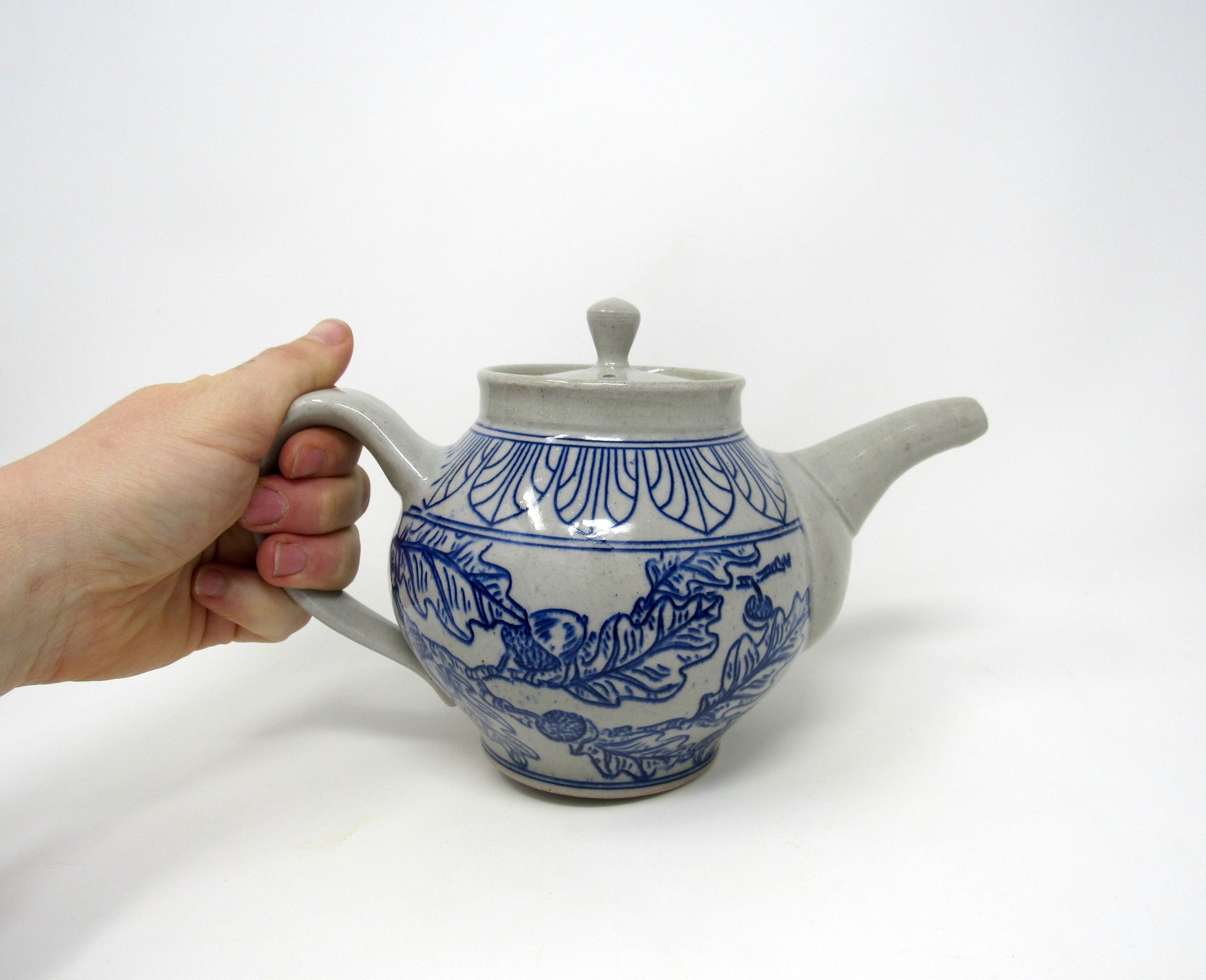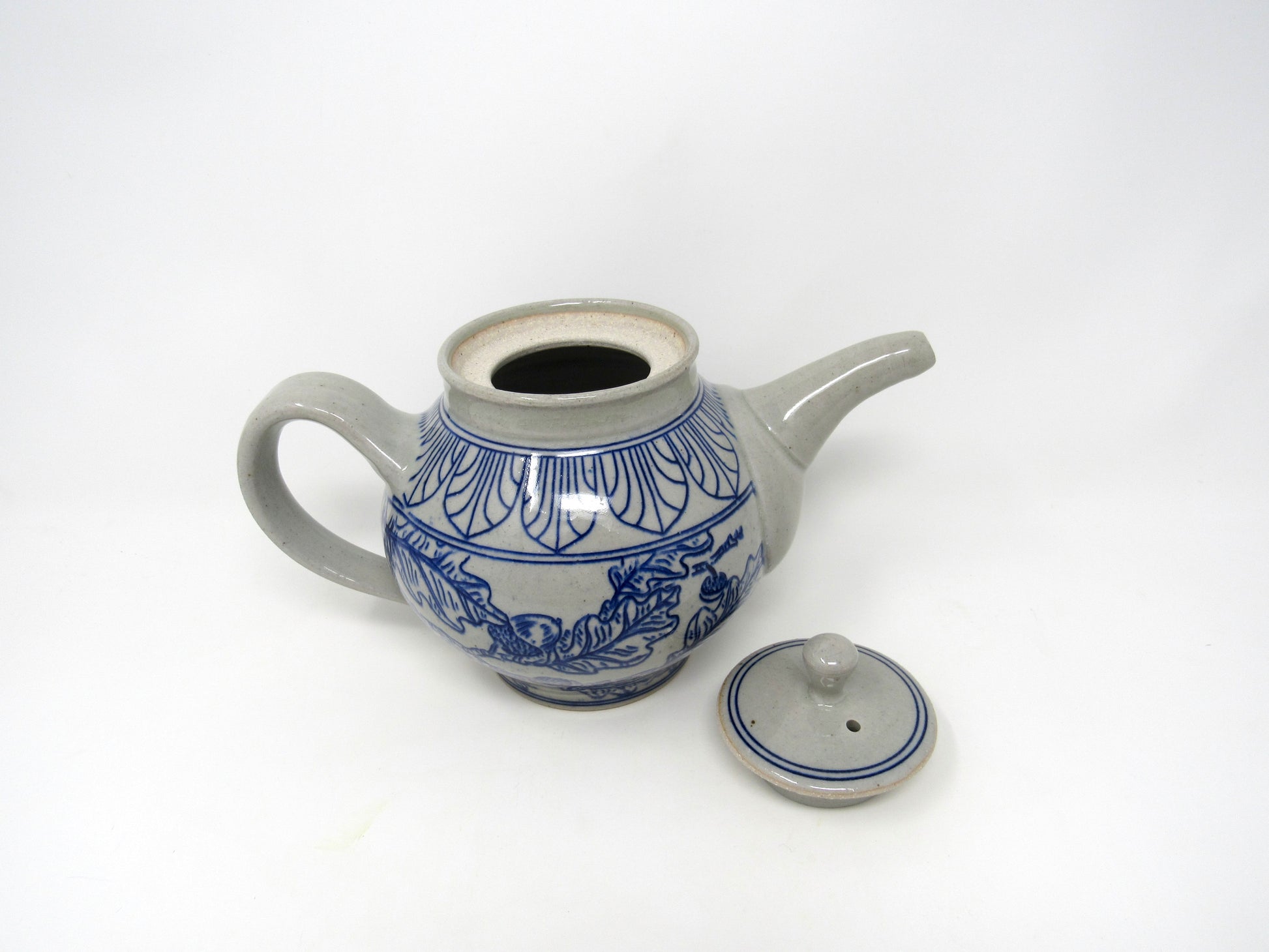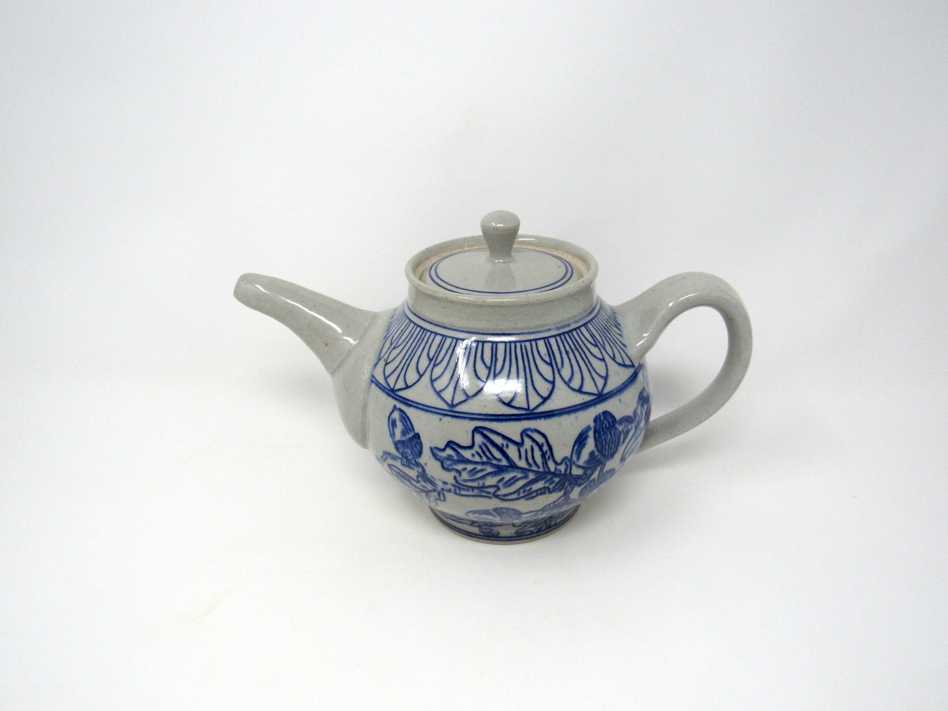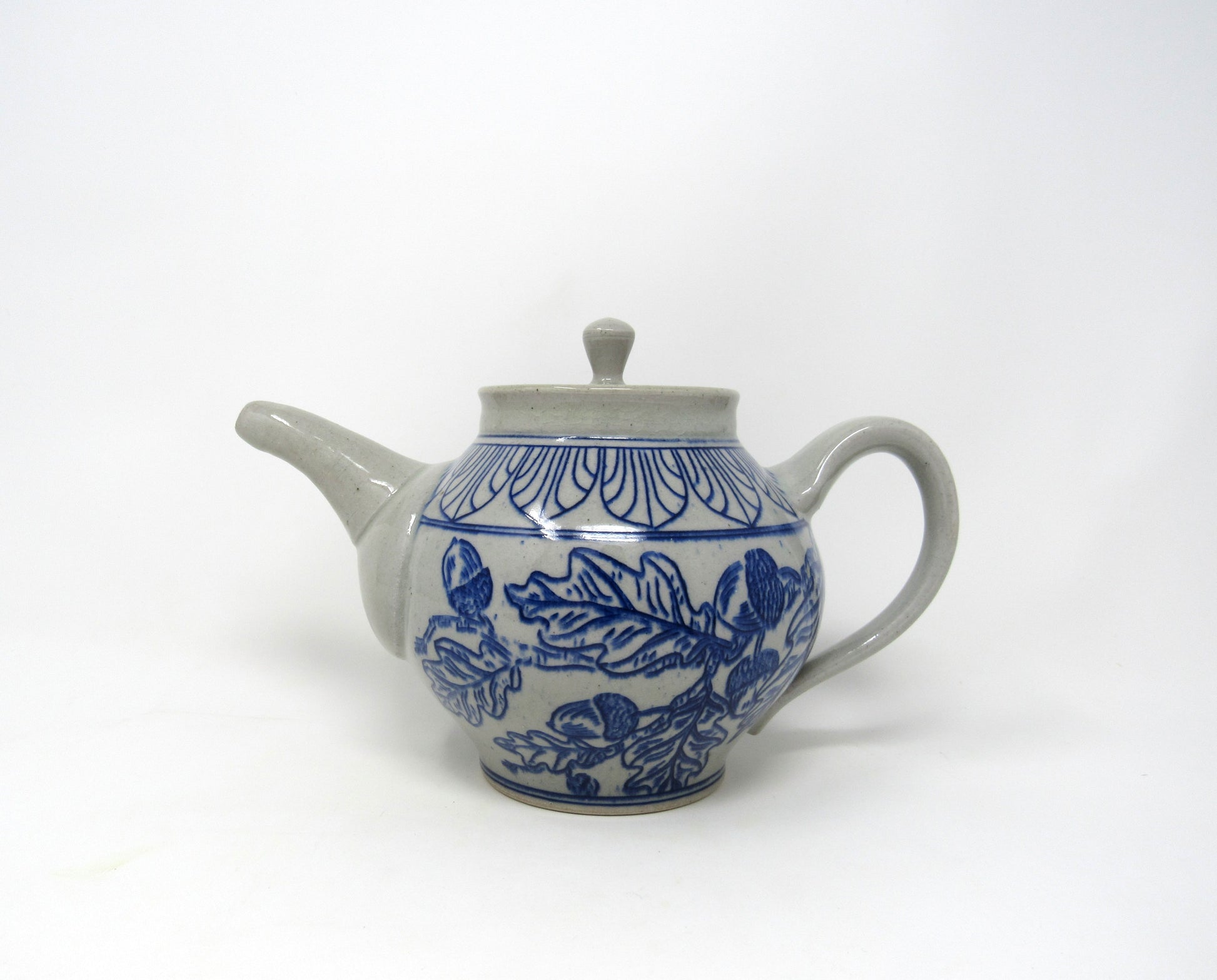 This teapot form was wheel thrown and assembled by hand, then decorated with a hand-carved and inlaid design of Art Deco Arches and an Oak & Acorn Leaf pattern in midnight blue. It is glazed in a food-safe clear glaze.