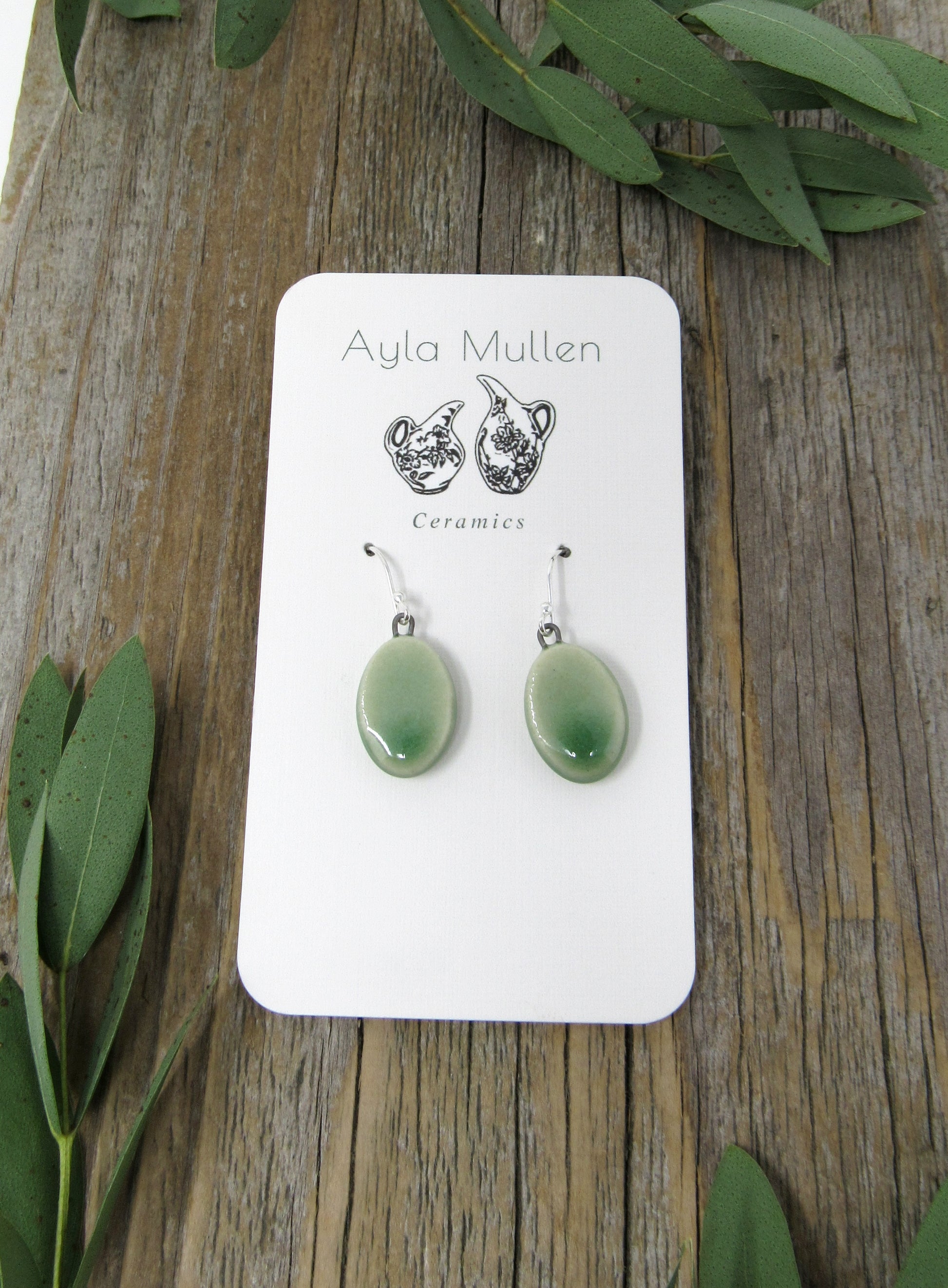 These earrings are handmade out of porcelain clay. Each piece is stamped out of a thin slab of clay, and fired with a light green glaze.