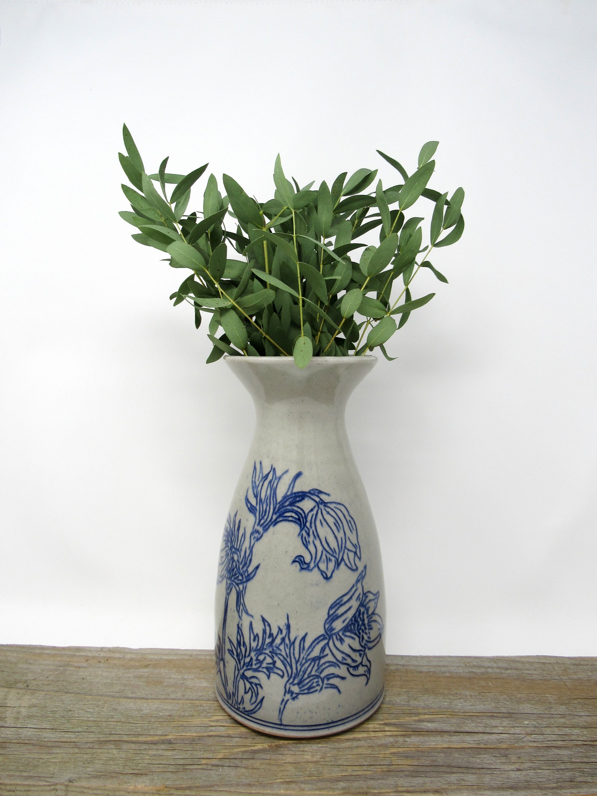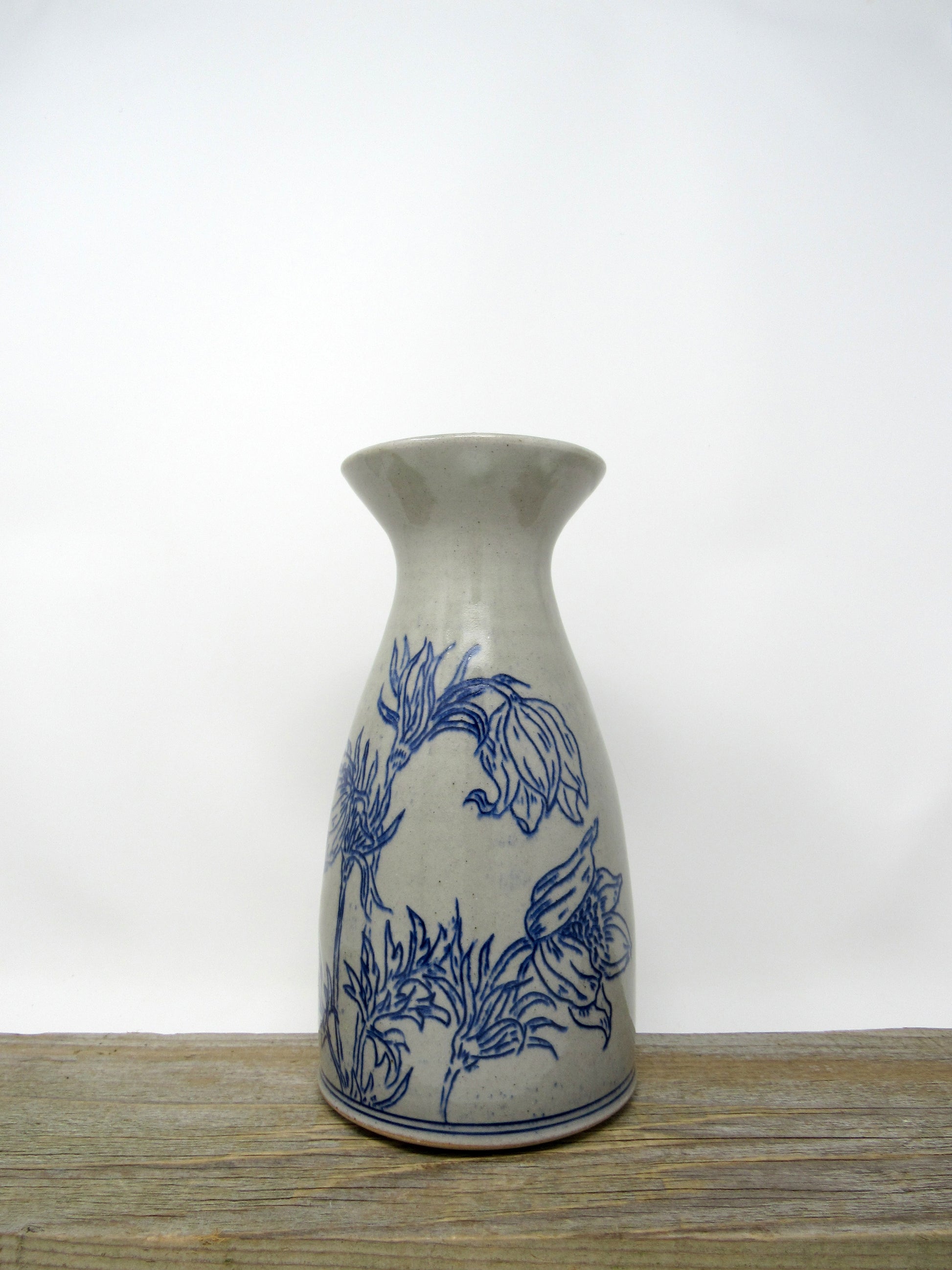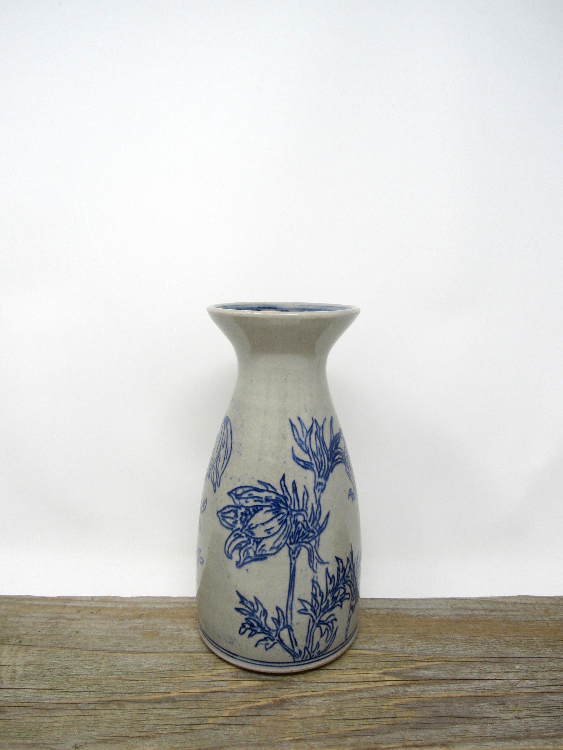 This decanter vase is wheel-thrown, with a hand-carved and inlaid design of alpine pasqueflower in midnight blue. The clear celadon glaze highlights the variegated gray of the clay body.