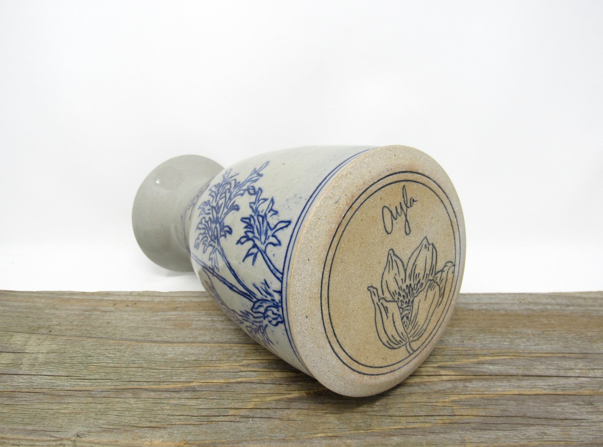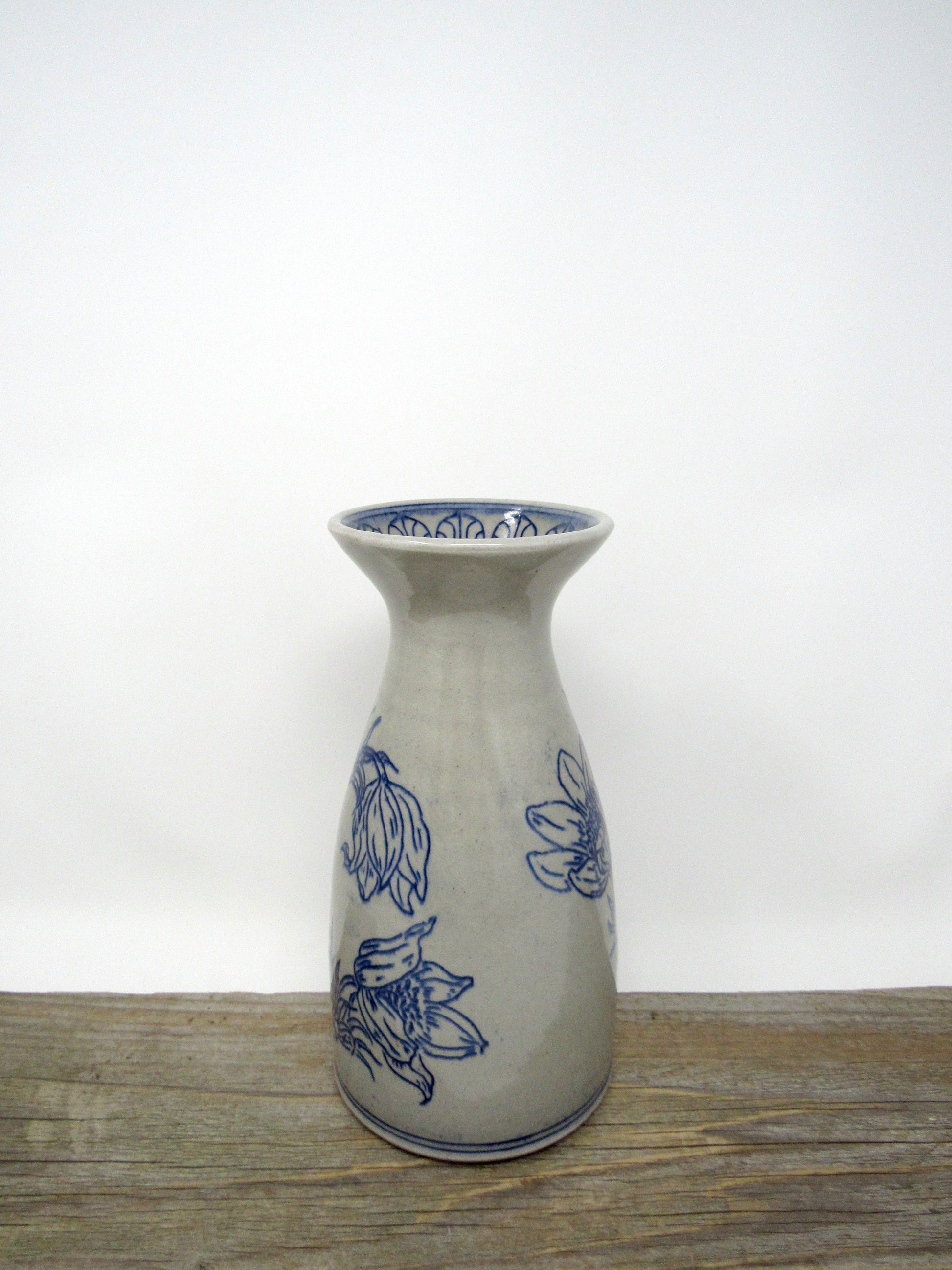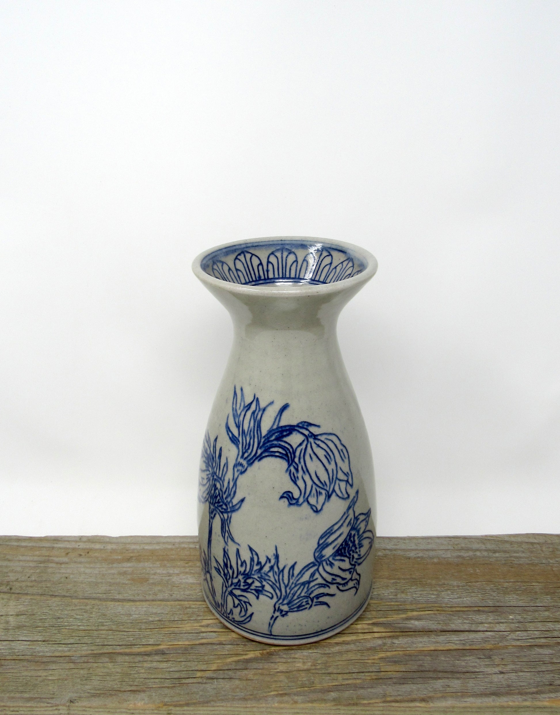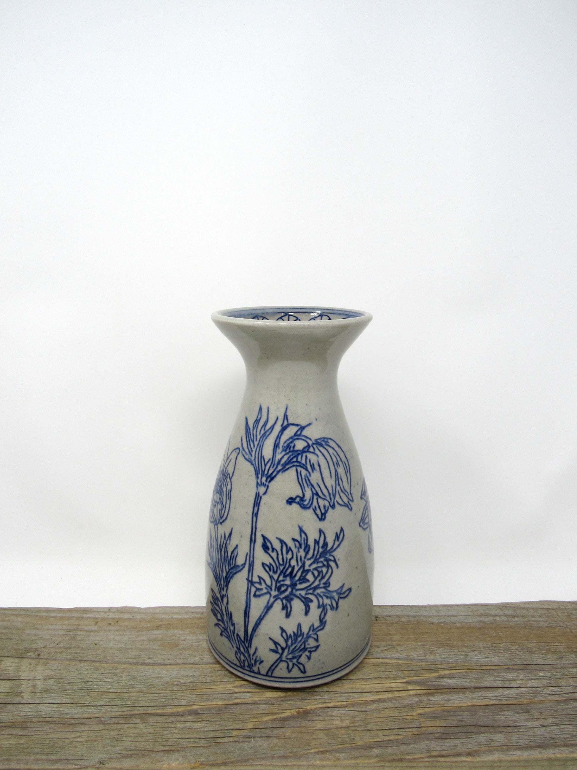 This decanter vase is wheel-thrown, with a hand-carved and inlaid design of alpine pasqueflower in midnight blue. The clear celadon glaze highlights the variegated gray of the clay body.