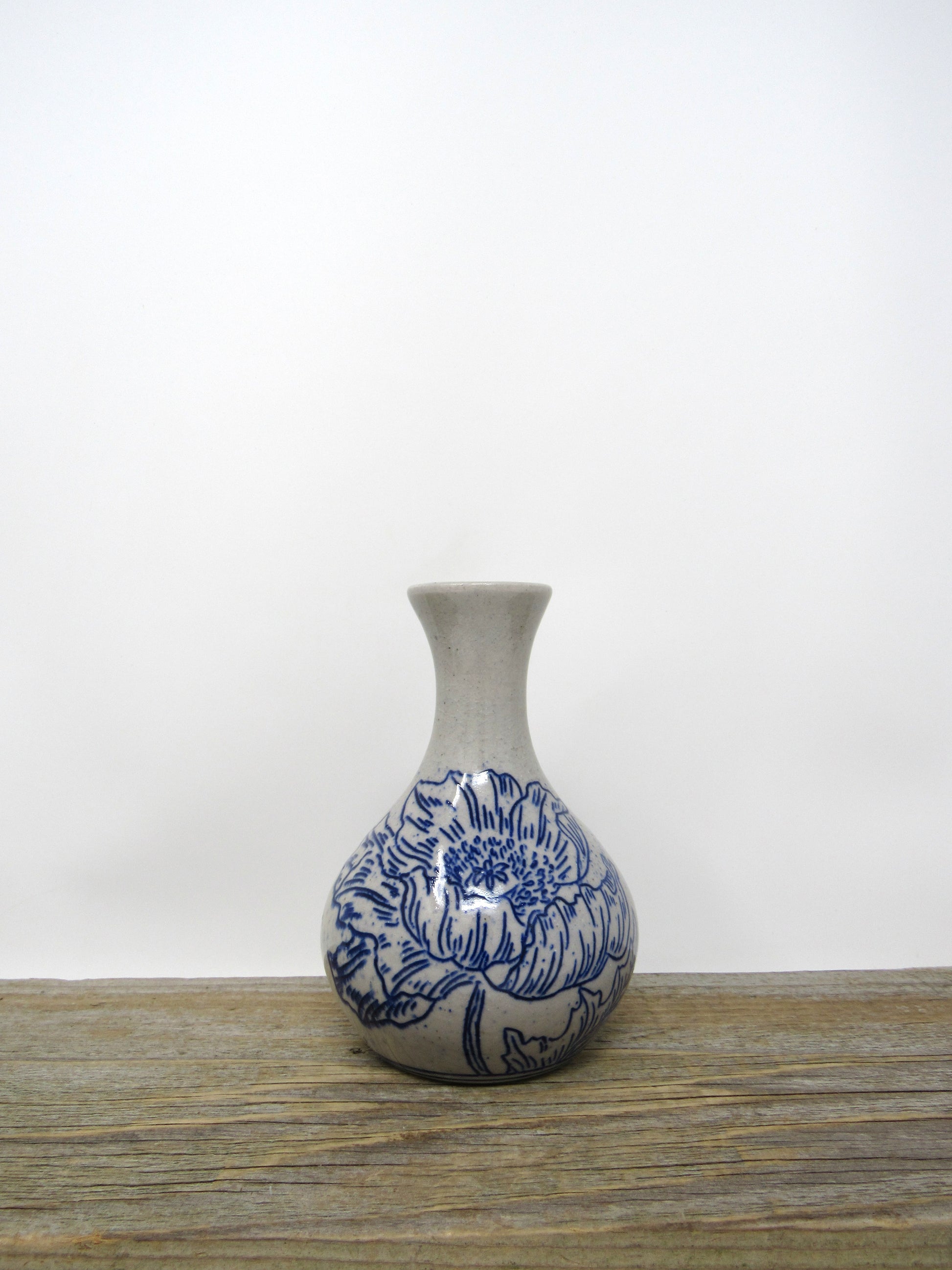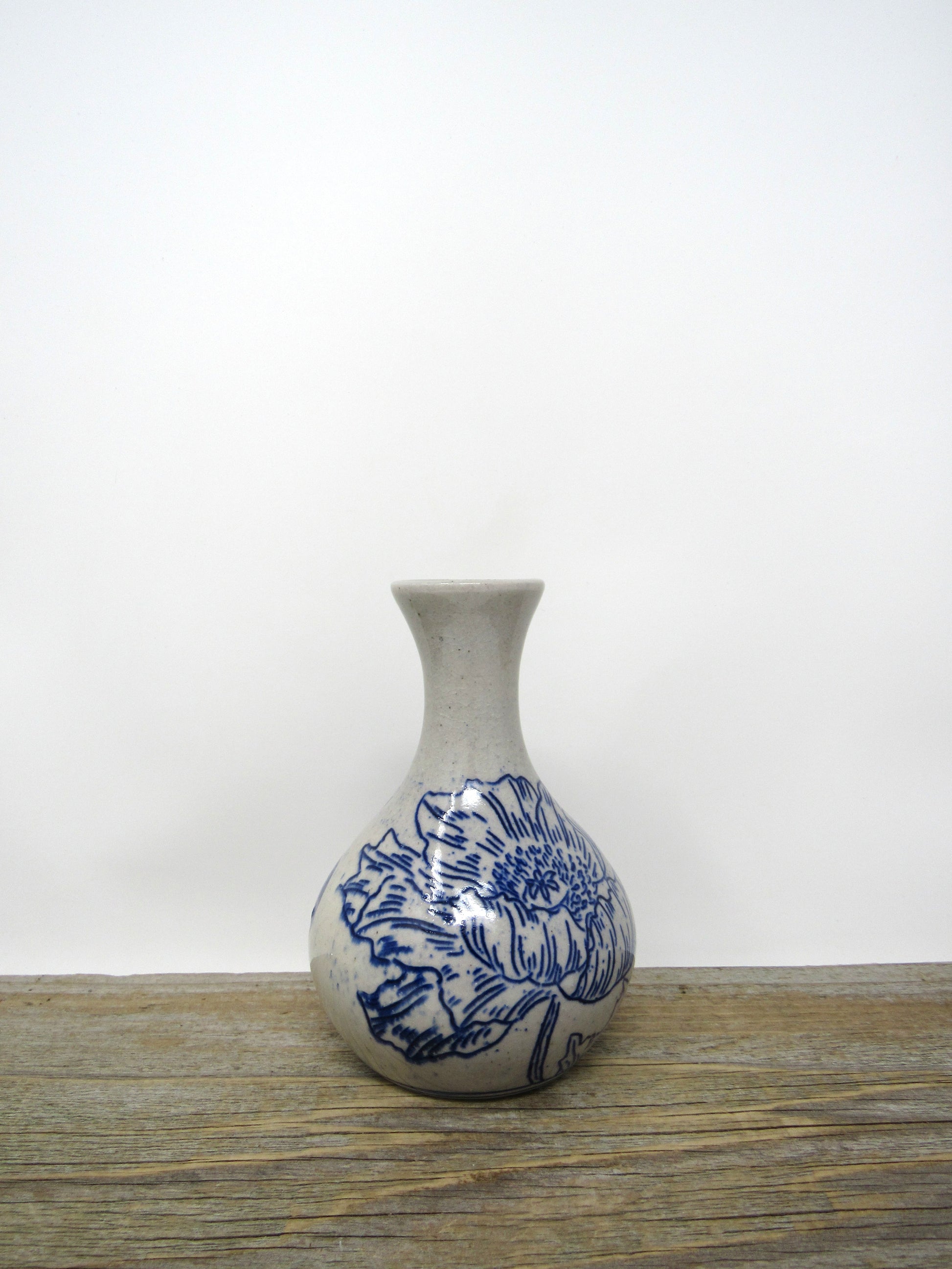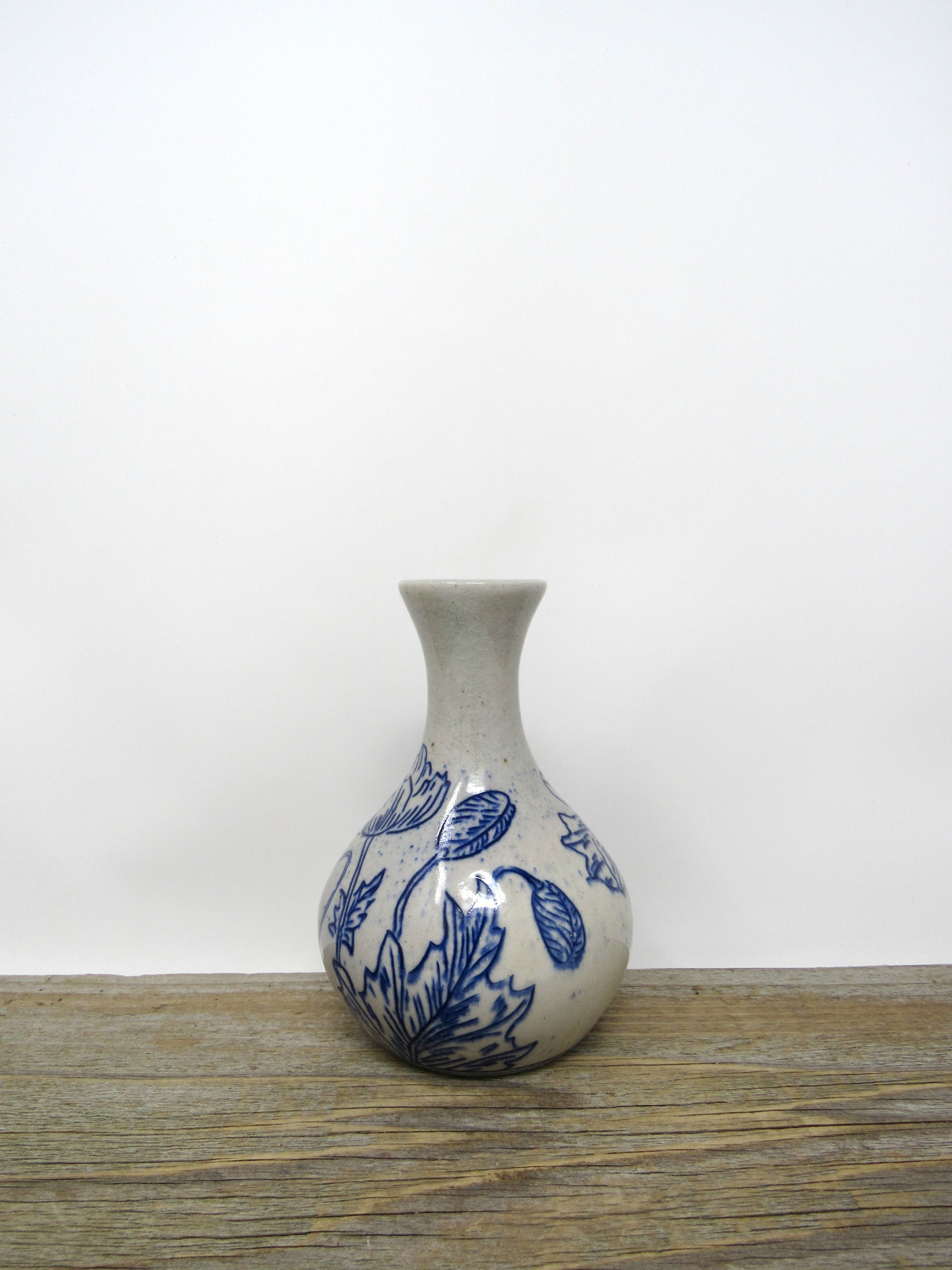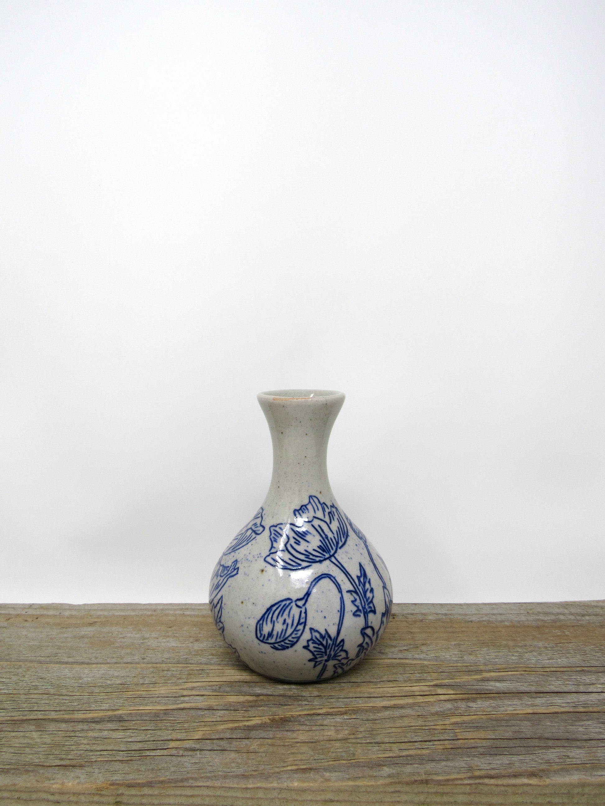 Decorated with a hand carved and inlaid Poppy flower design in blue, it is glazed in a clear celadon glaze.