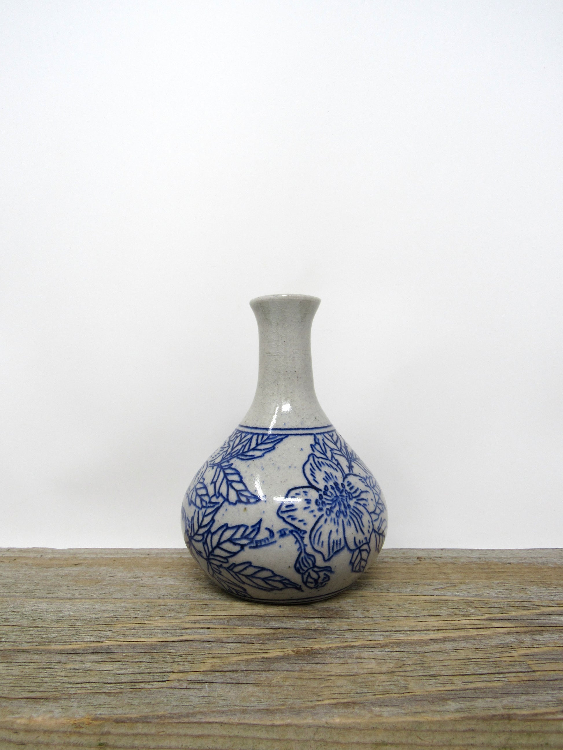 This piece was hand thrown on the wheel with stoneware clay. The decoration was hand-carved and inlaid with color before the piece was fired. I mix all of my own glazes and fire in a gas reduction kiln to 2400 degrees F.