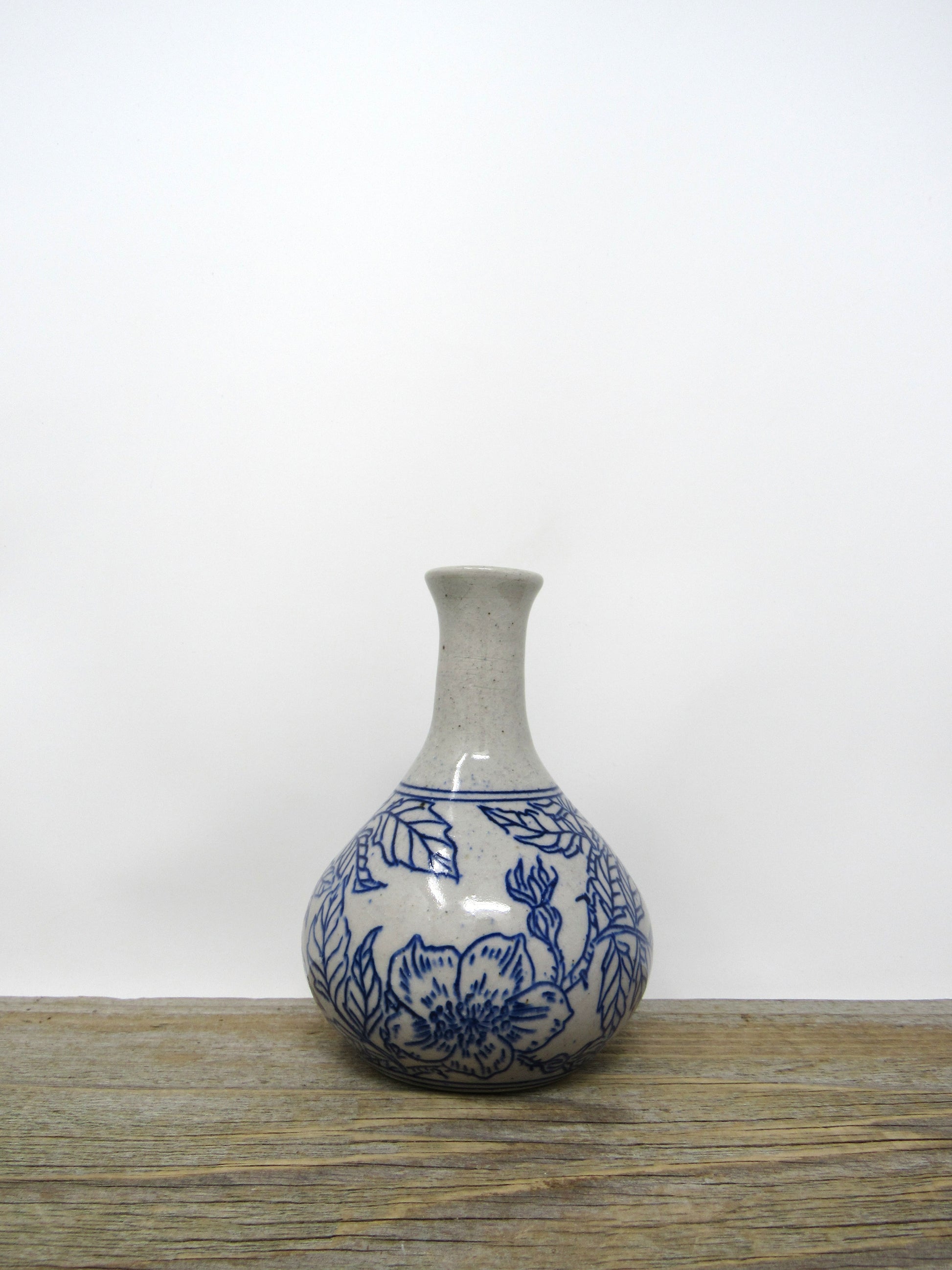 Decorated with a hand carved and inlaid Wild Rose design in blue, it is glazed in a clear celadon glaze.