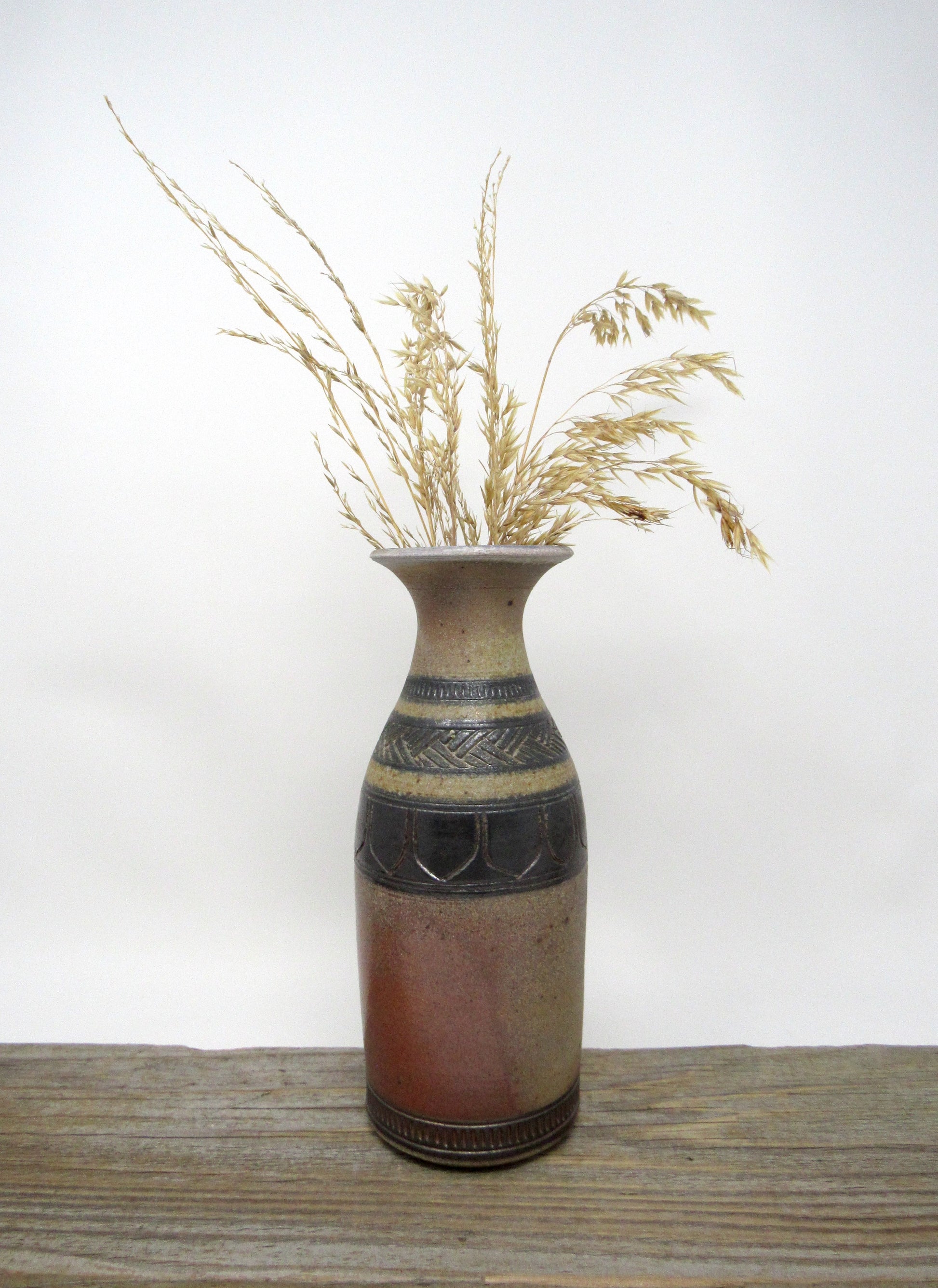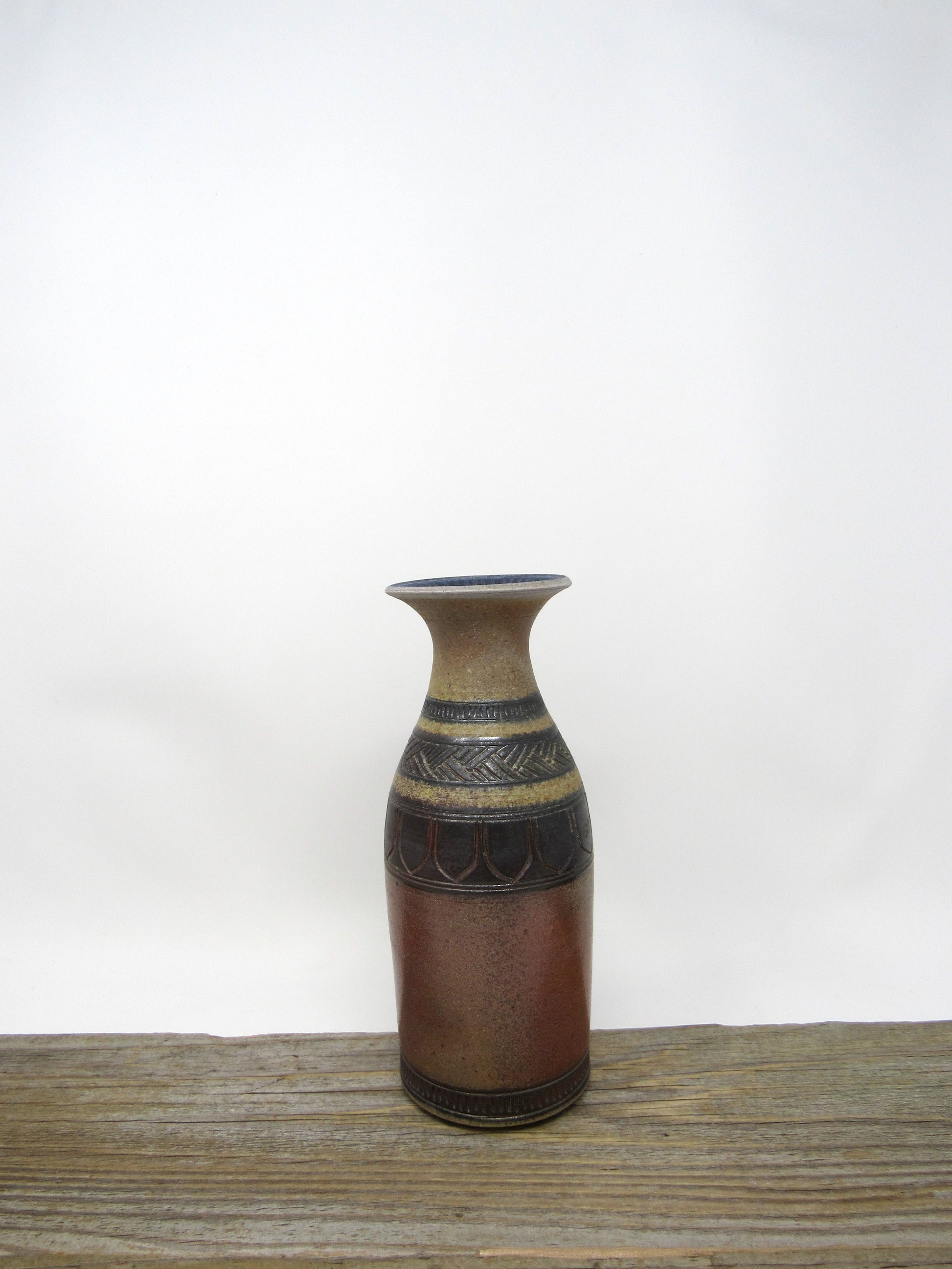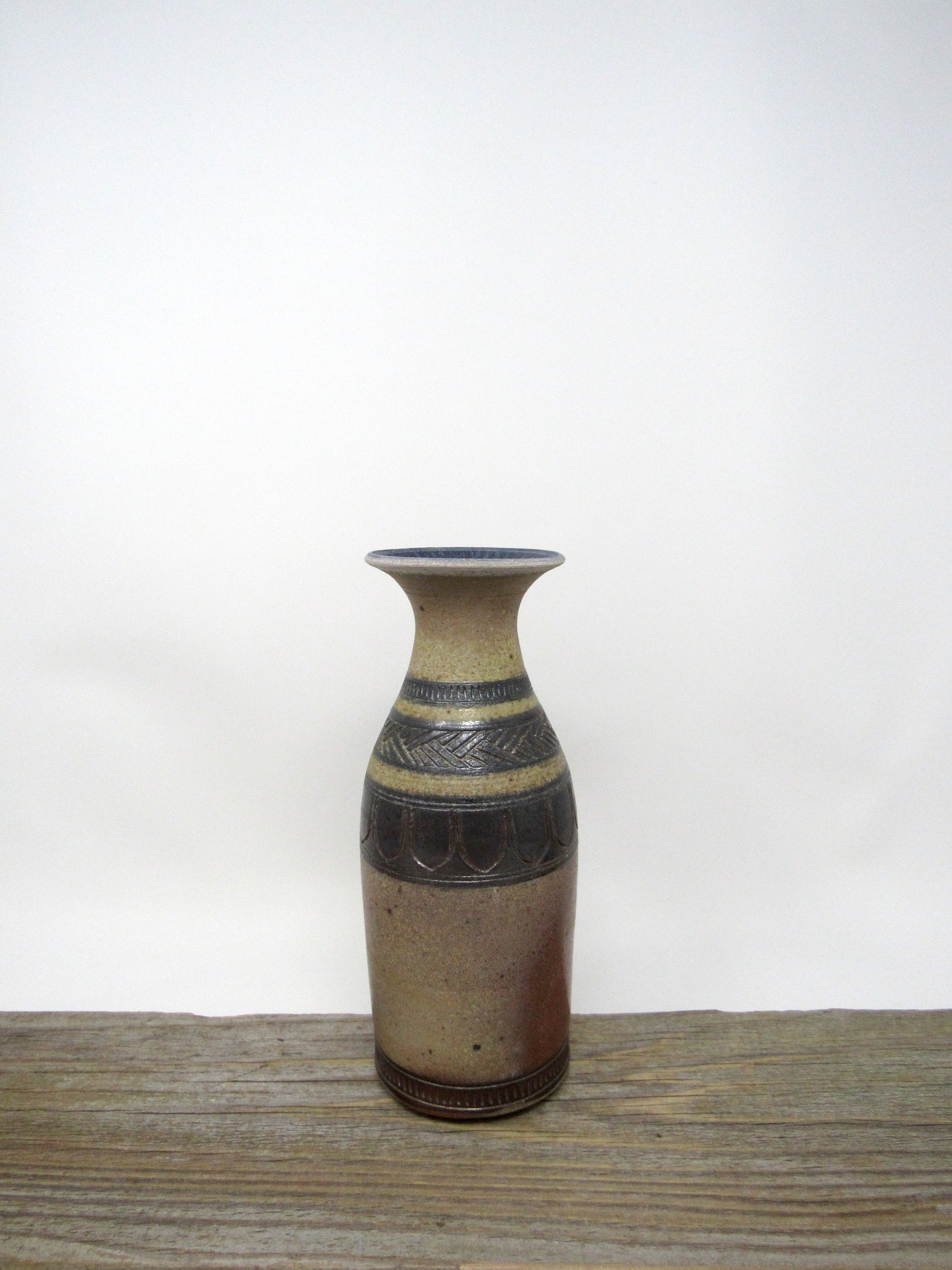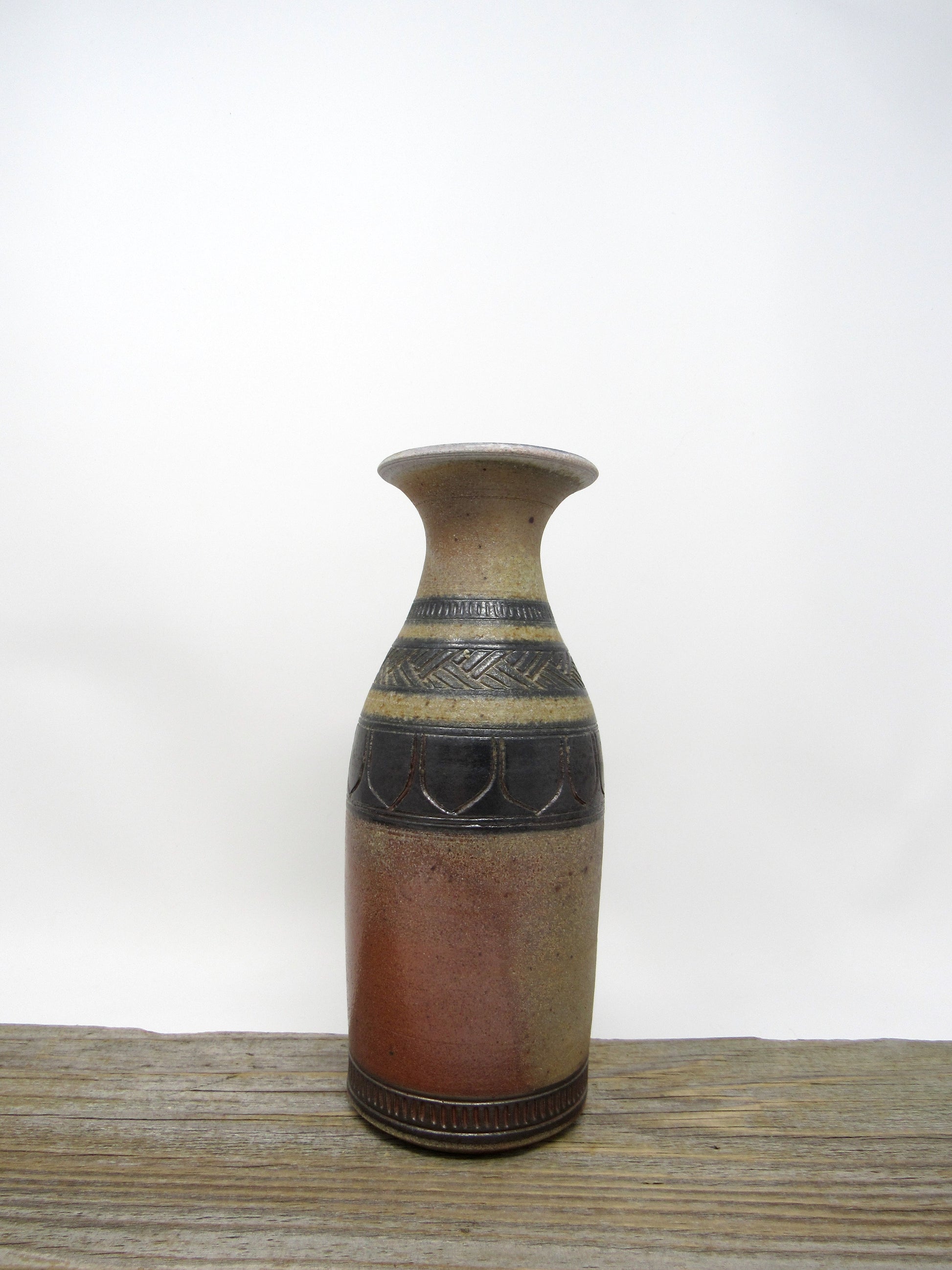 This vase is wheel thrown, and decorated with a hand carved geometric sgraffito pattern. It is glazed with melted wood ash from 40 hours of firing in a wood kiln.