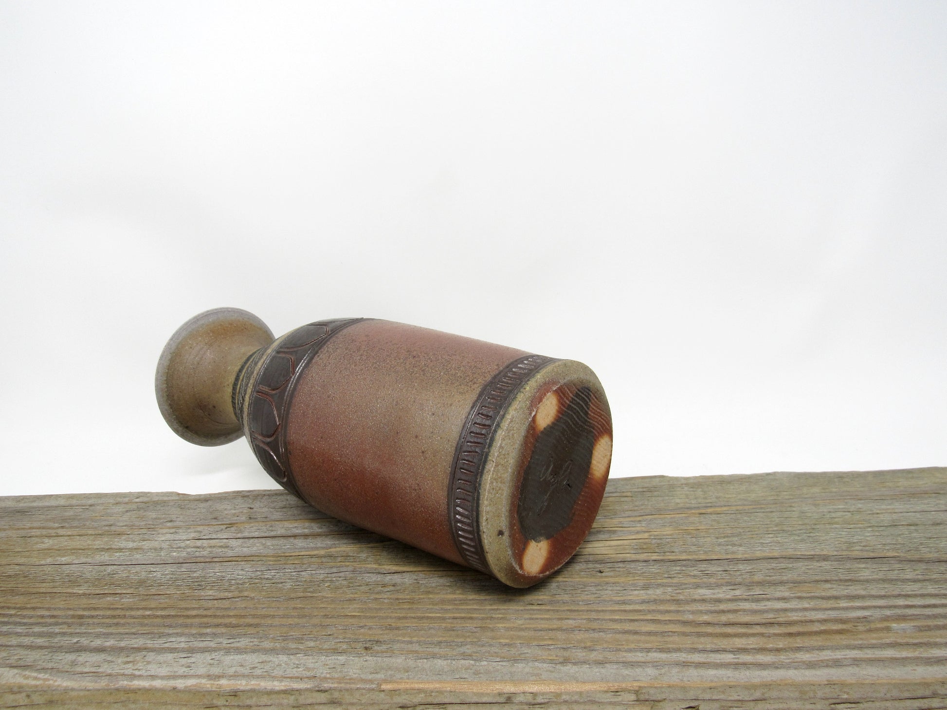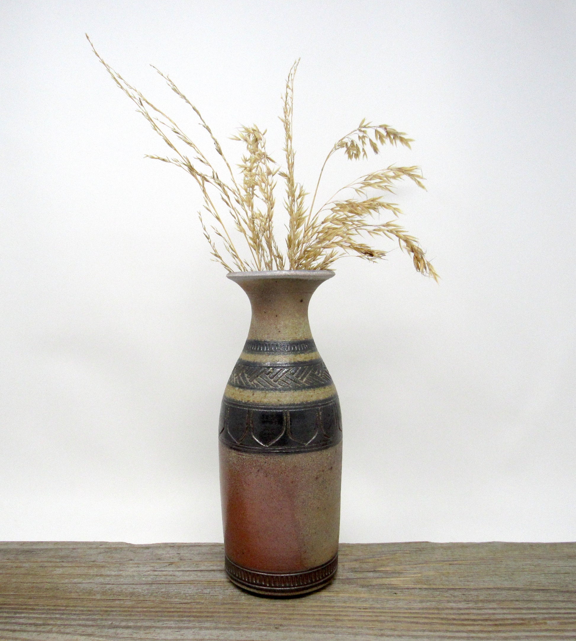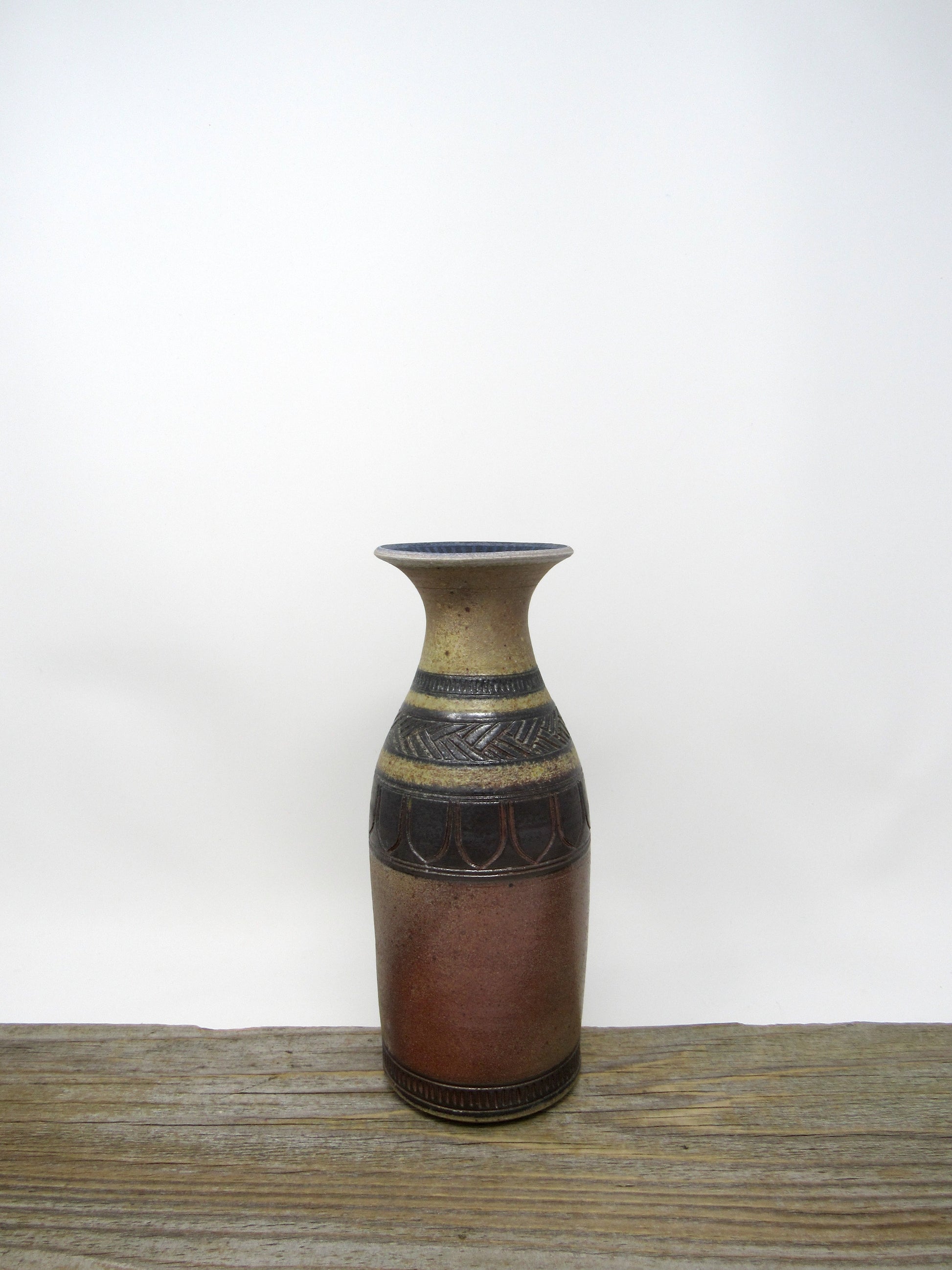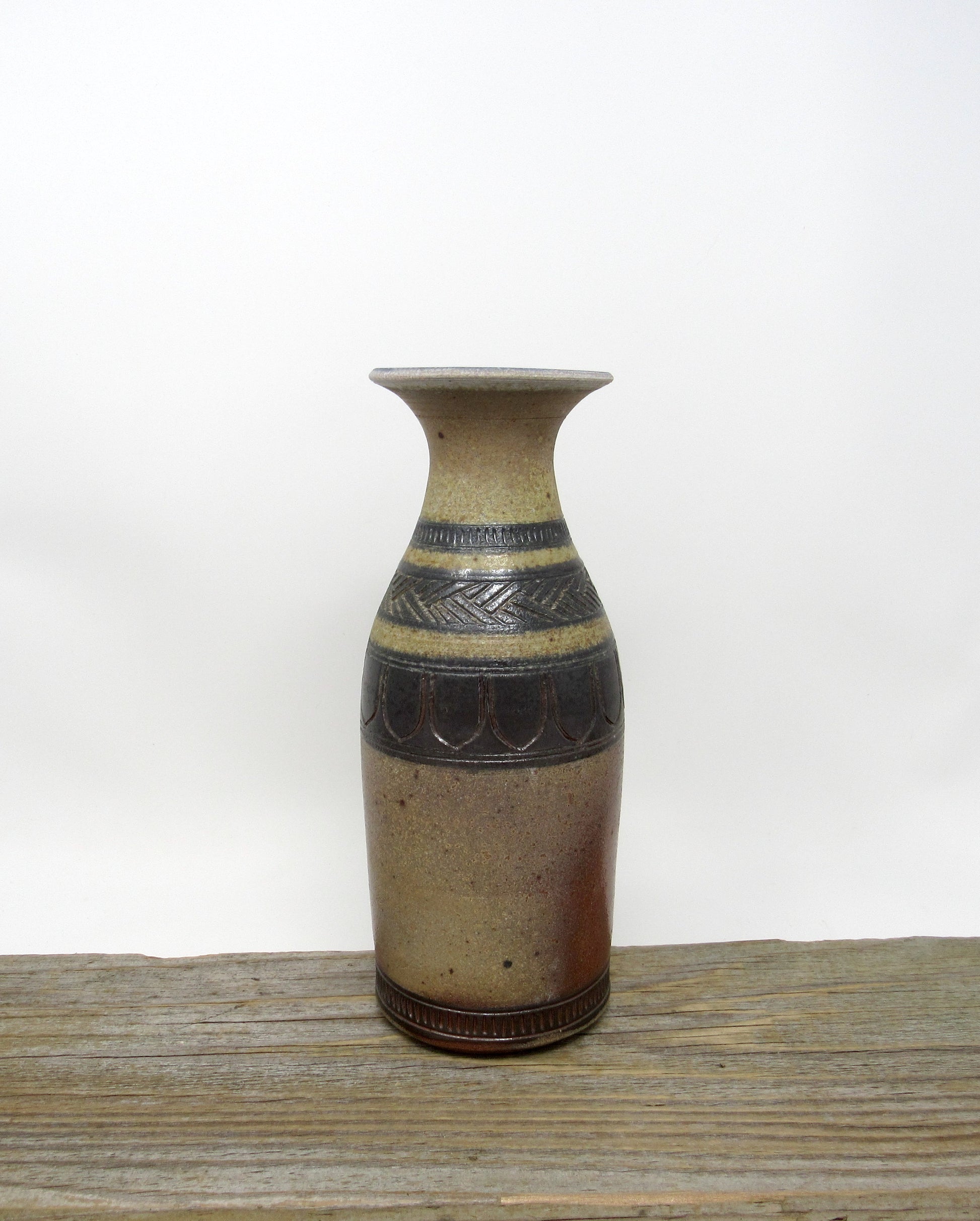 This vase is wheel thrown, and decorated with a hand carved geometric sgraffito pattern. It is glazed with melted wood ash from 40 hours of firing in a wood kiln.
