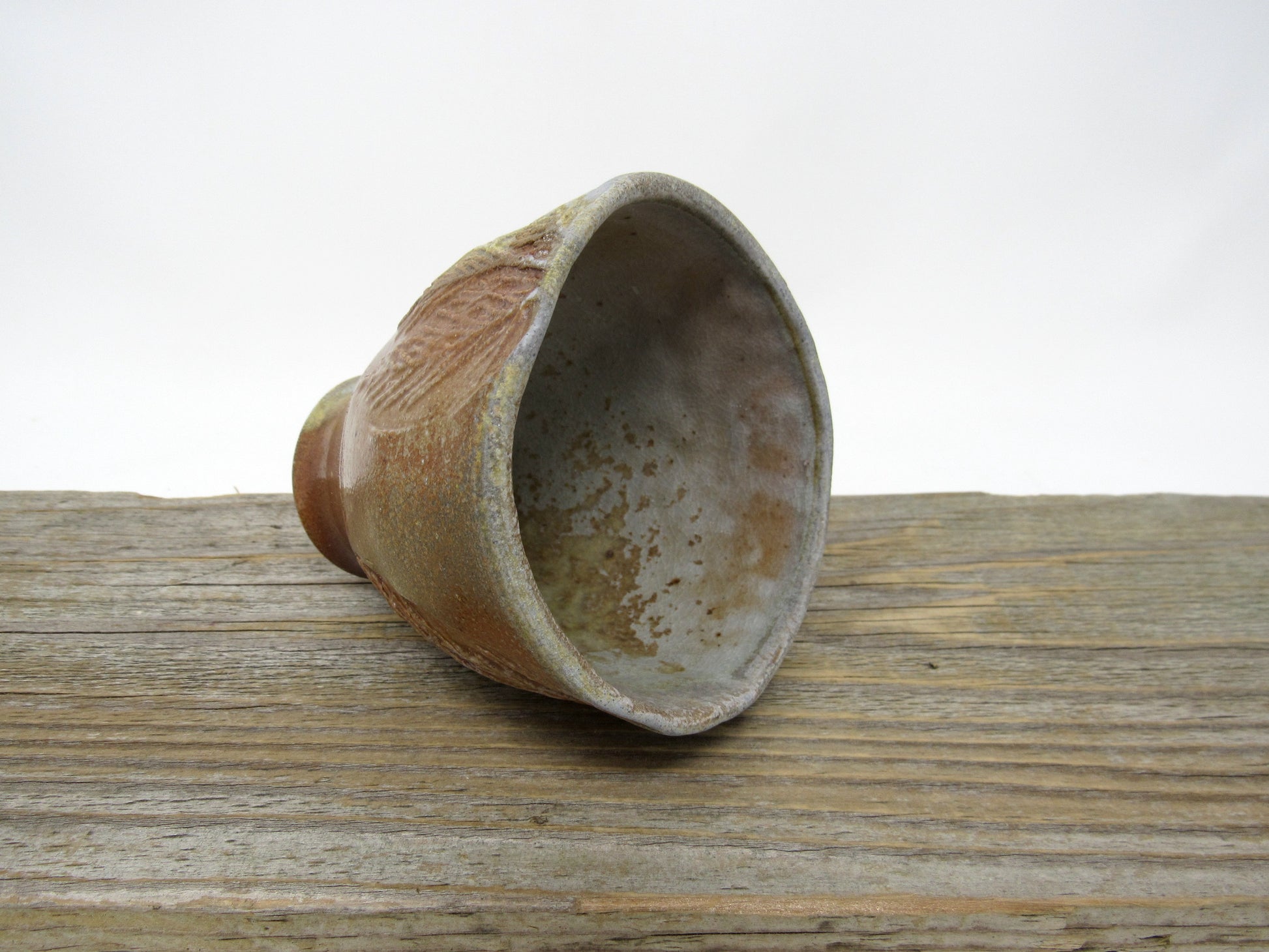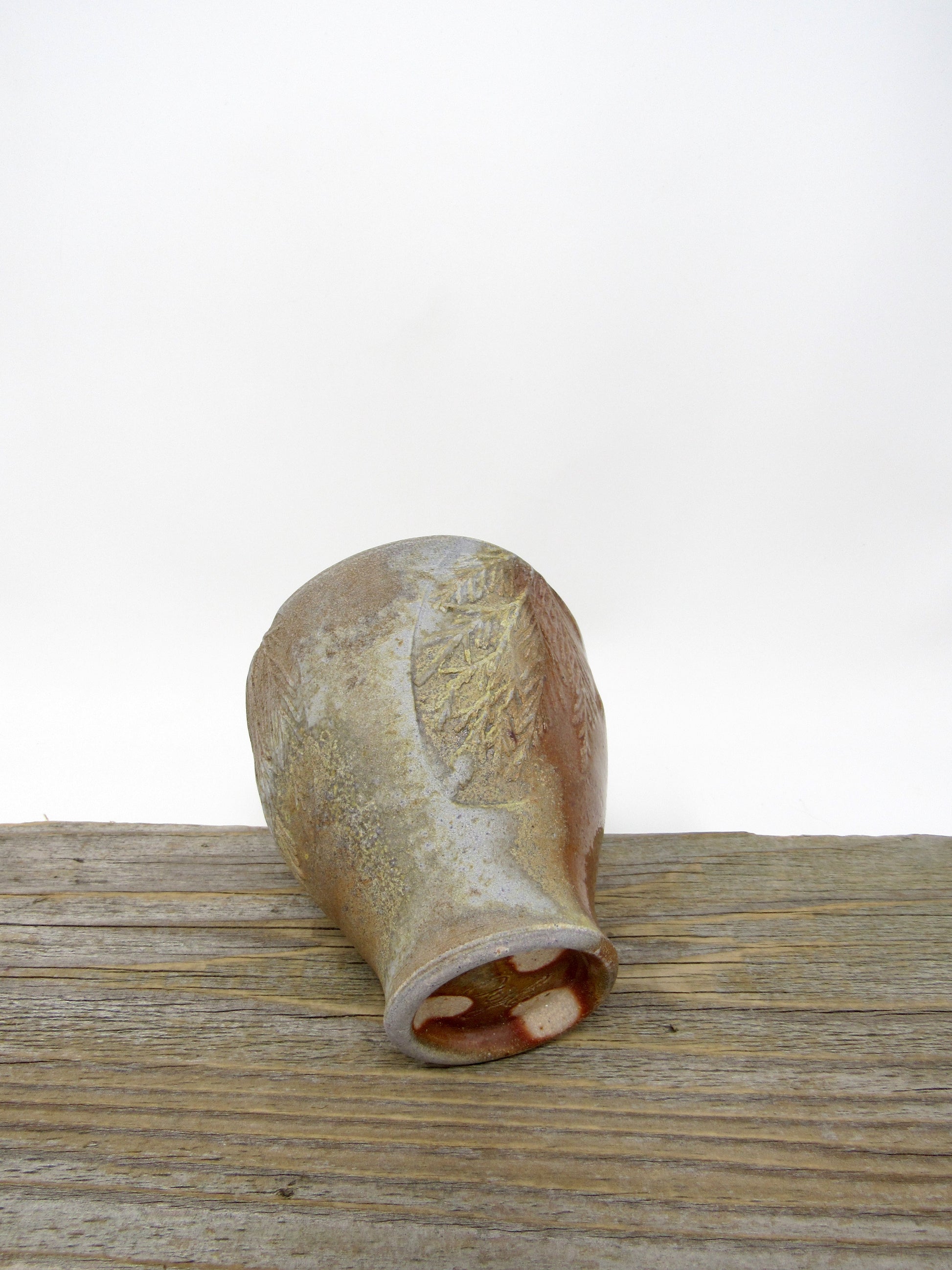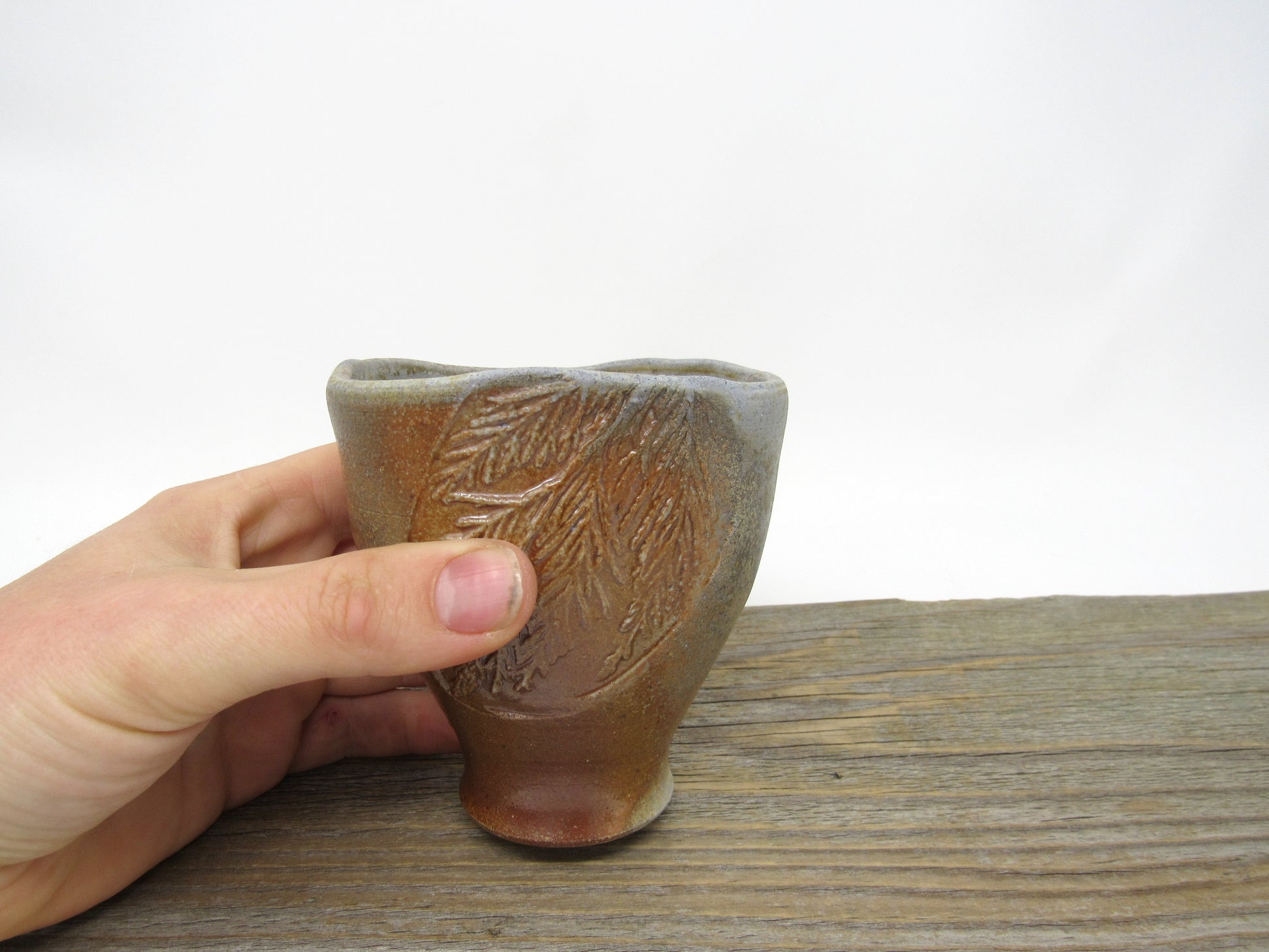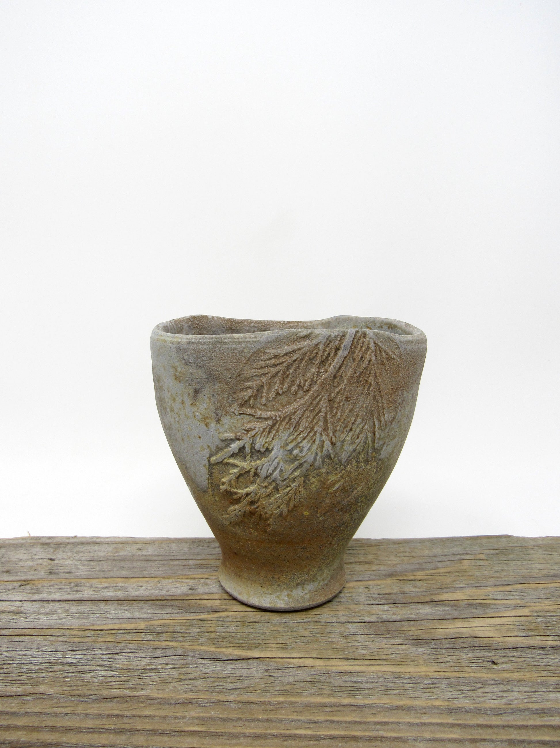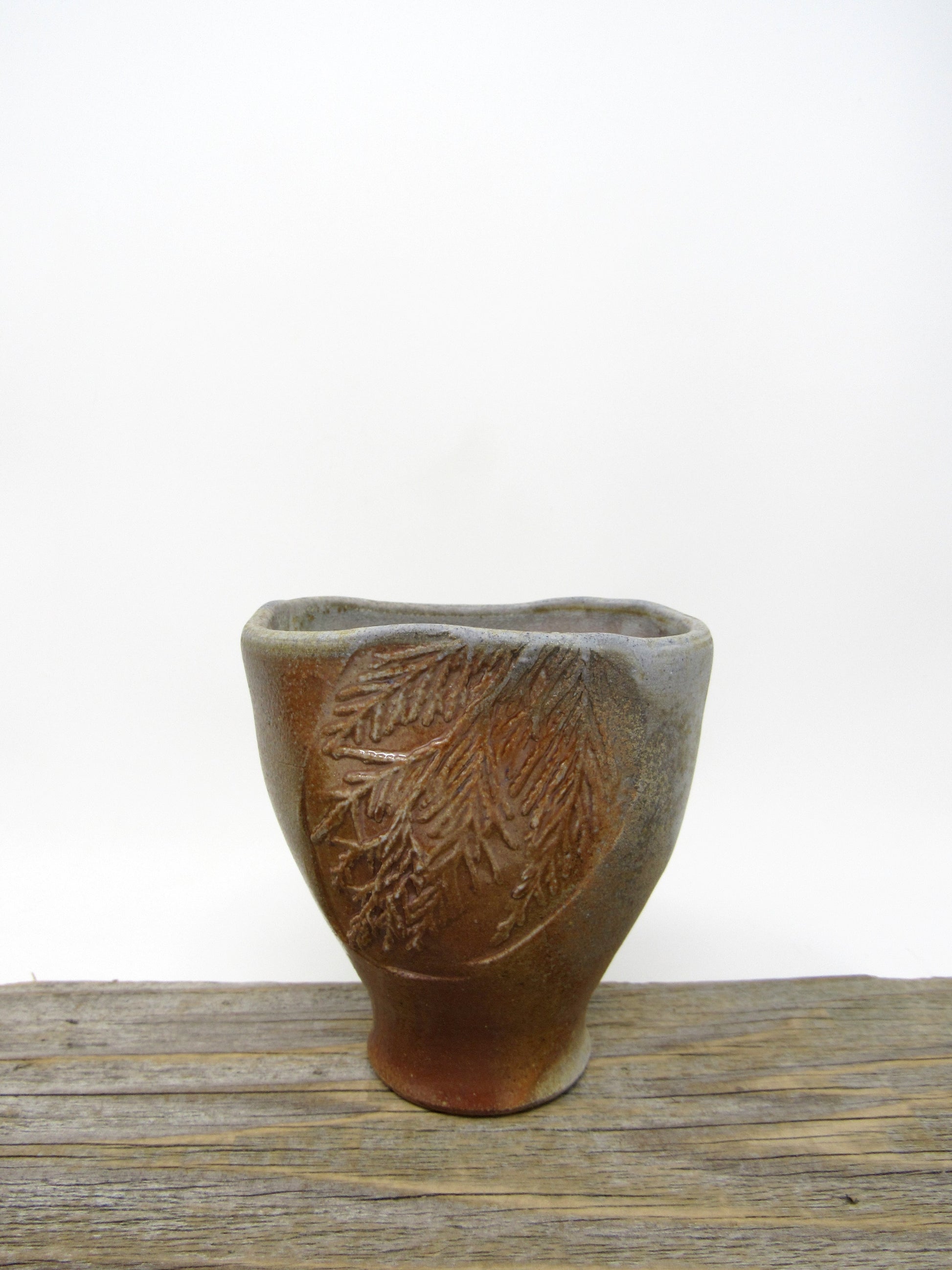 This wine cup was hand thrown on the potter's wheel out of stoneware clay. Decorated with a stamped cedar branch design, and glazed with melted wood ash after 40 hours of firing in a wood kiln.
